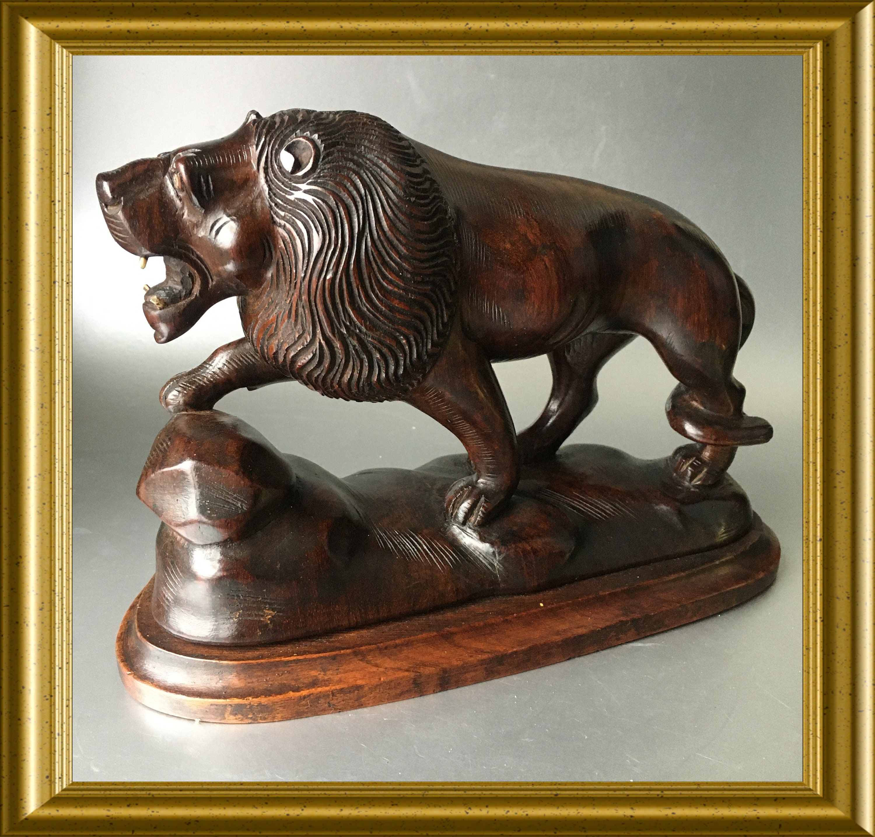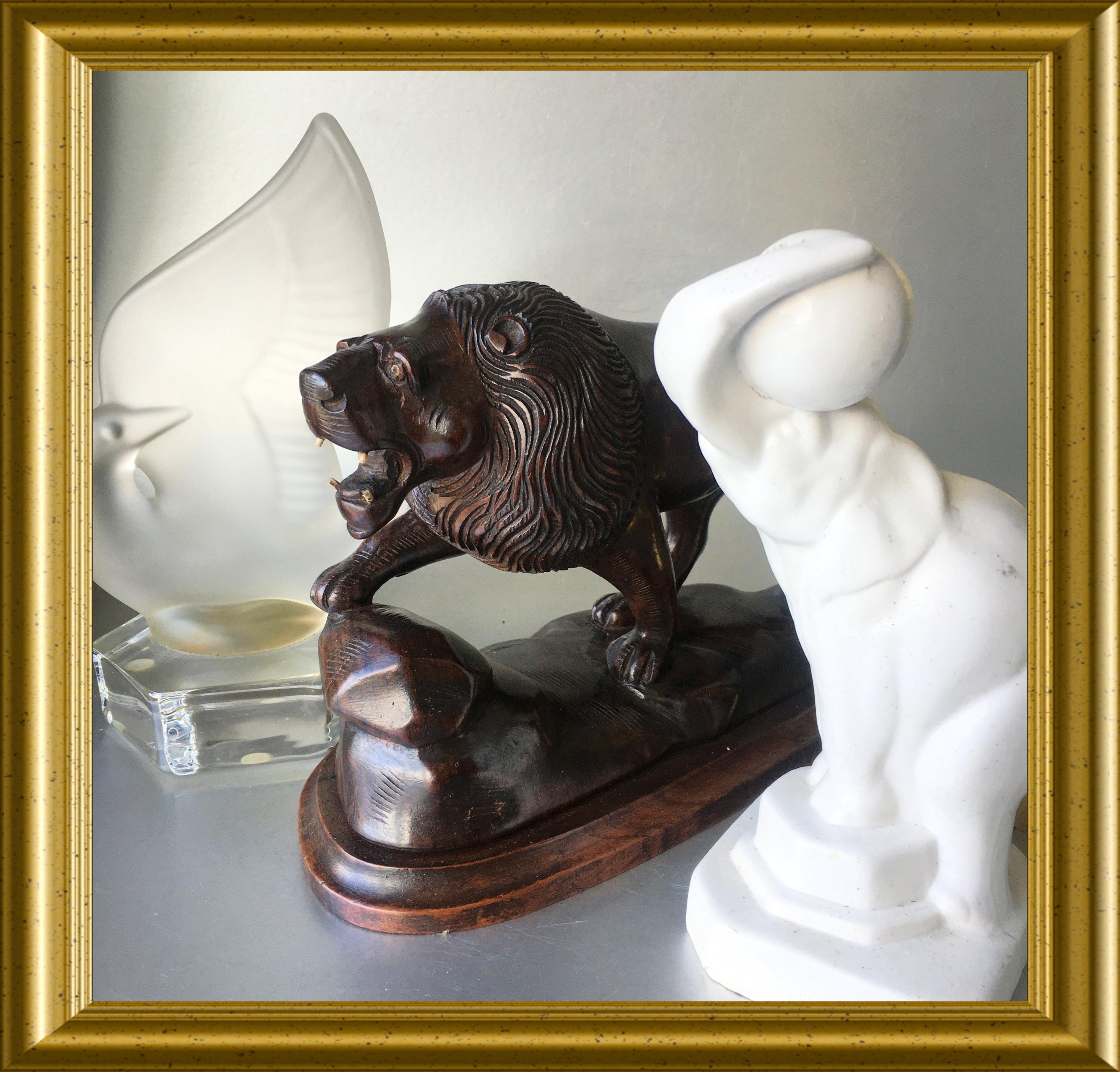 Art deco wood carved sculpture: wooden lion.