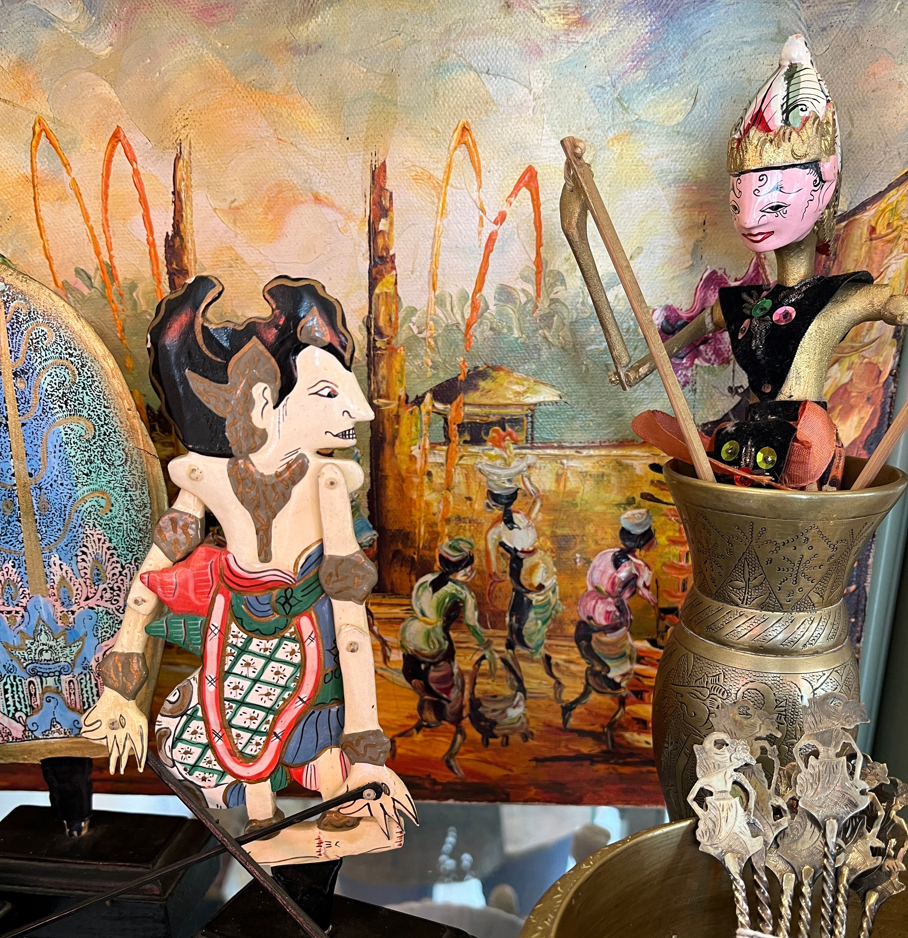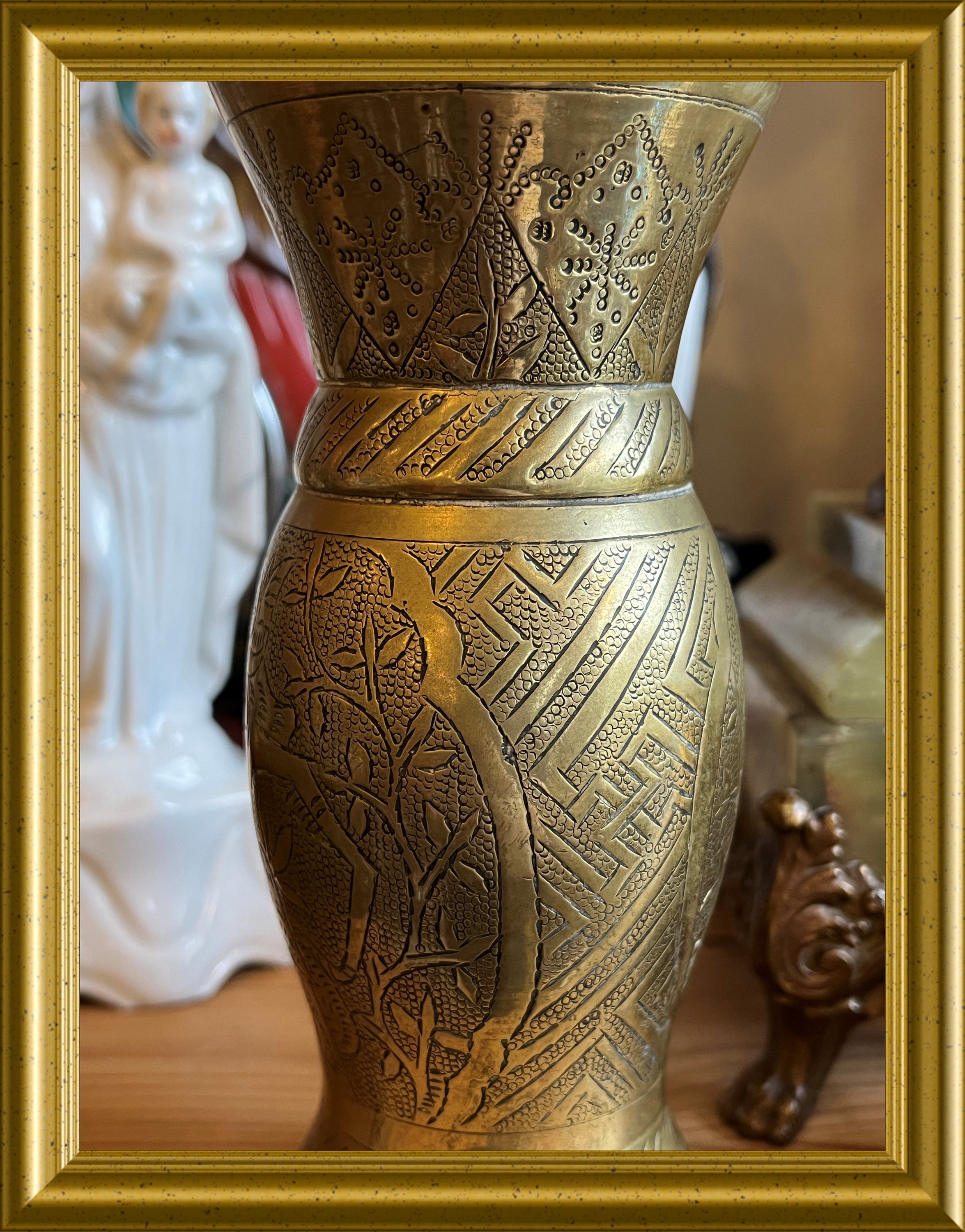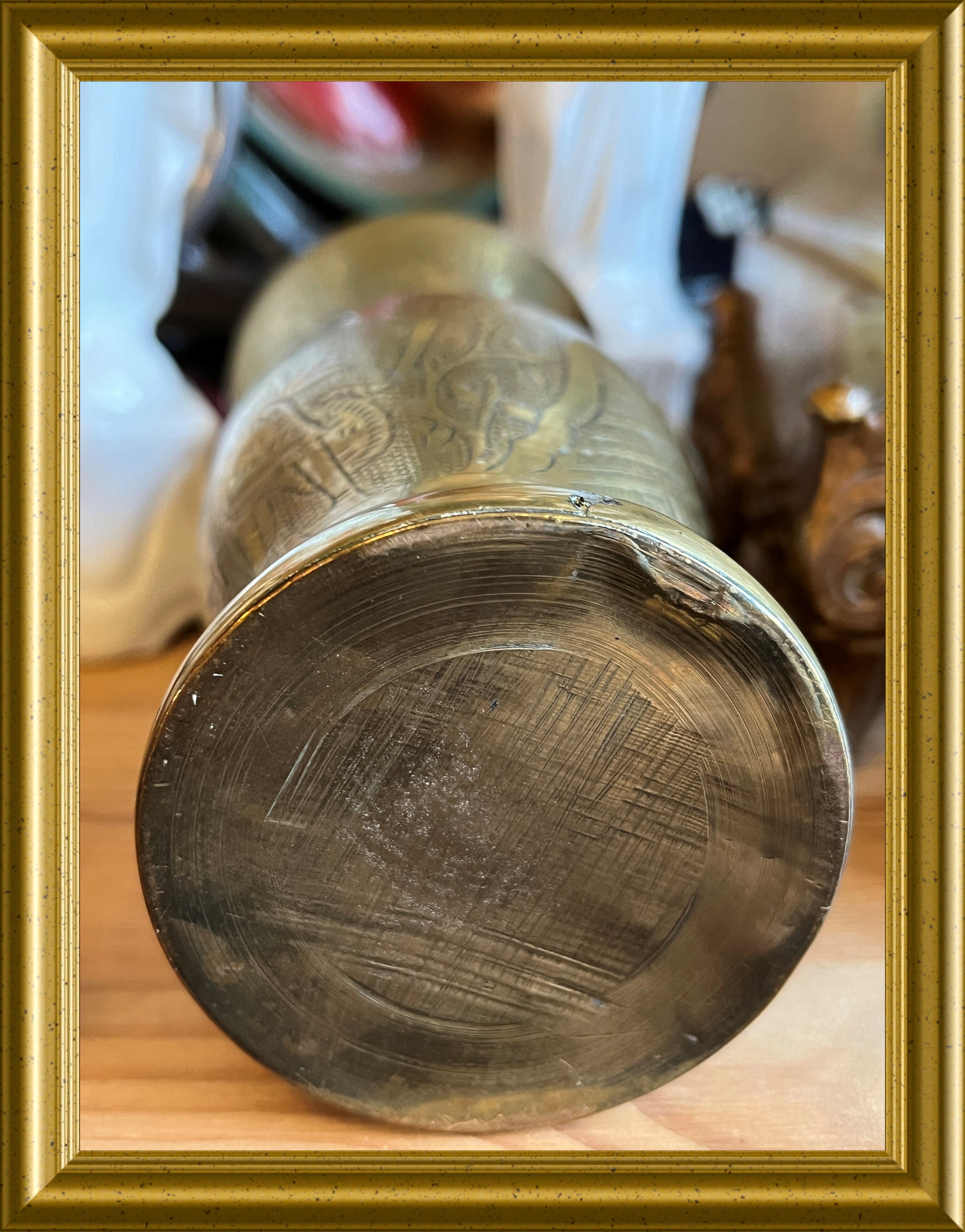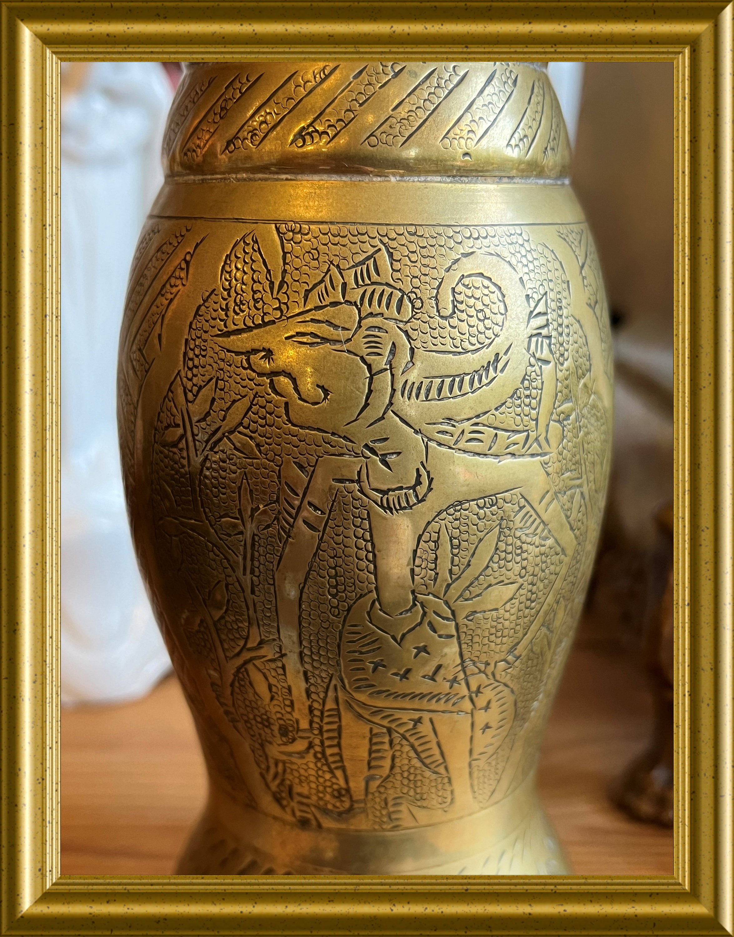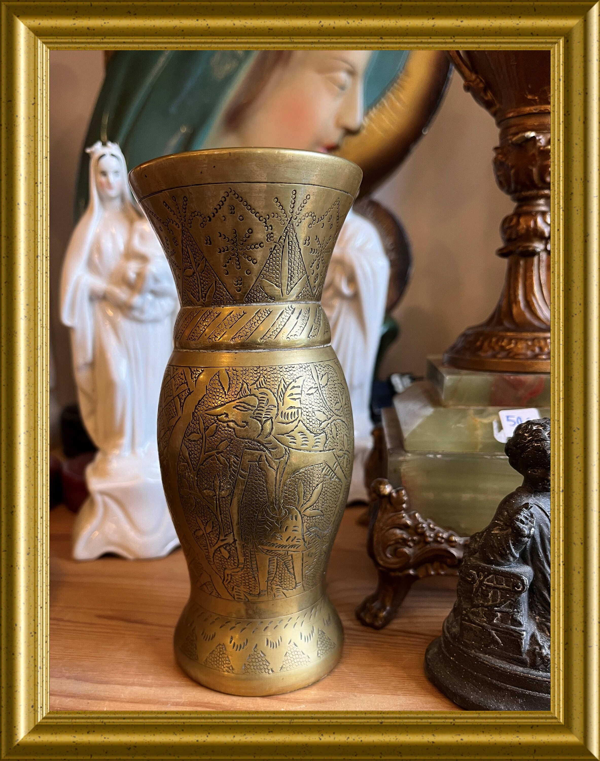 Vintage small Asian heavy brass wayang vase, Indonesian.
