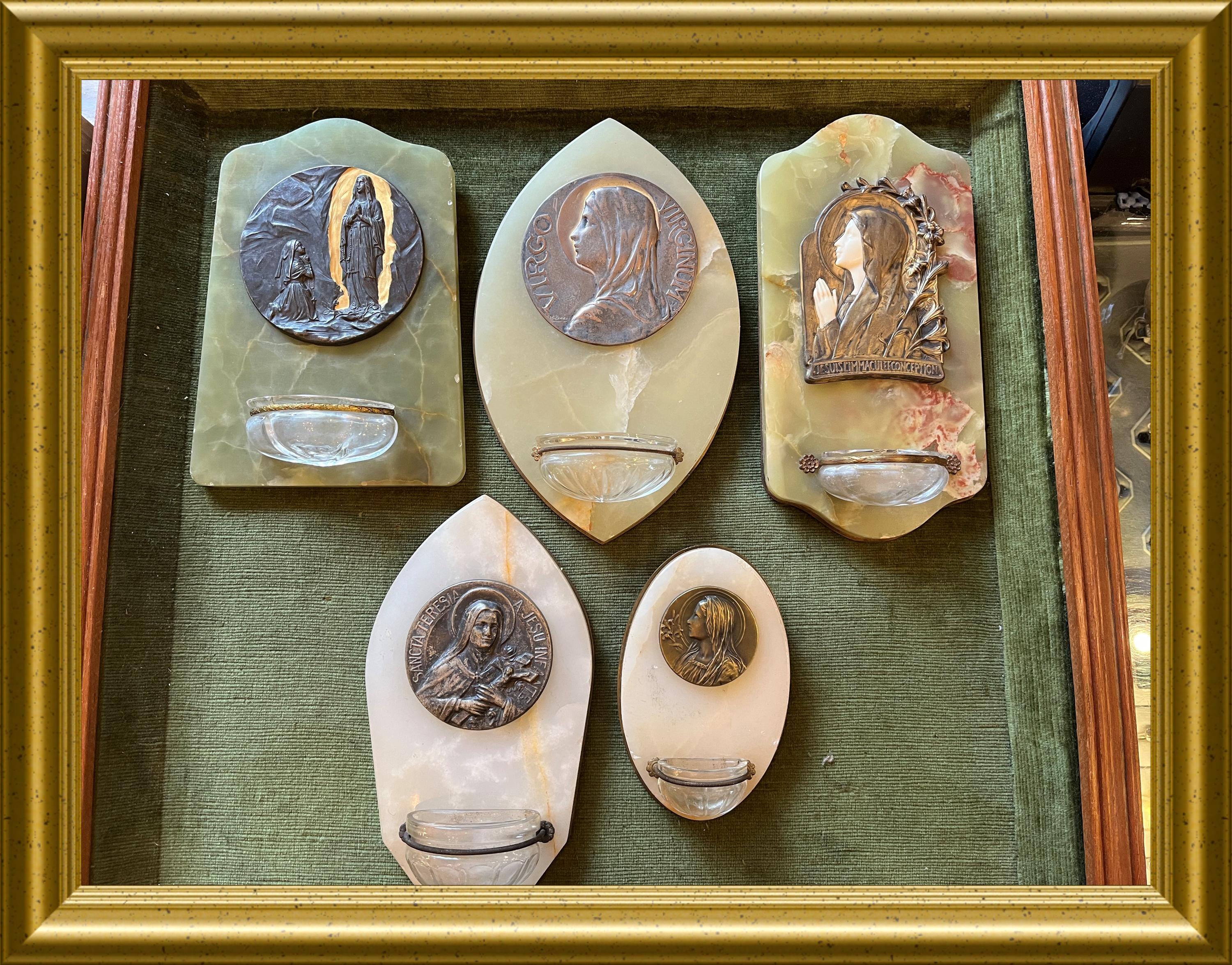 Antique holy water font: onyx, Holy Mary, Lourdes