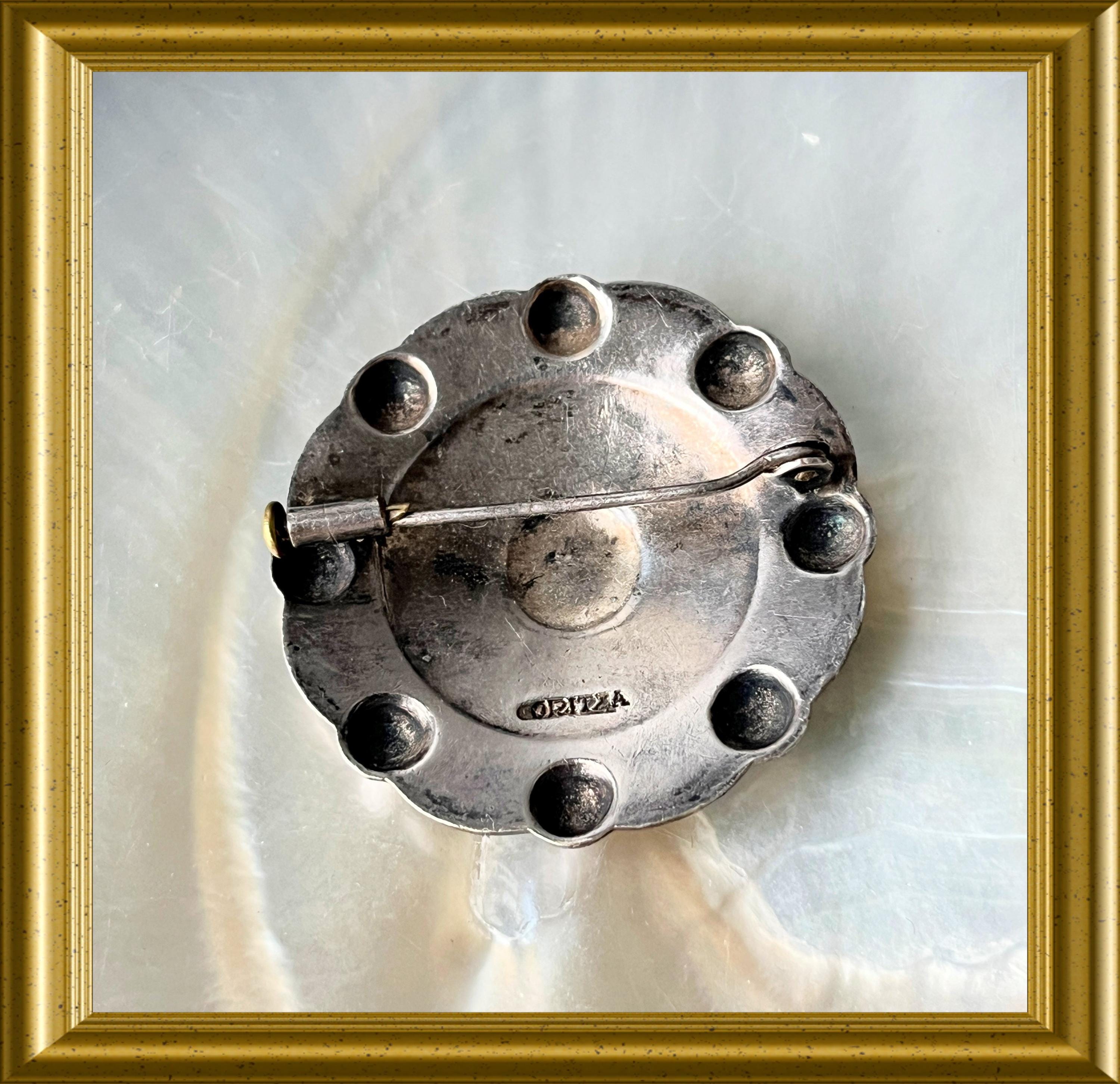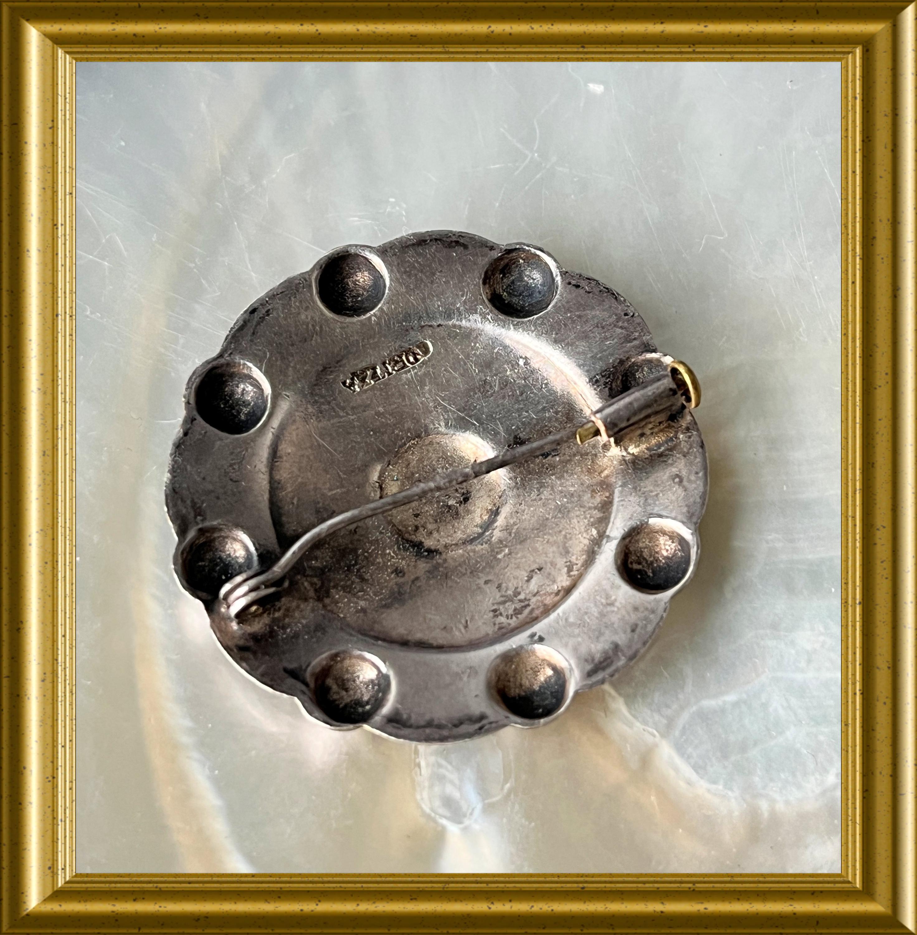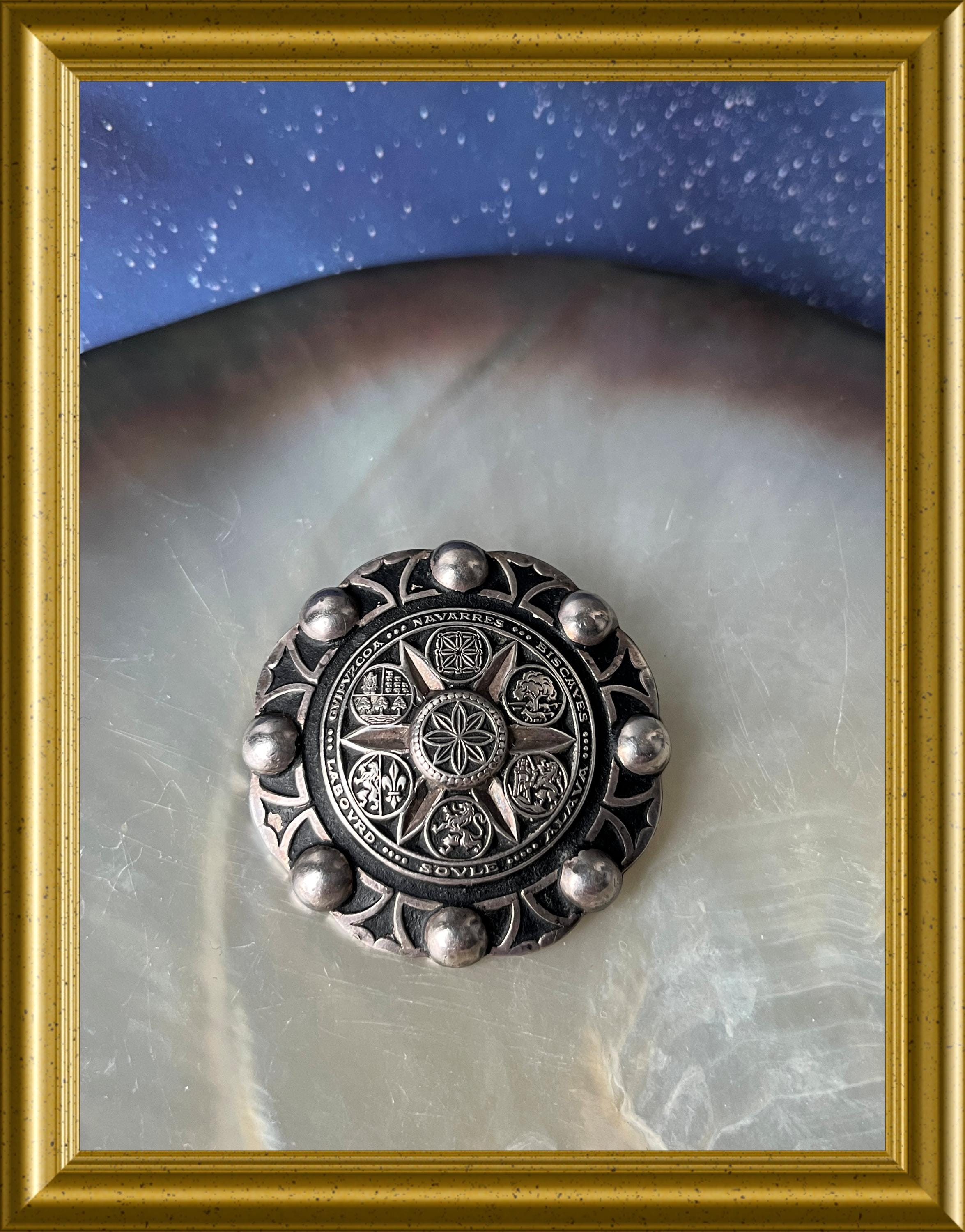This vintage brooch features the Zazpiak Bat coat of arms, symbolizing the unity of the seven historical Basque provinces: Navarre, Biscay, Álava, Soule, Labourd, Gipuzkoa, and Lower Navarre.