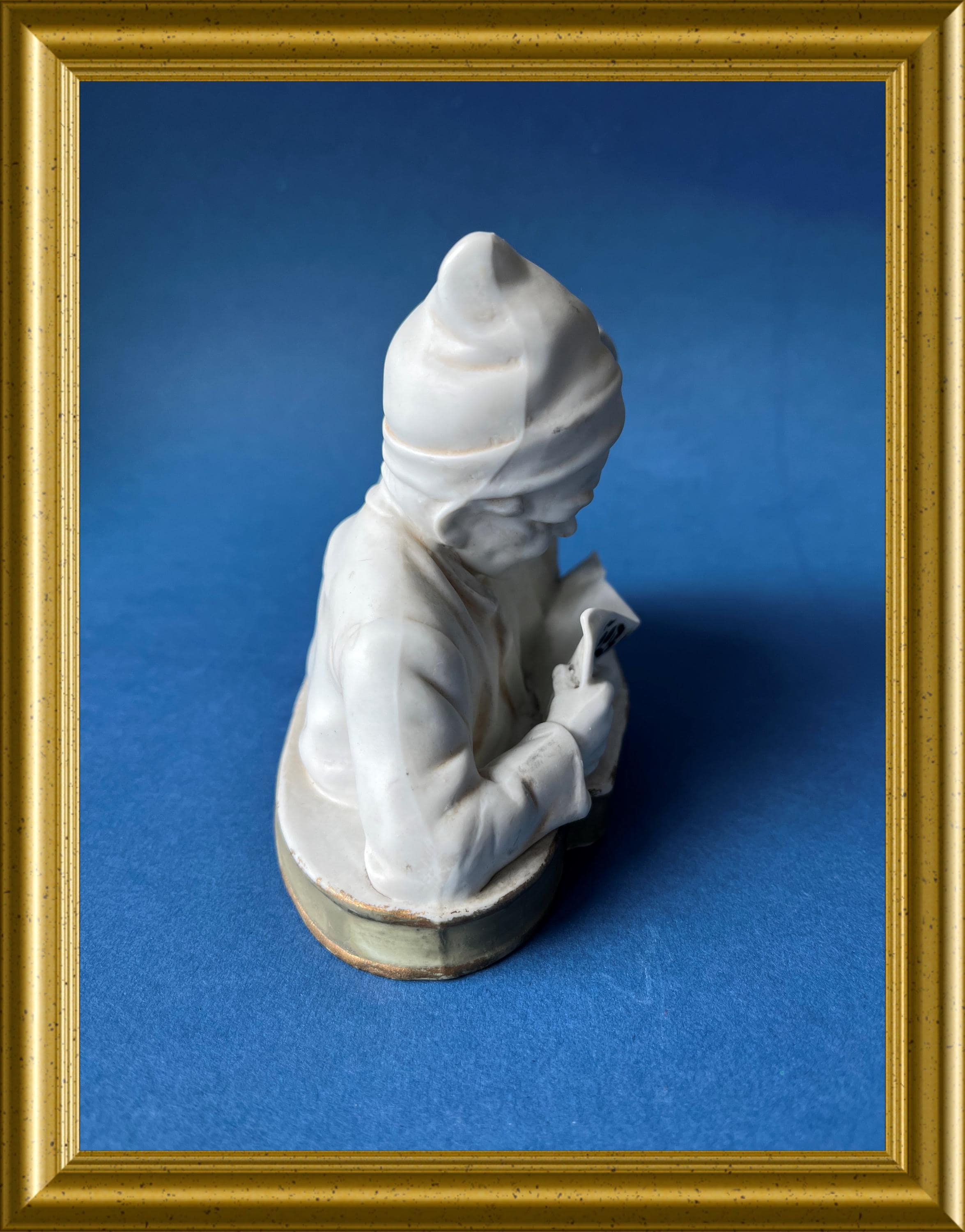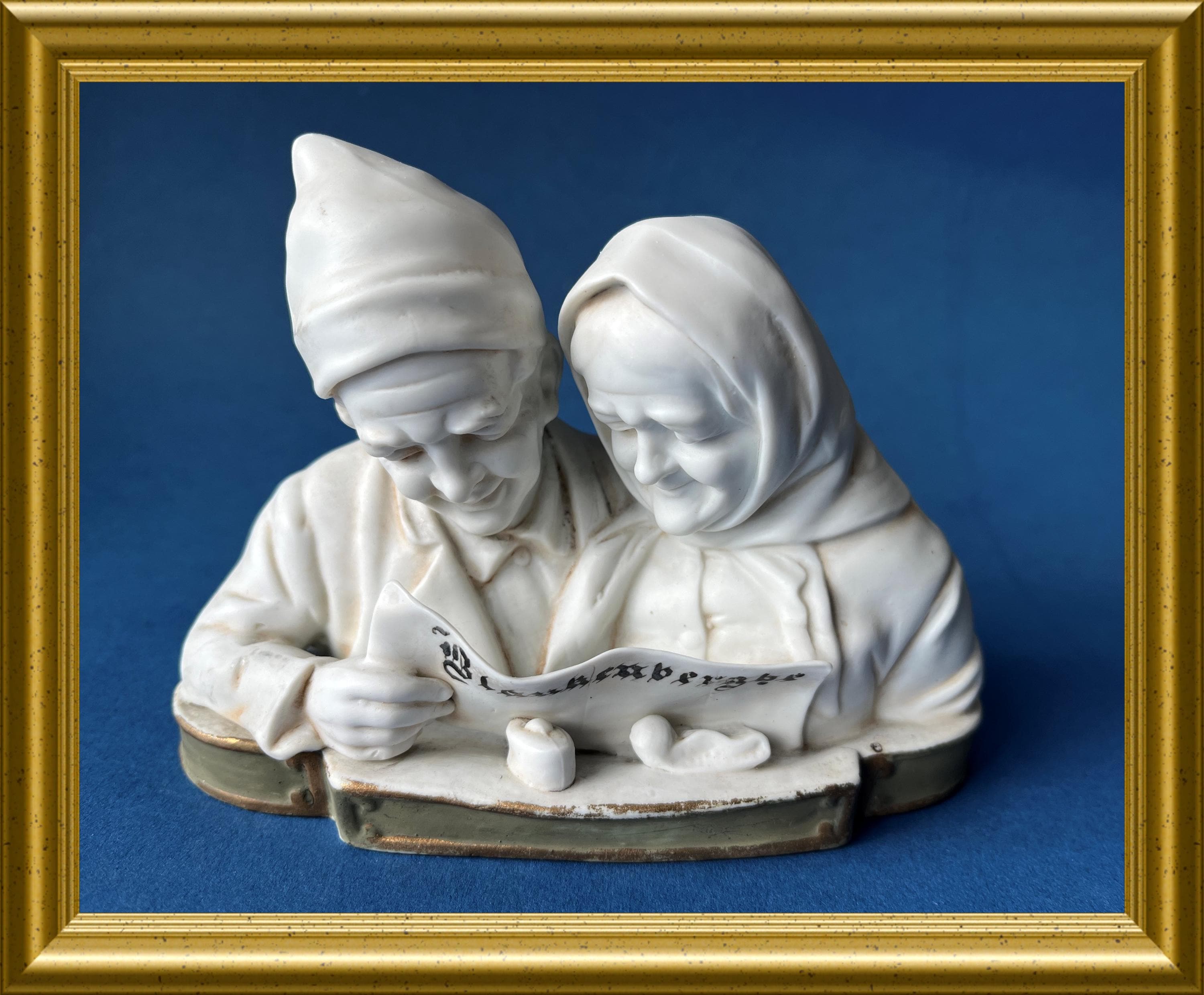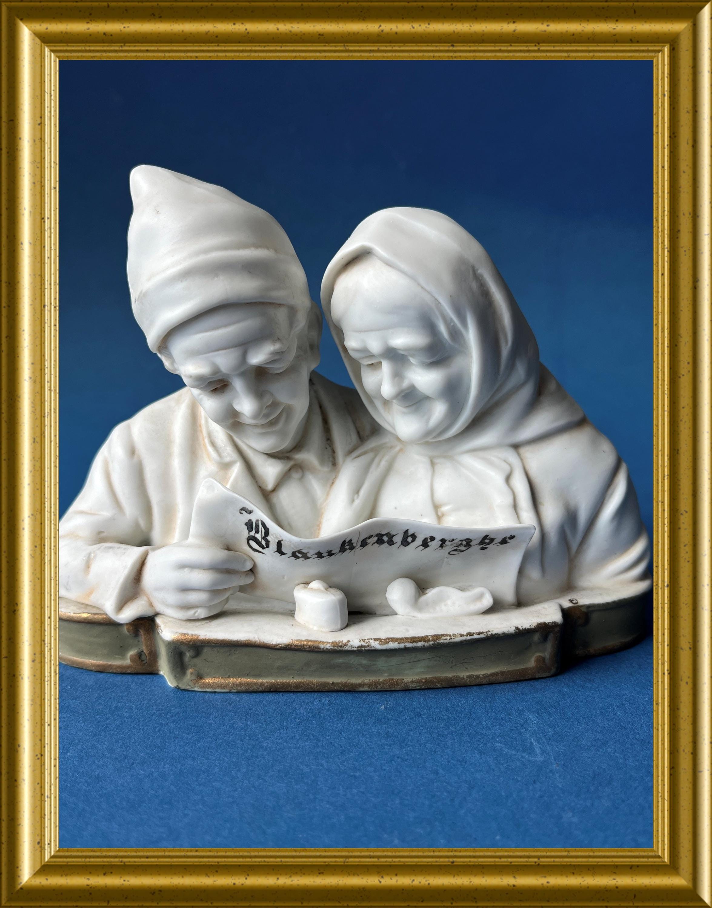 Antique white bisque porcelain figurine: elderly reading newspaper Blankenberghe