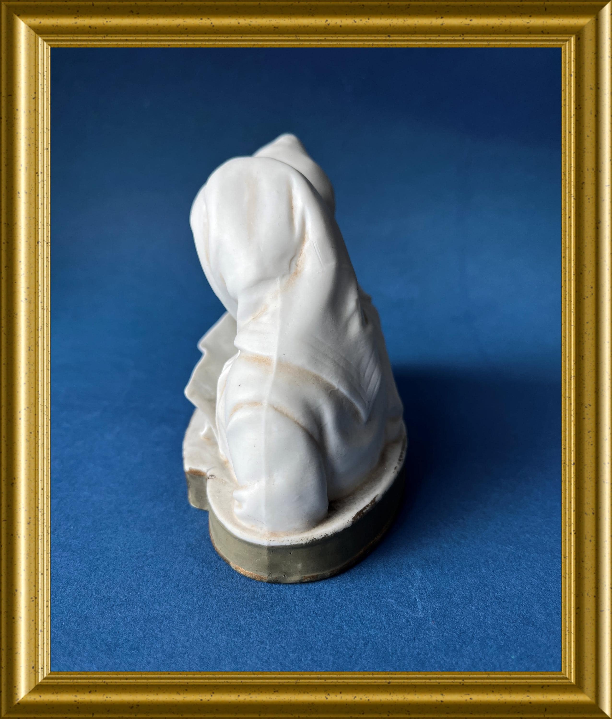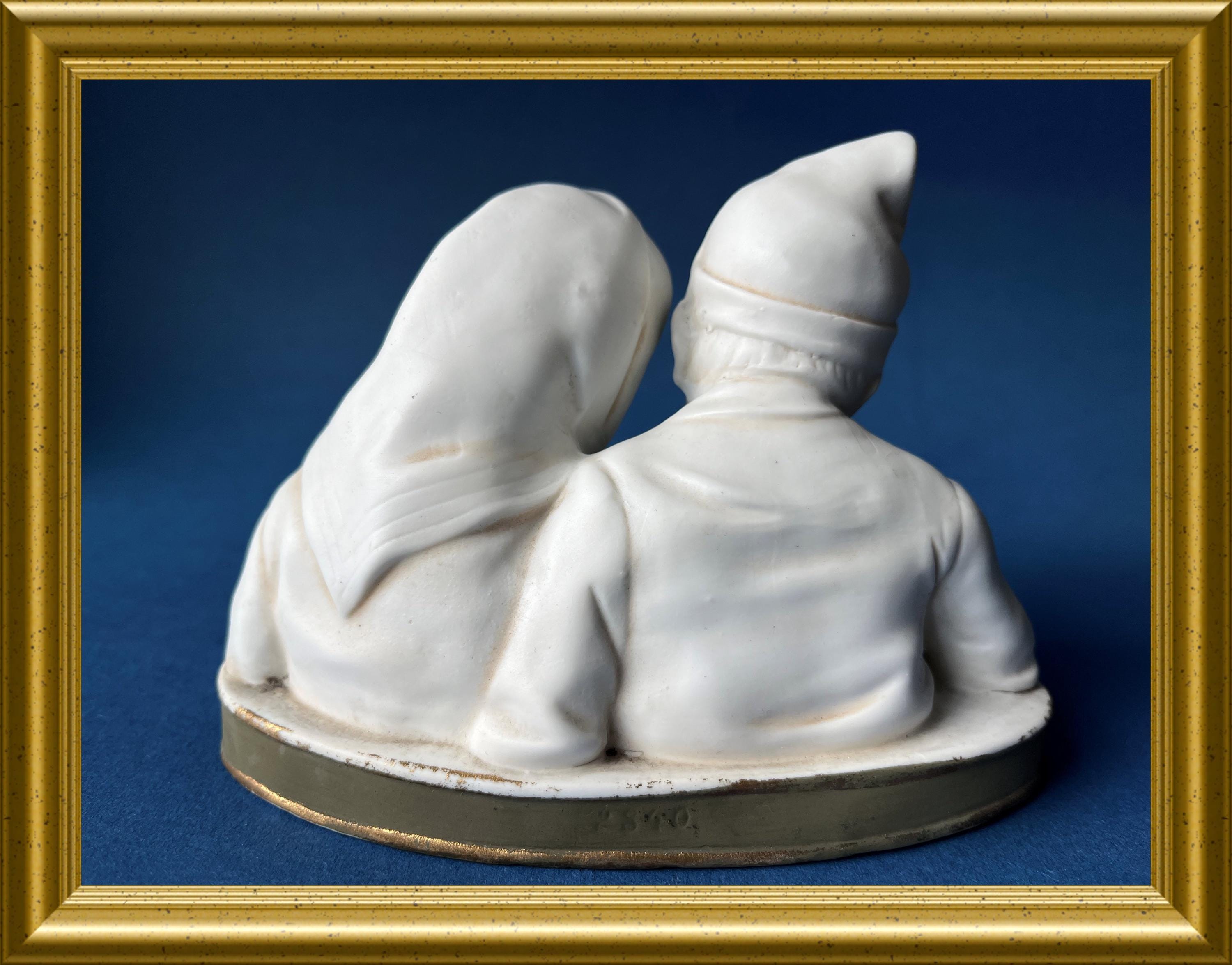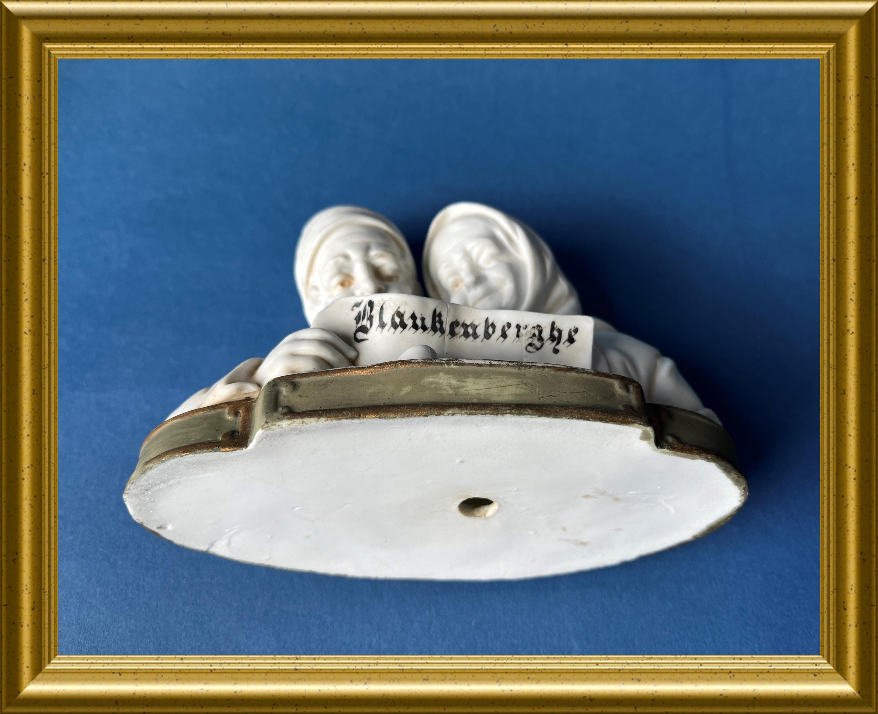Antique white bisque porcelain figurine: elderly reading newspaper Blankenberghe