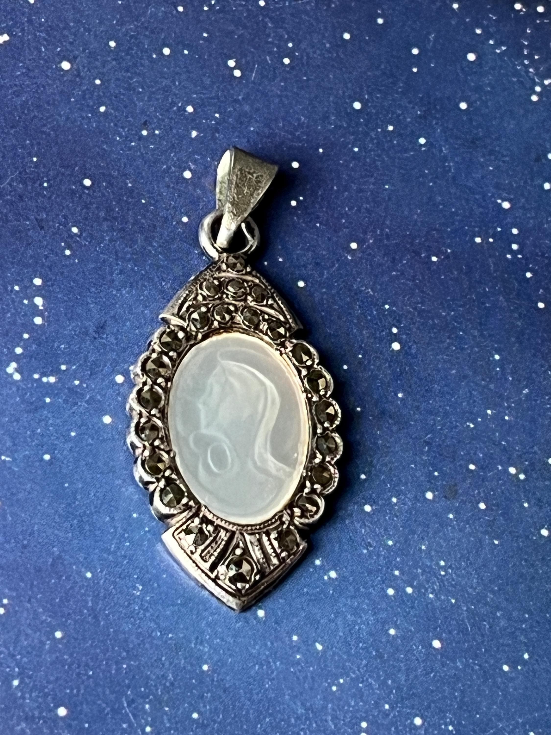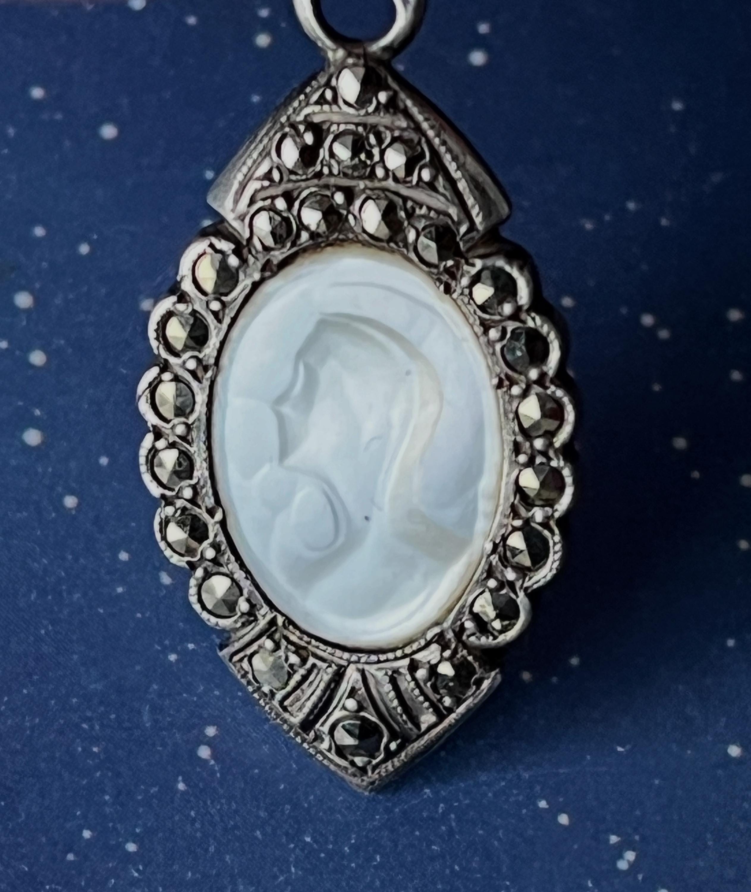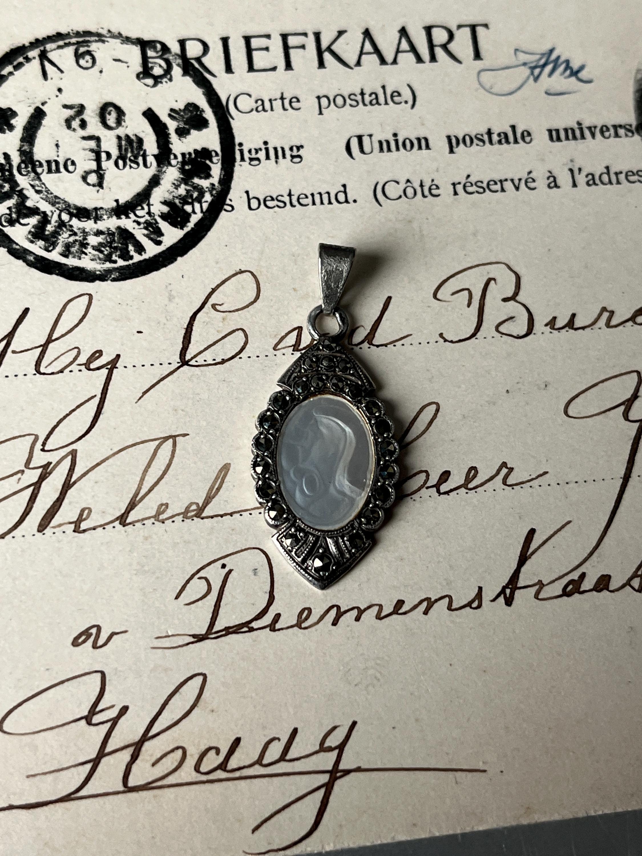 Old small silver pendant: marcasite, mother-of-pearl portrait.