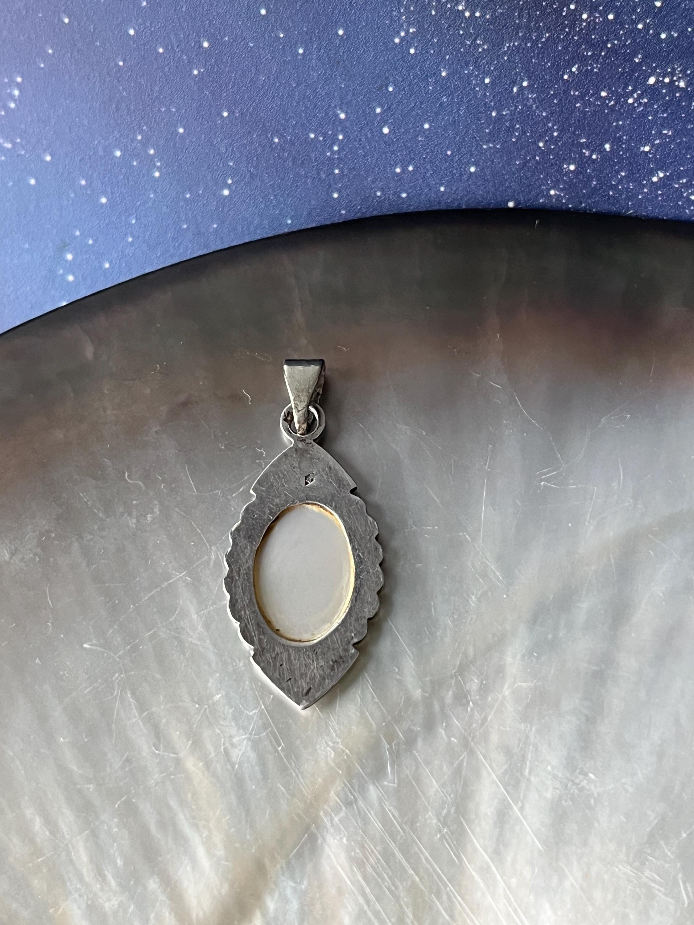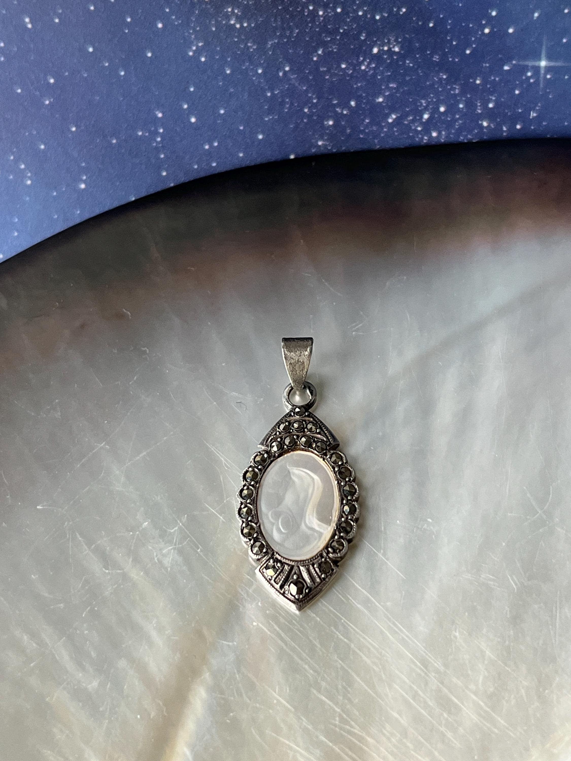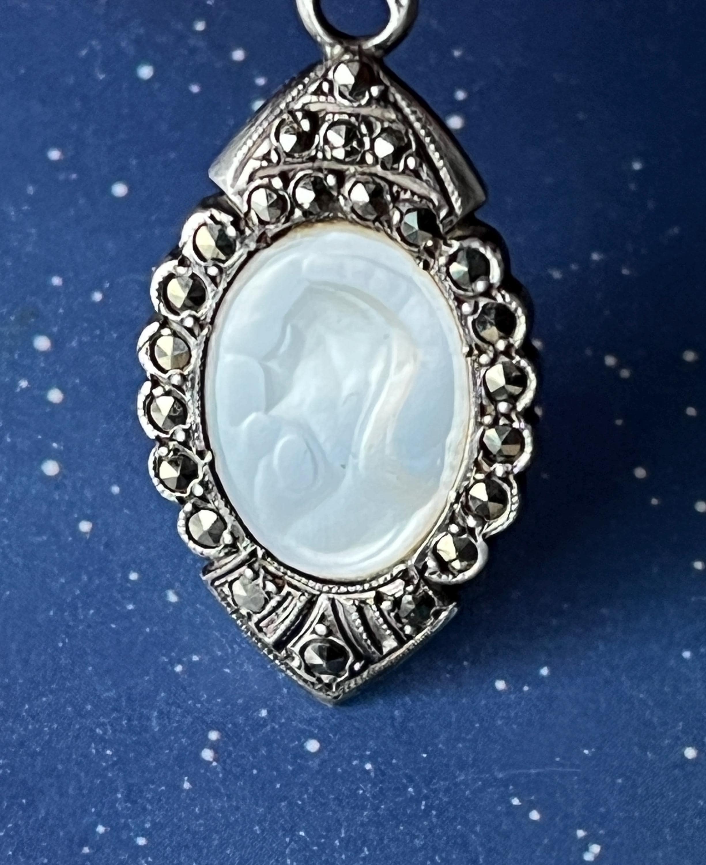 Old small silver pendant: marcasite, mother-of-pearl portrait.