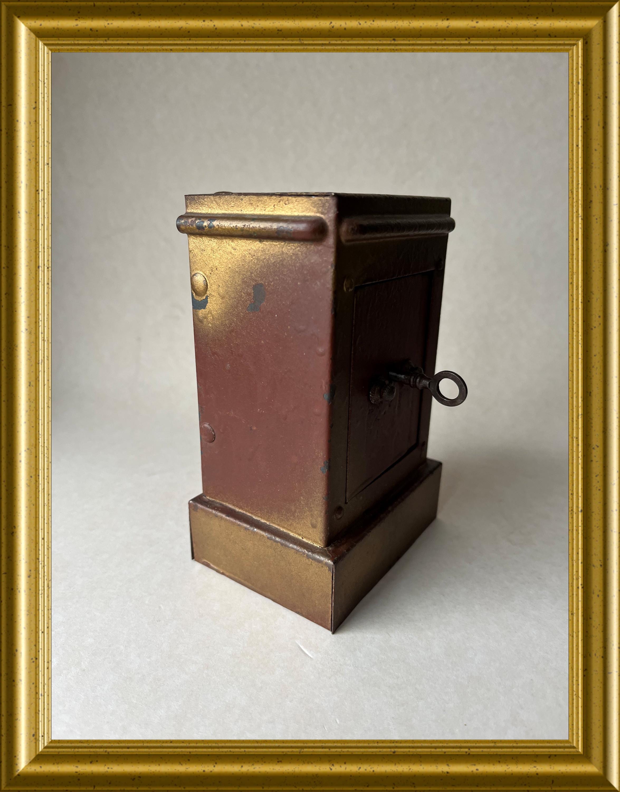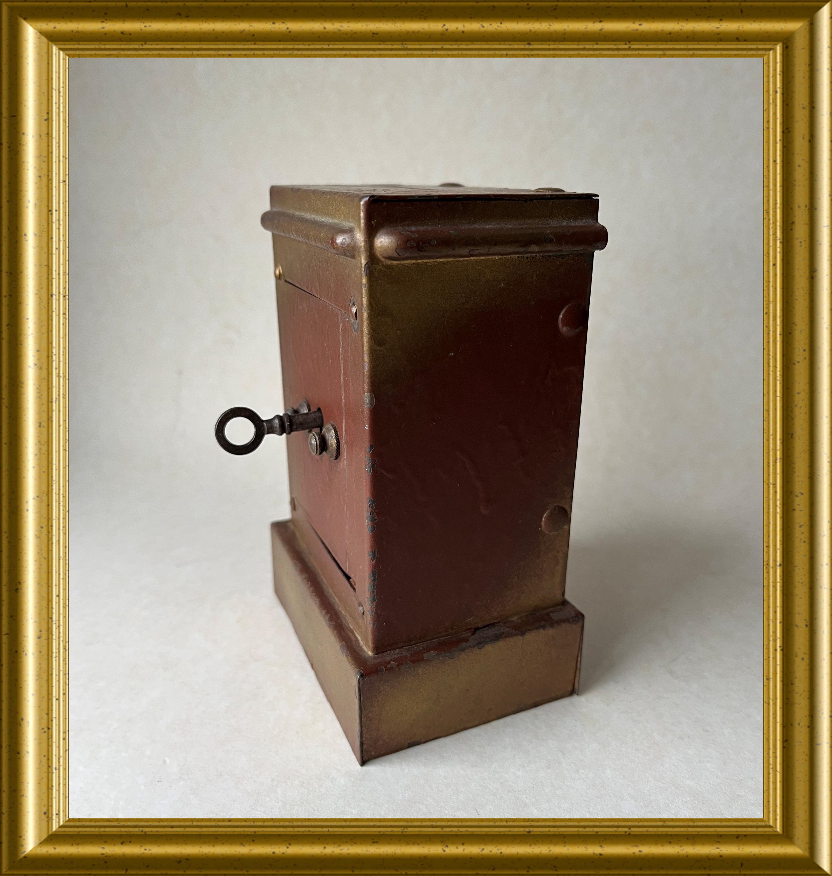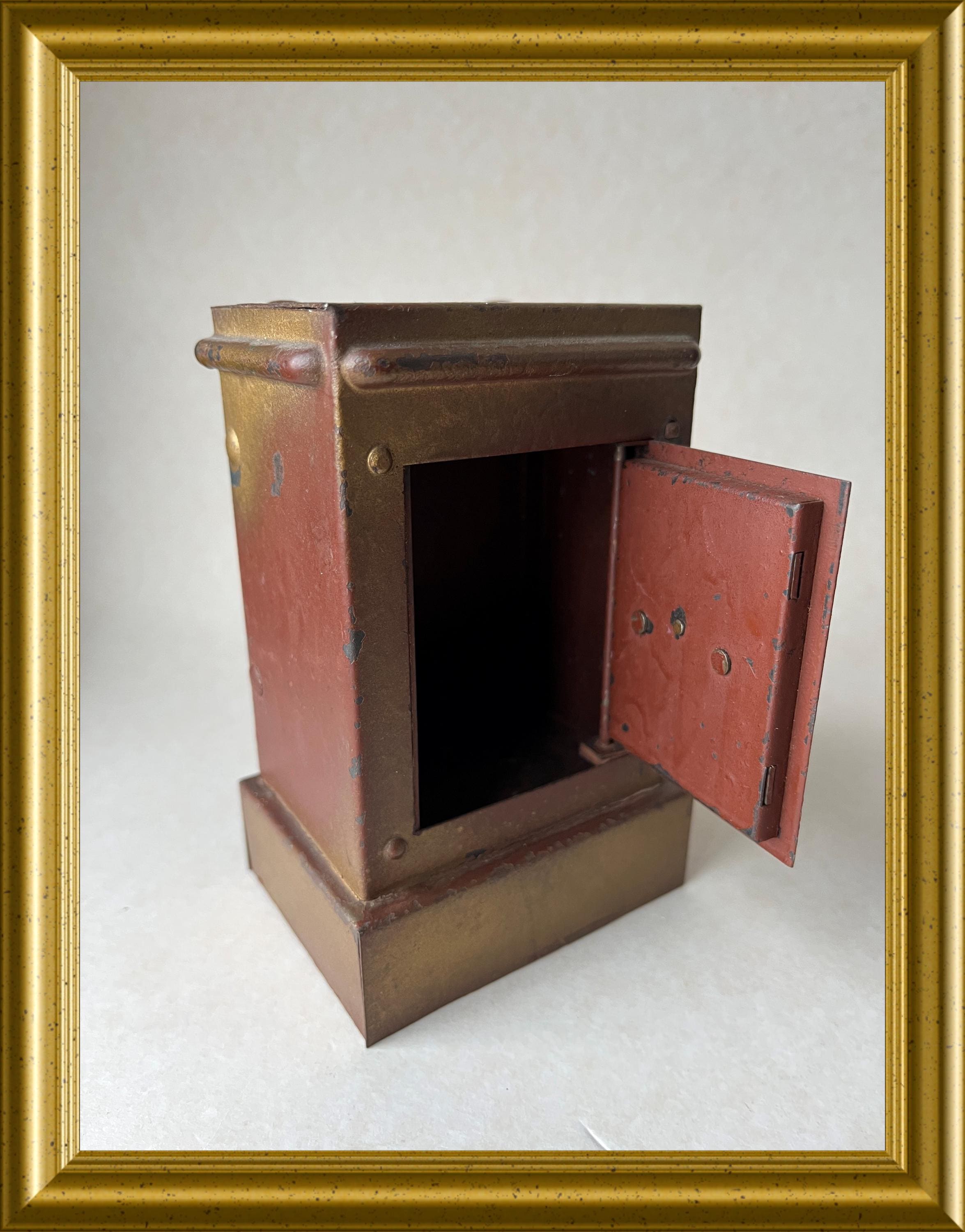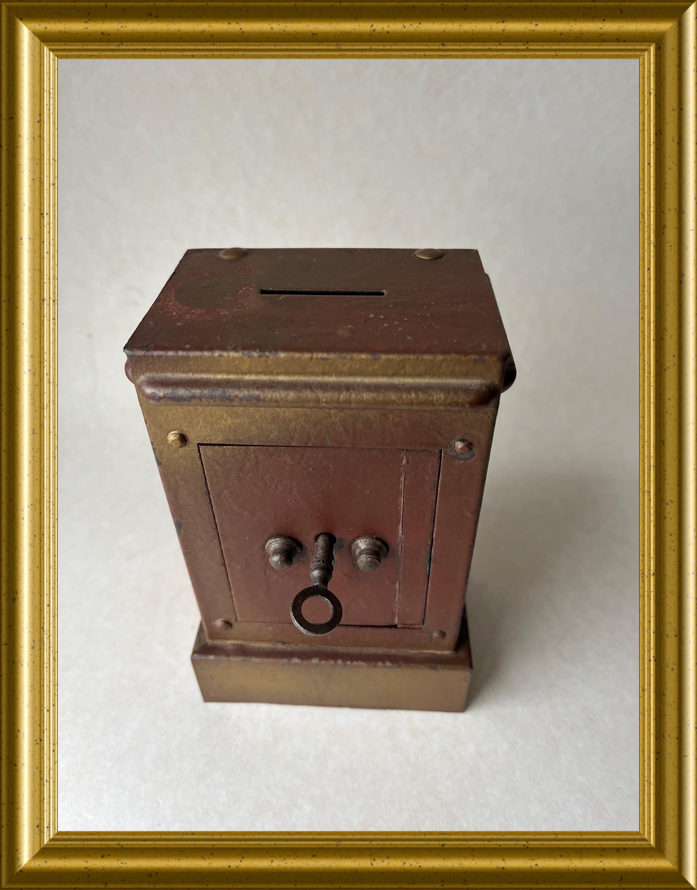 Vintage money box crafted in the shape of a miniature safe.