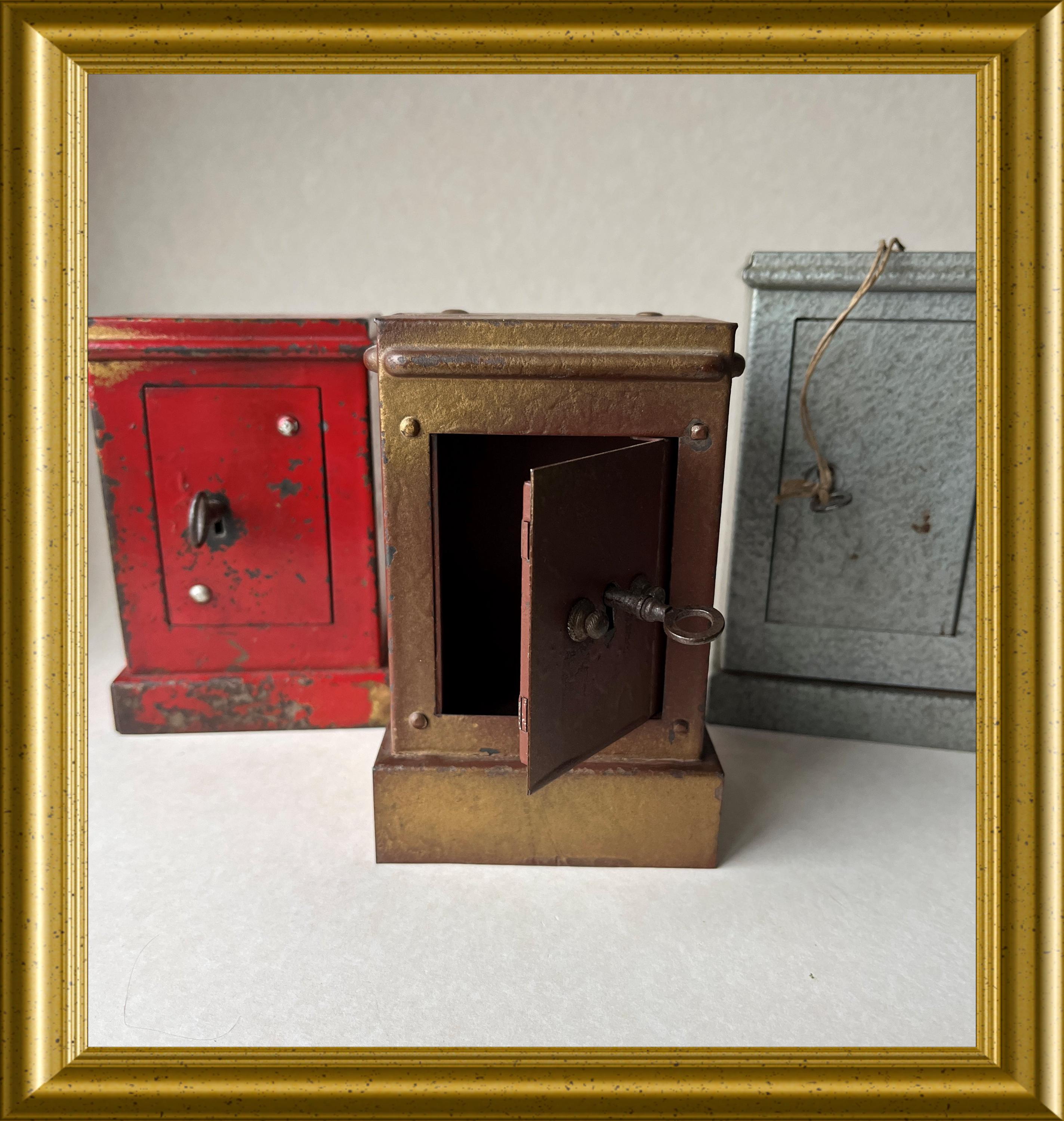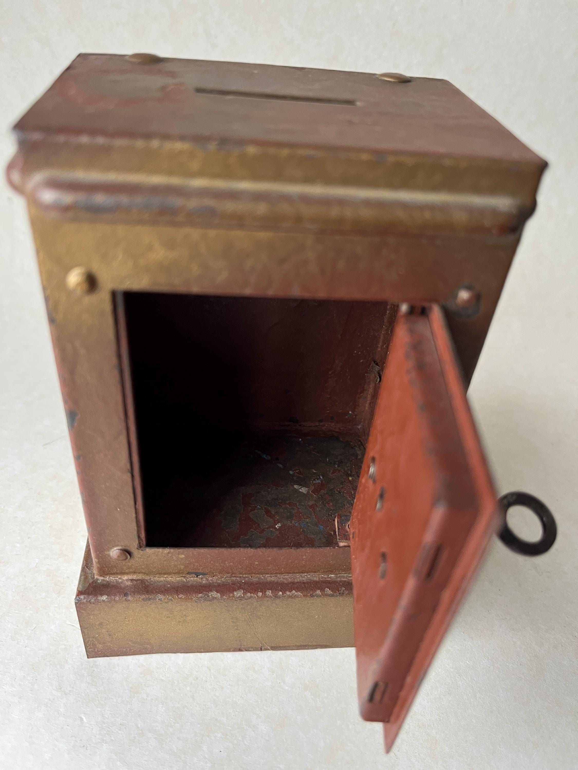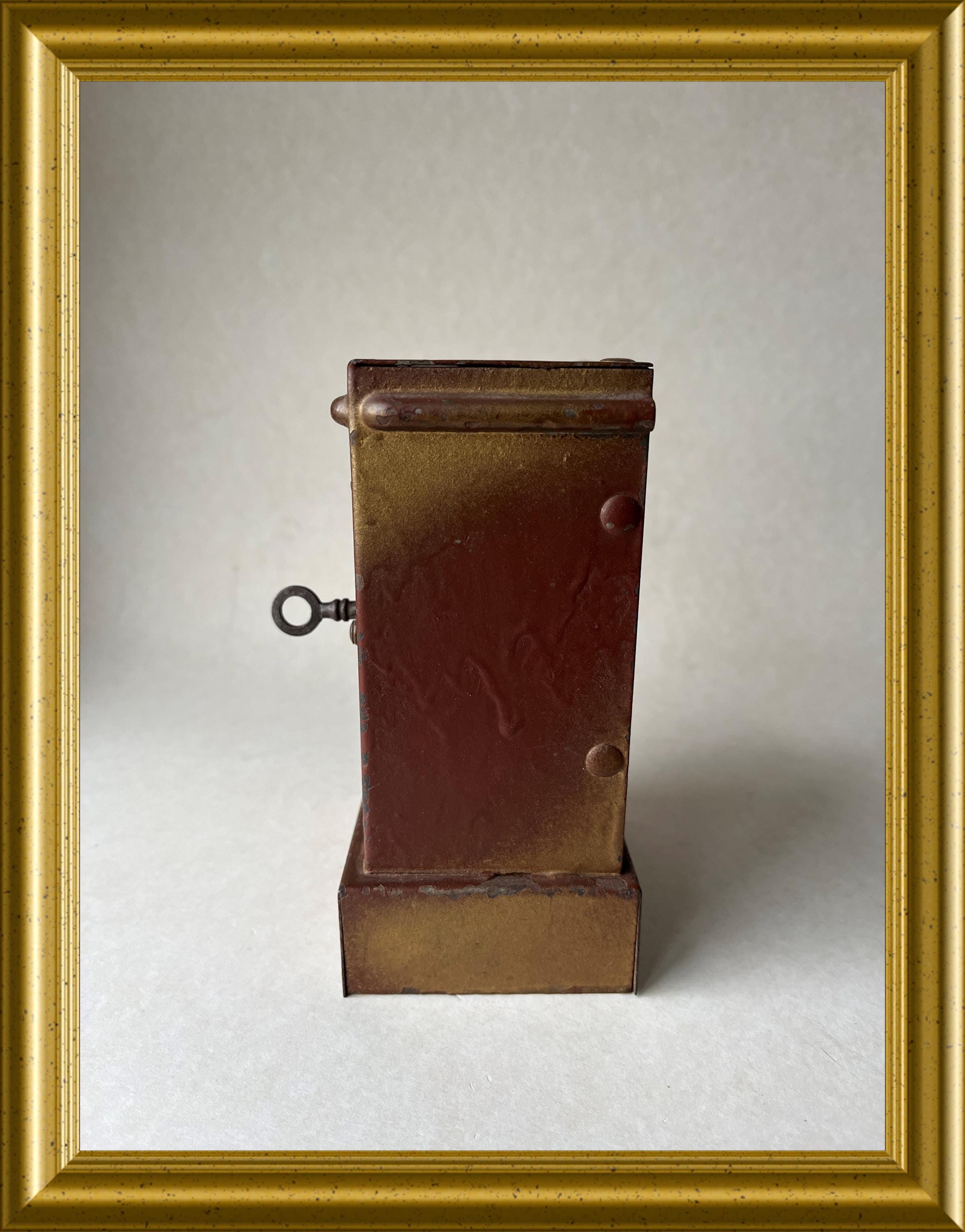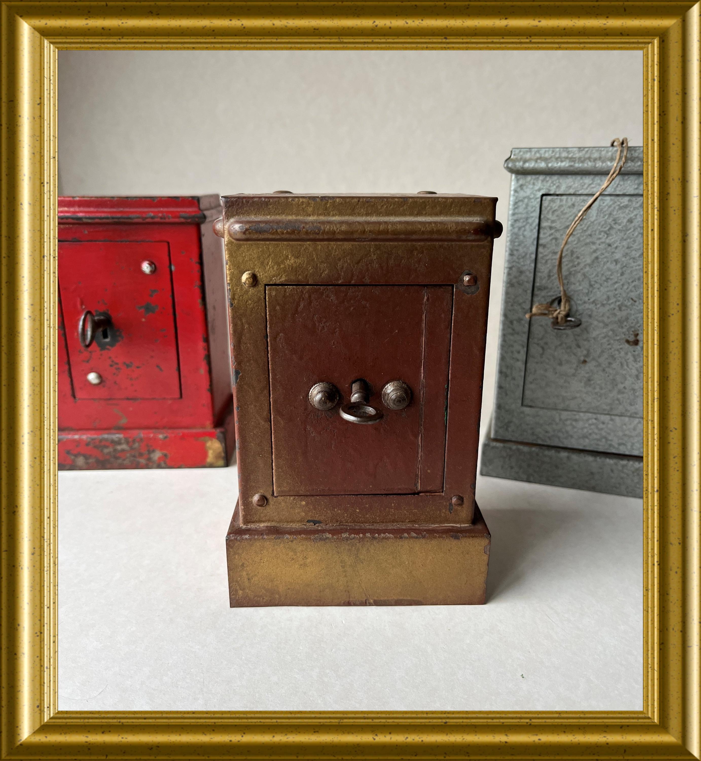 Vintage money box crafted in the shape of a miniature safe.
