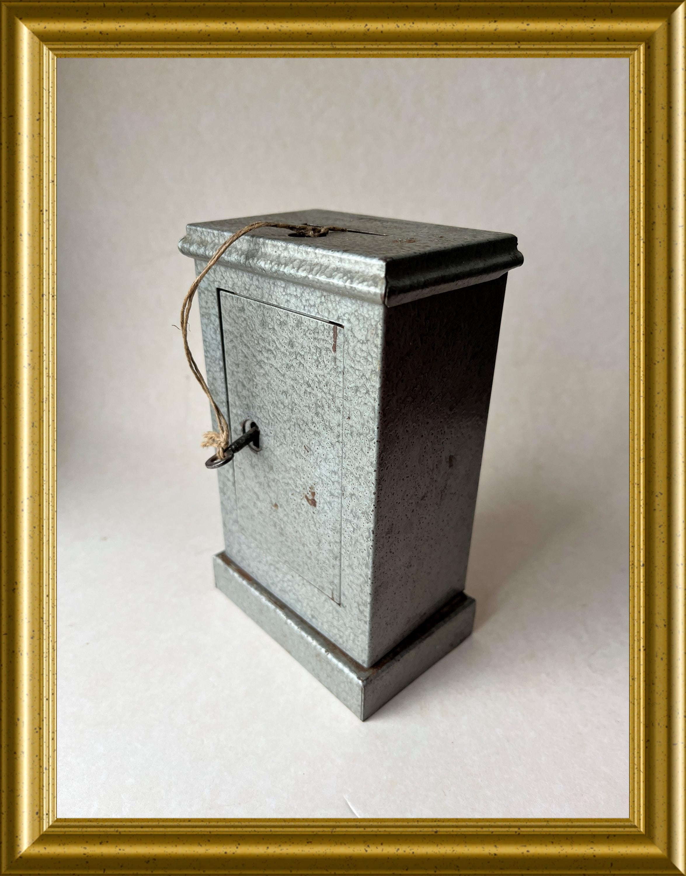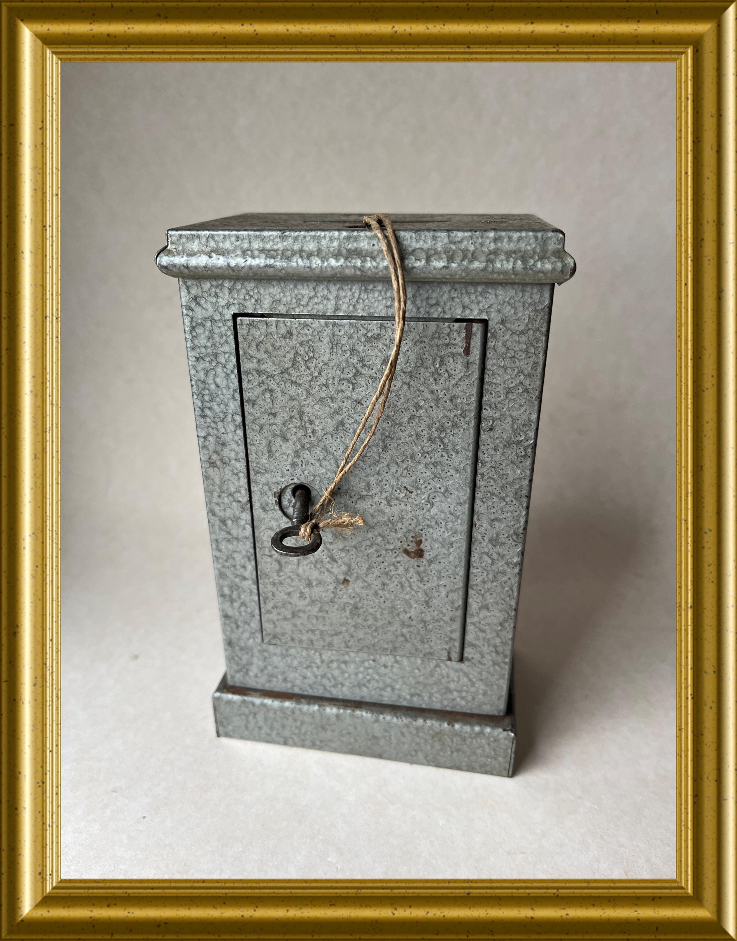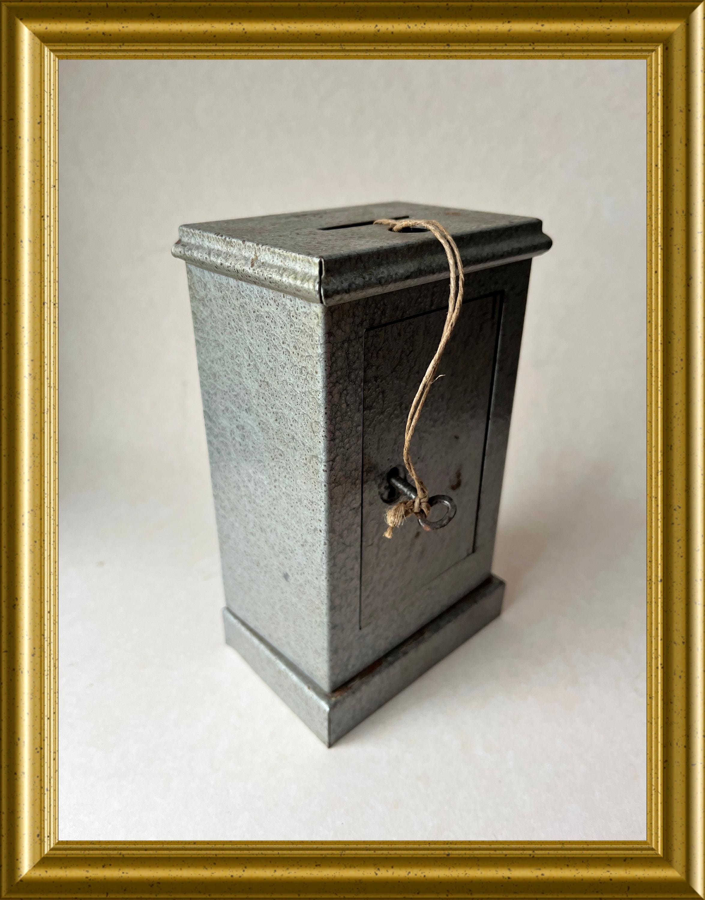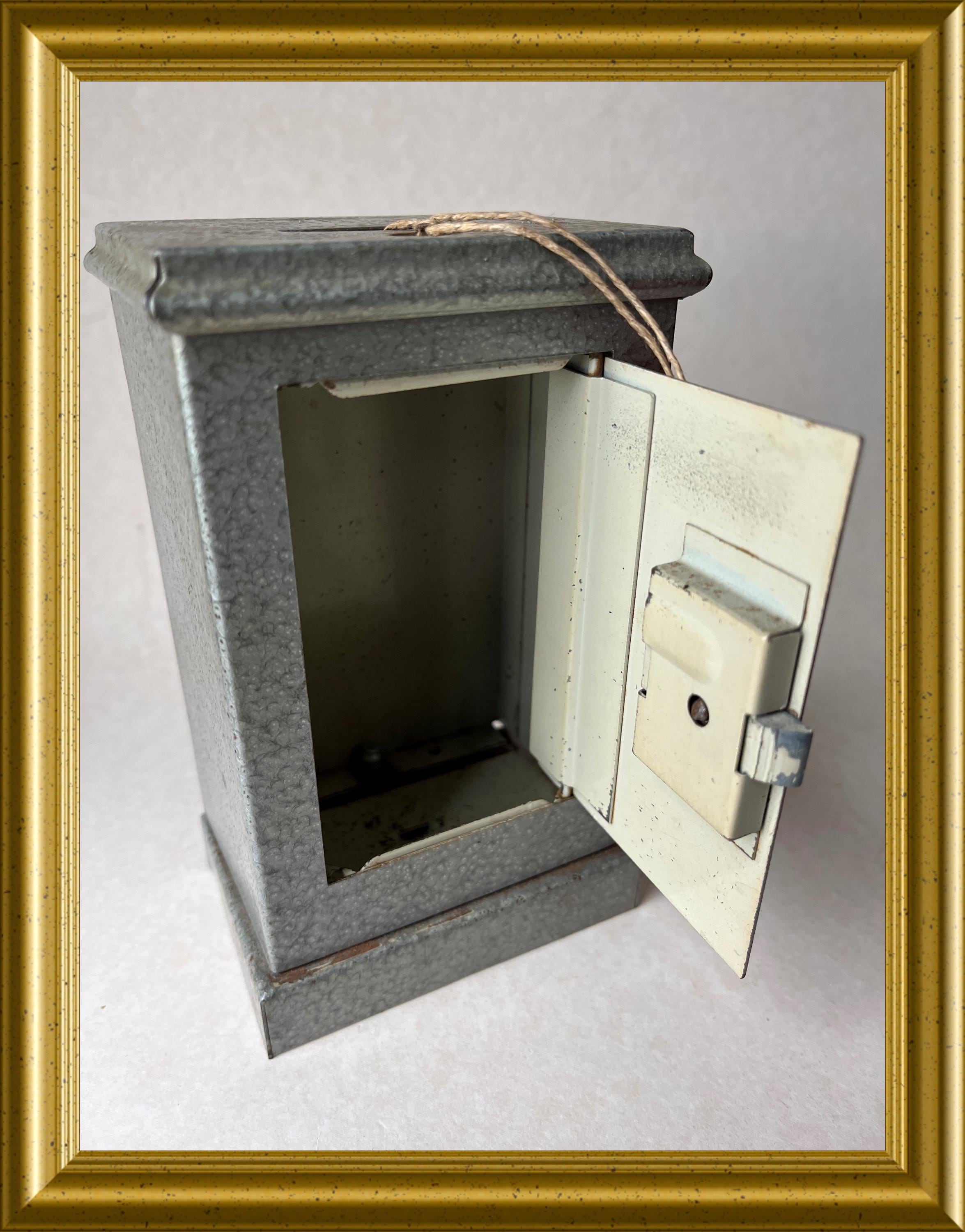 Vintage money box crafted in the shape of a miniature safe.