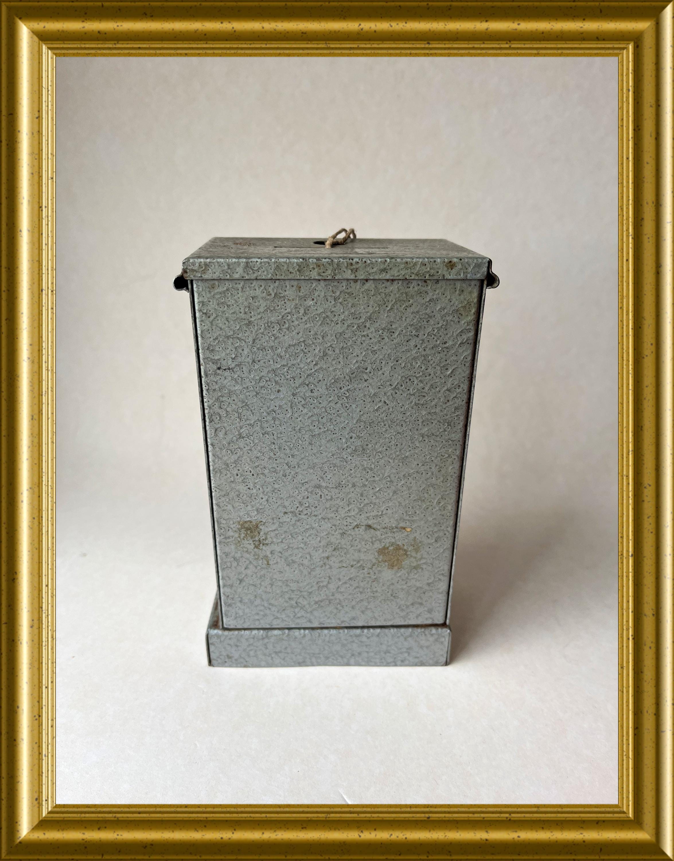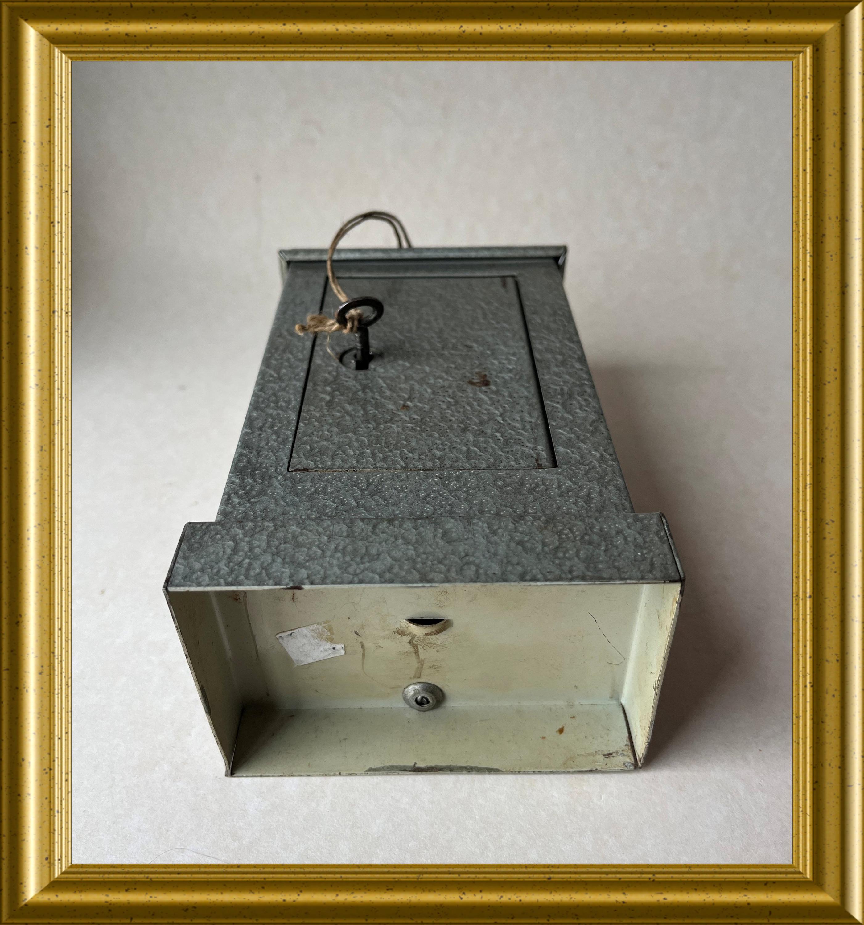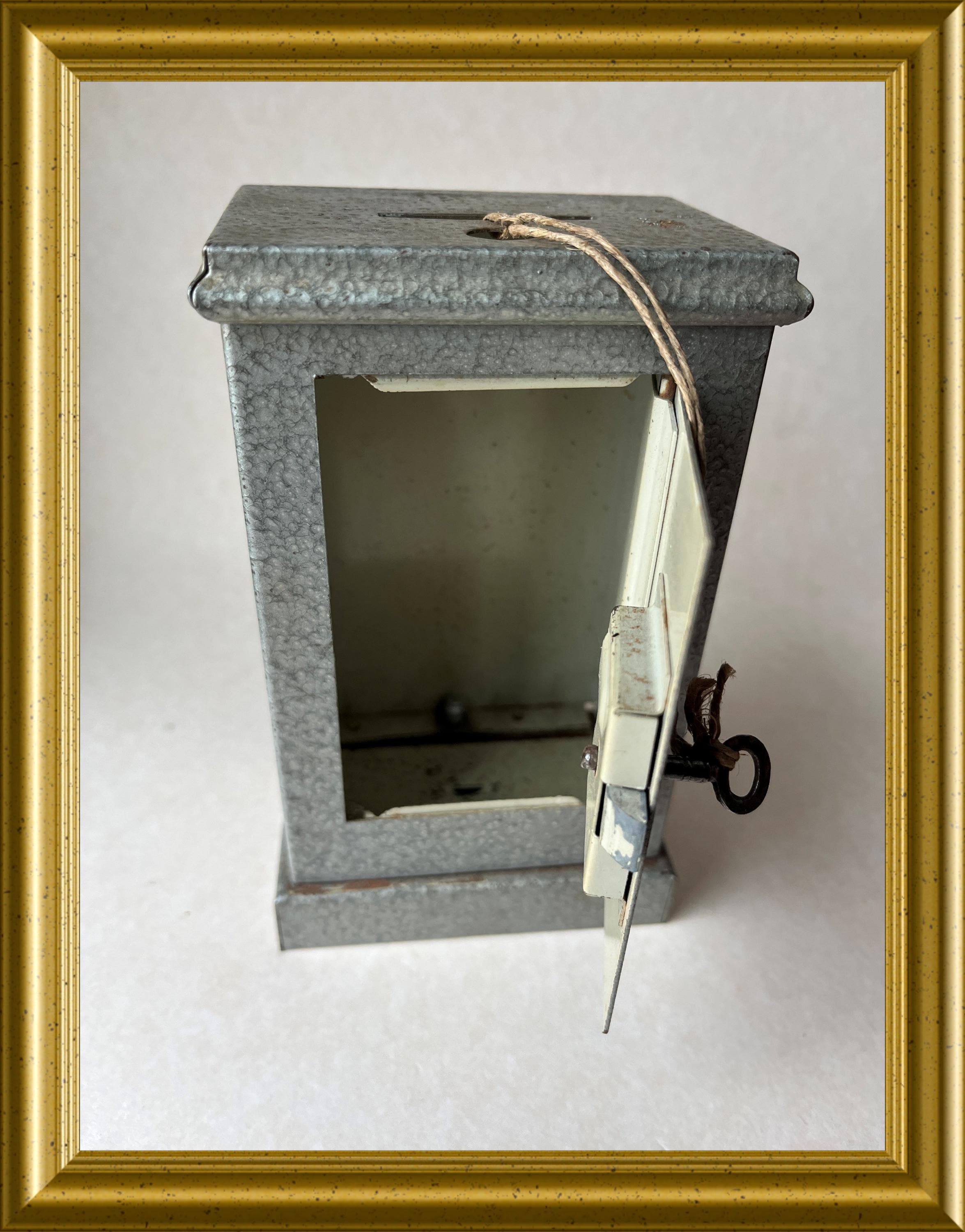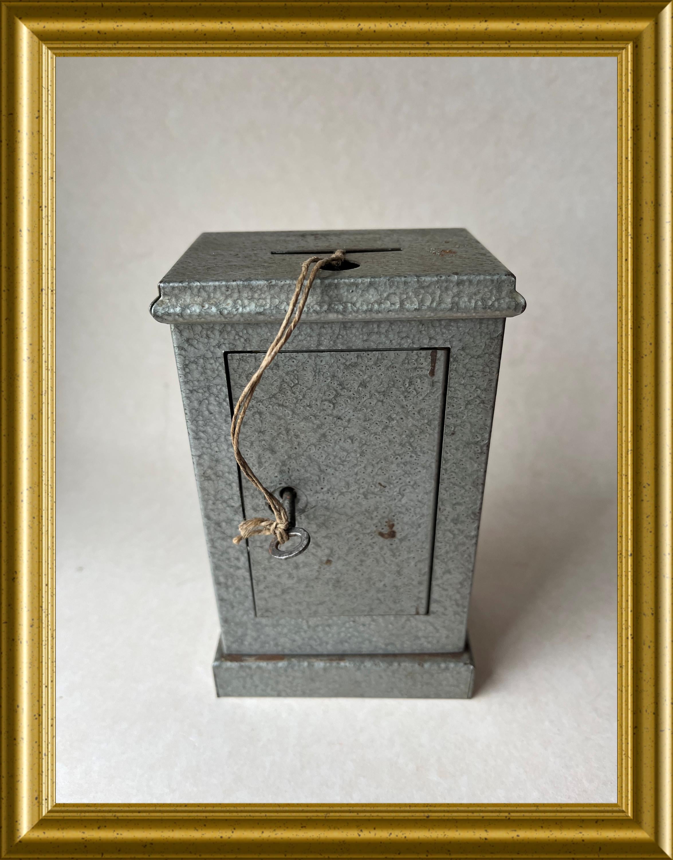Vintage money box crafted in the shape of a miniature safe.