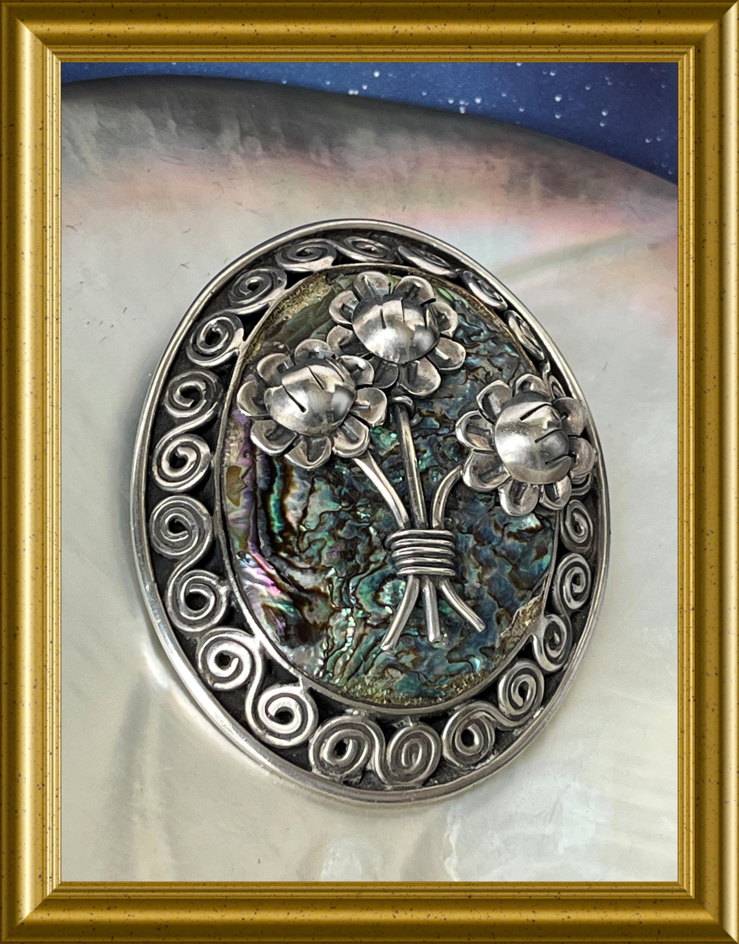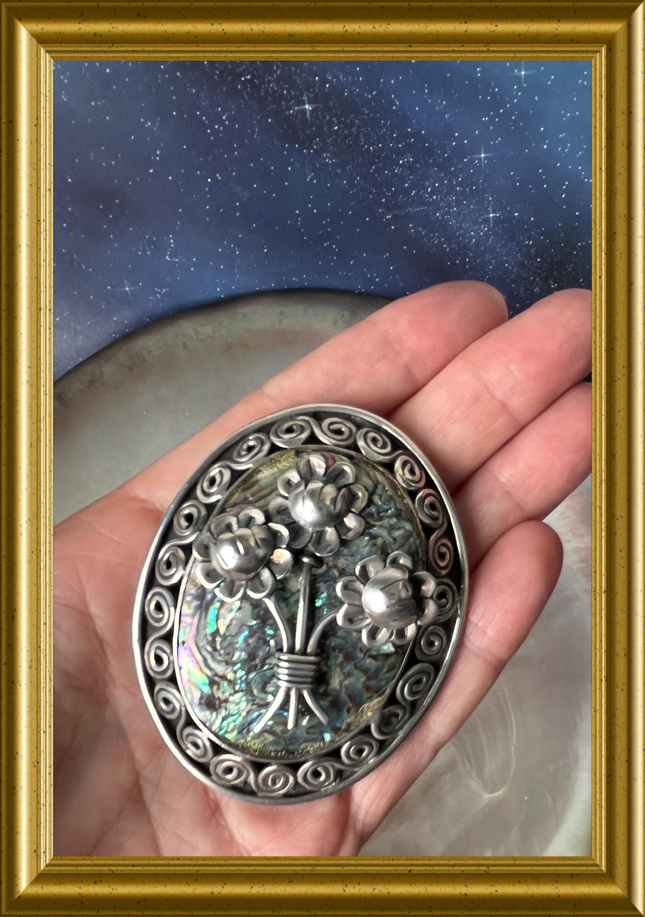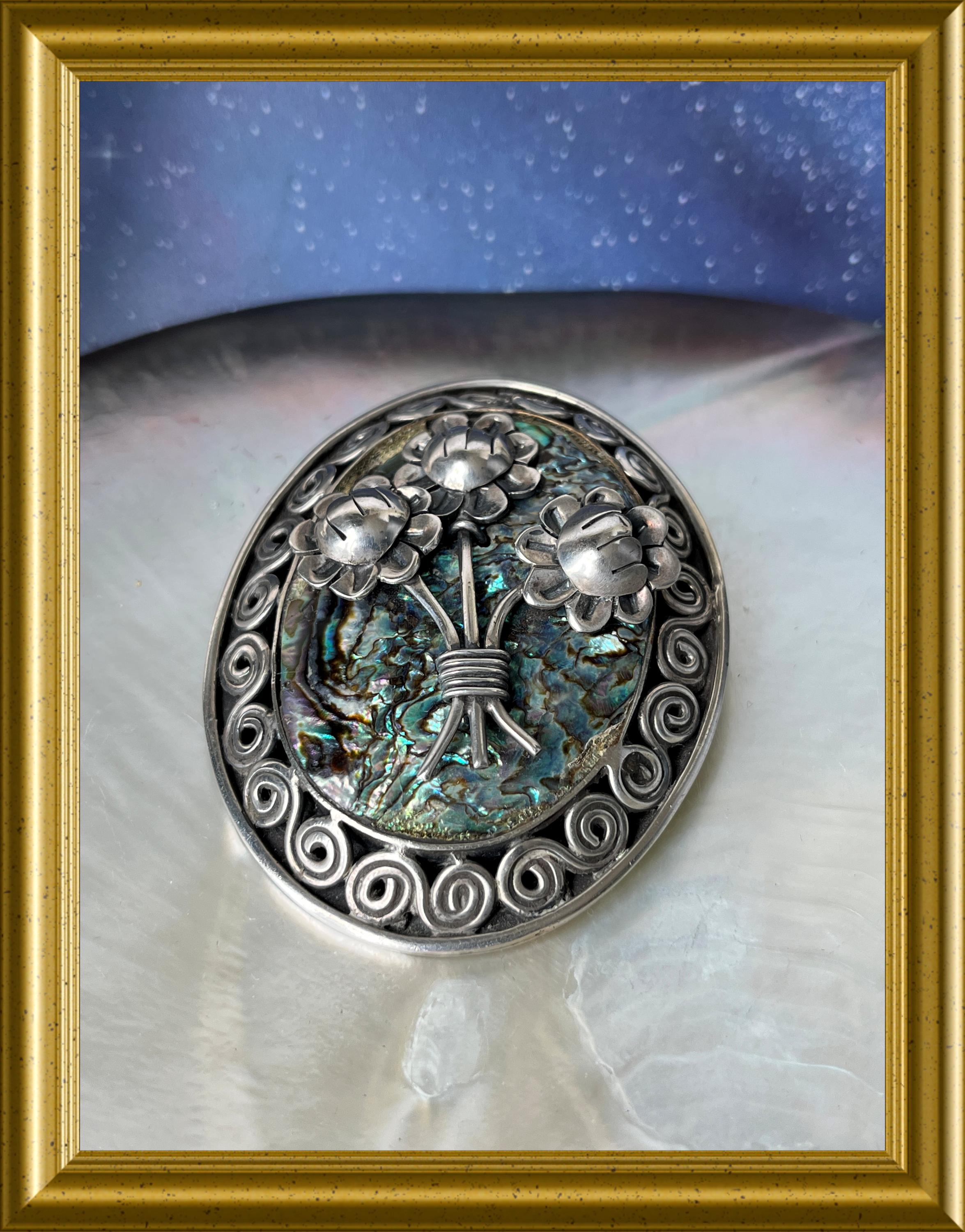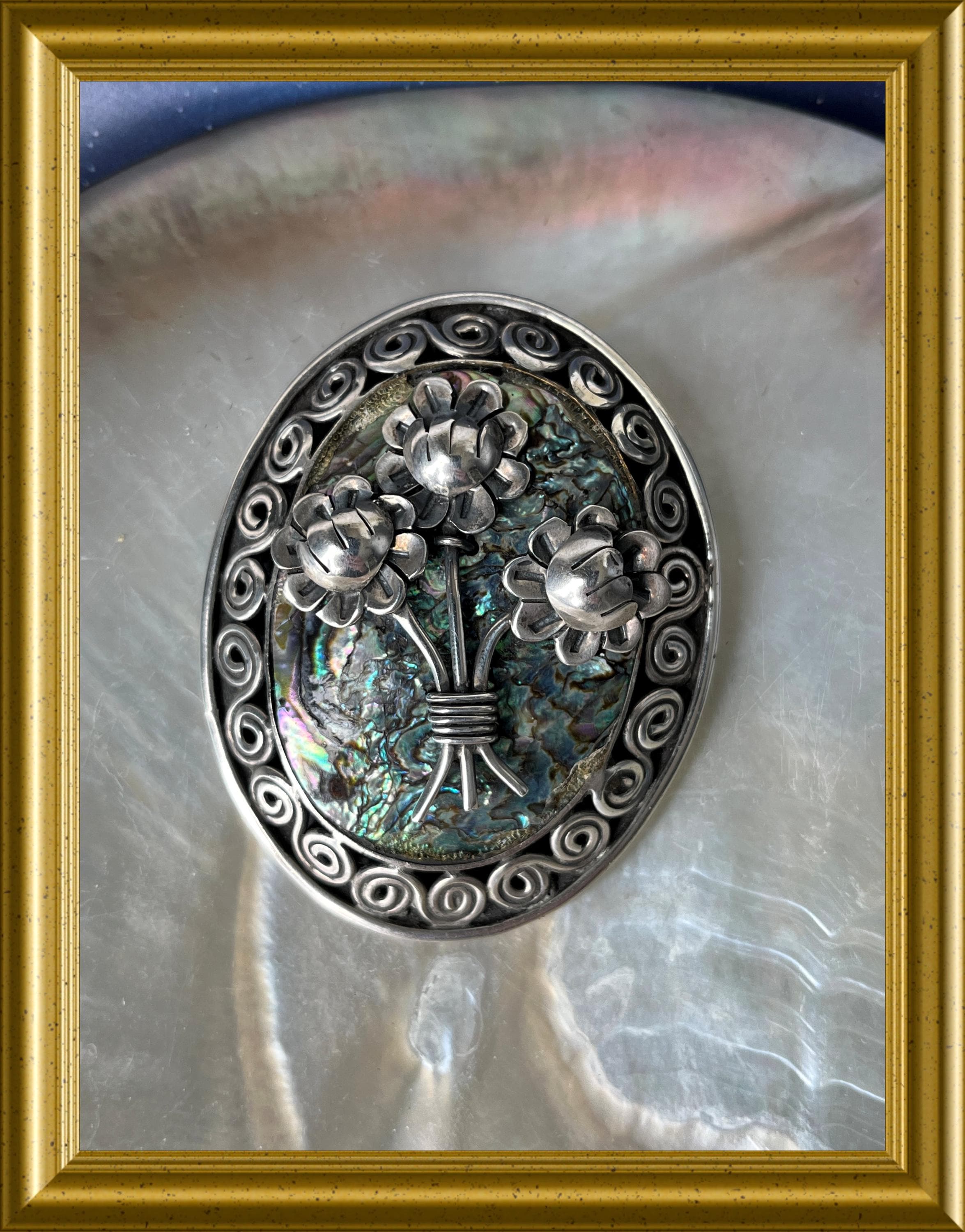 Large vintage sterling silver brooch featuring flowers on mother-of-pearl / abalone.