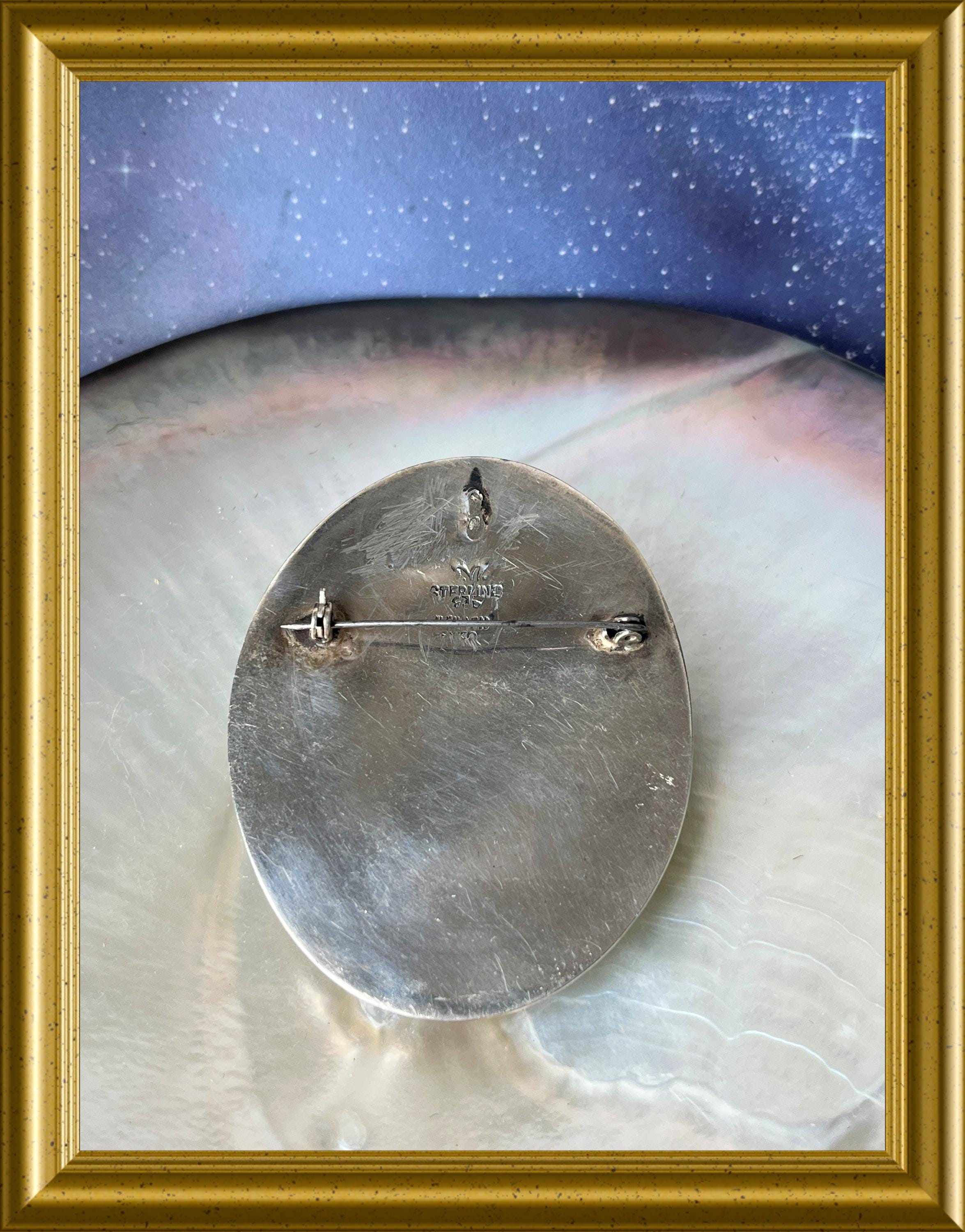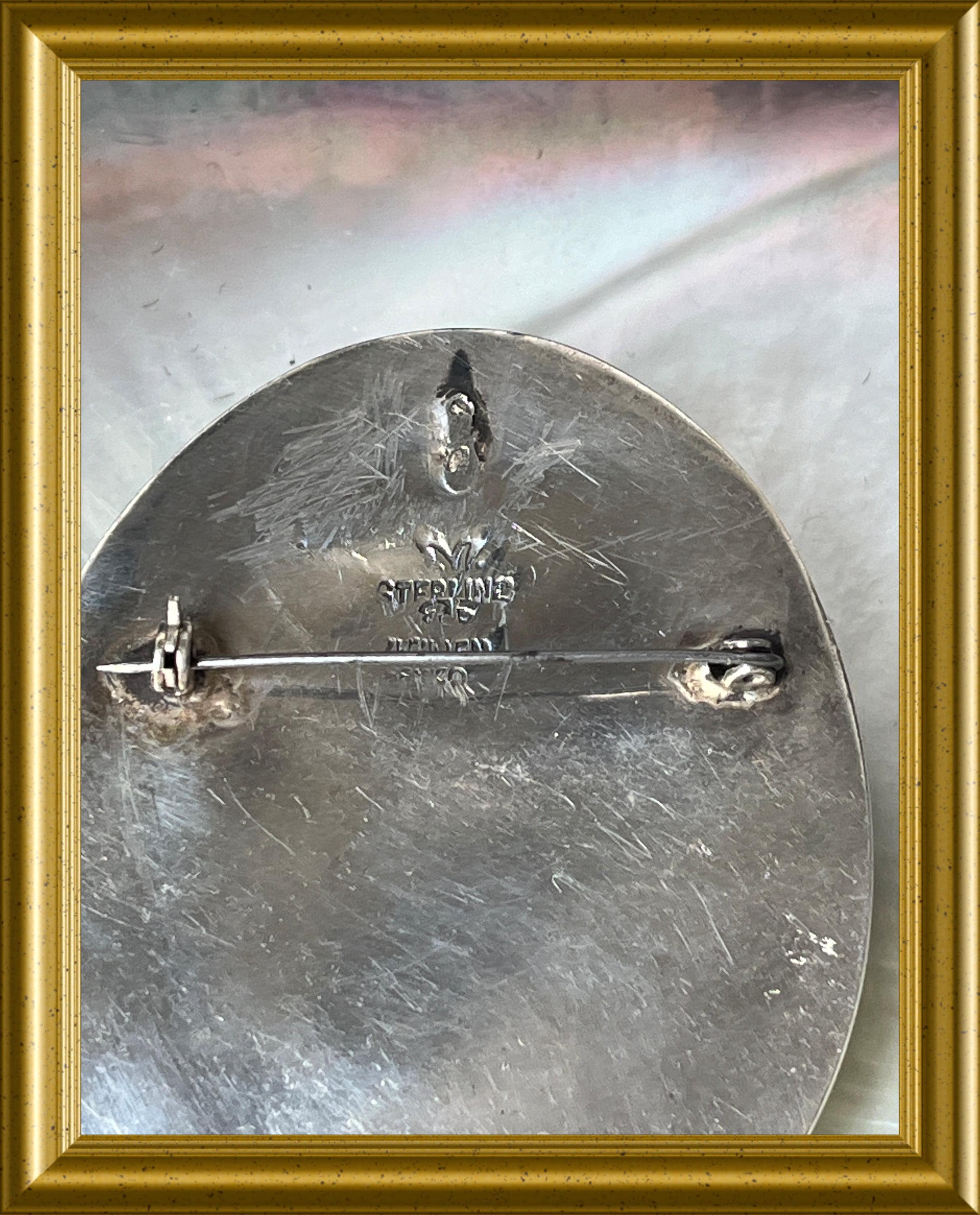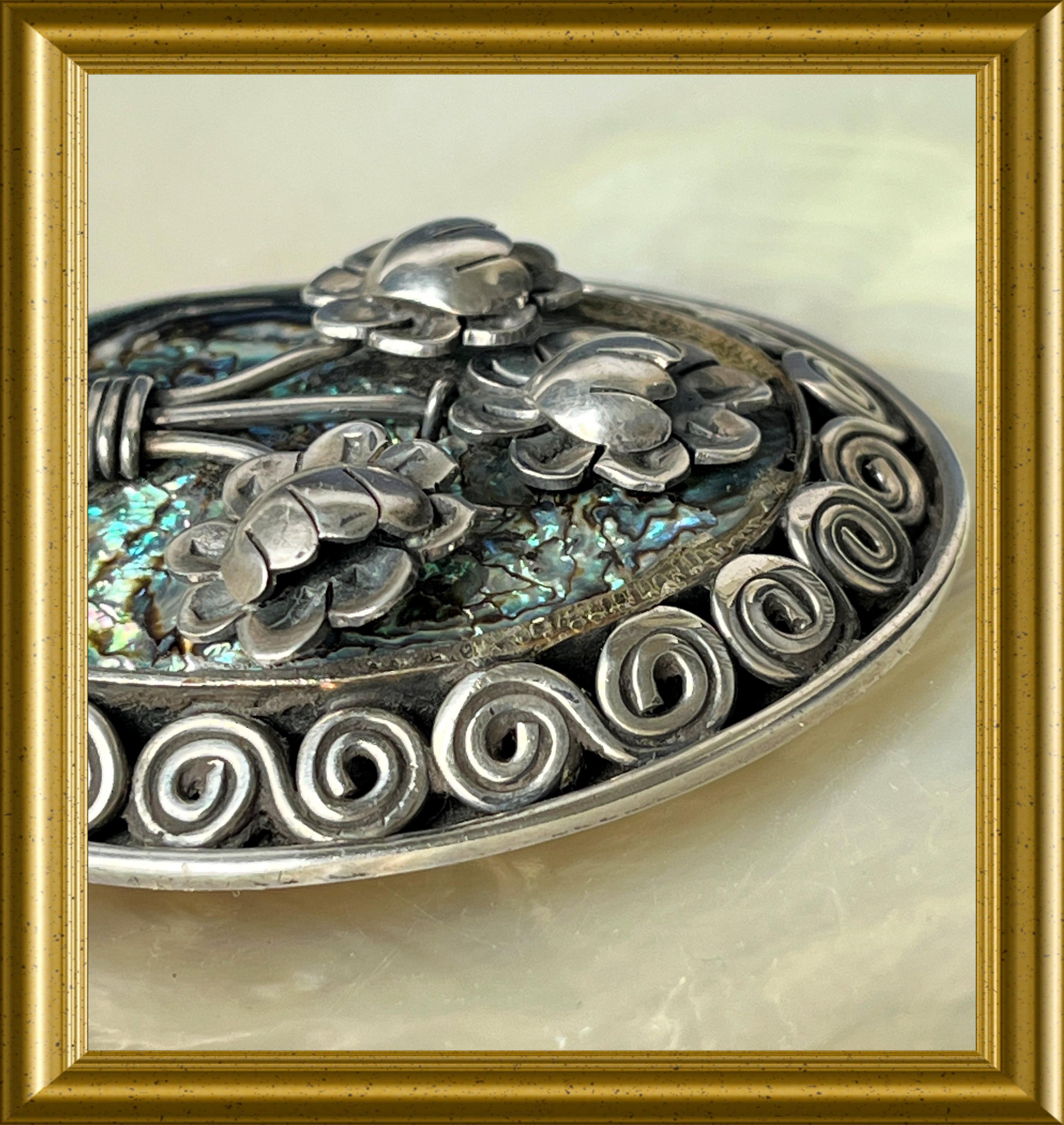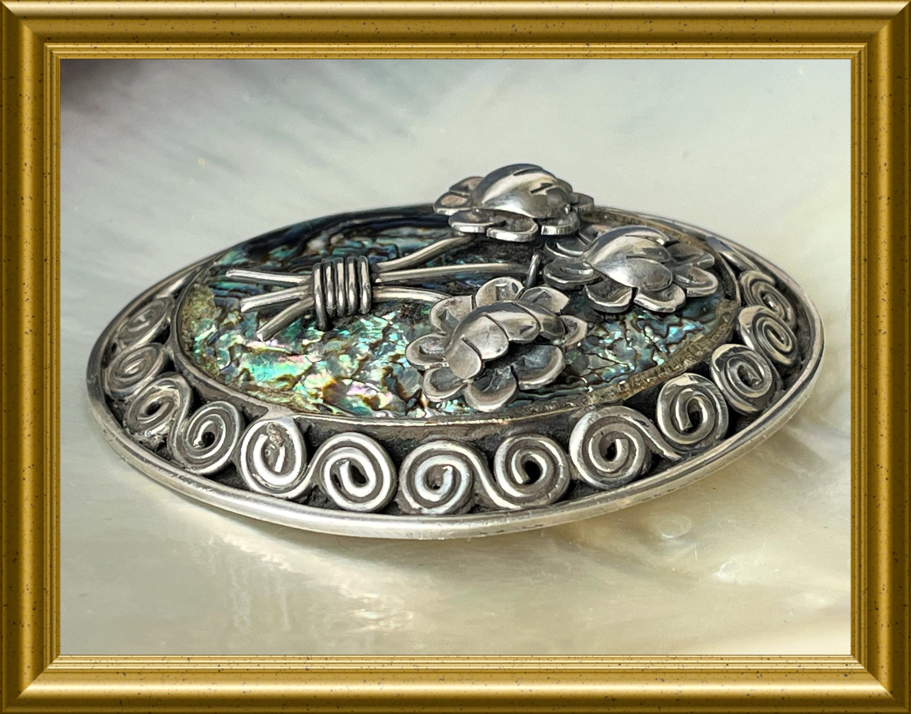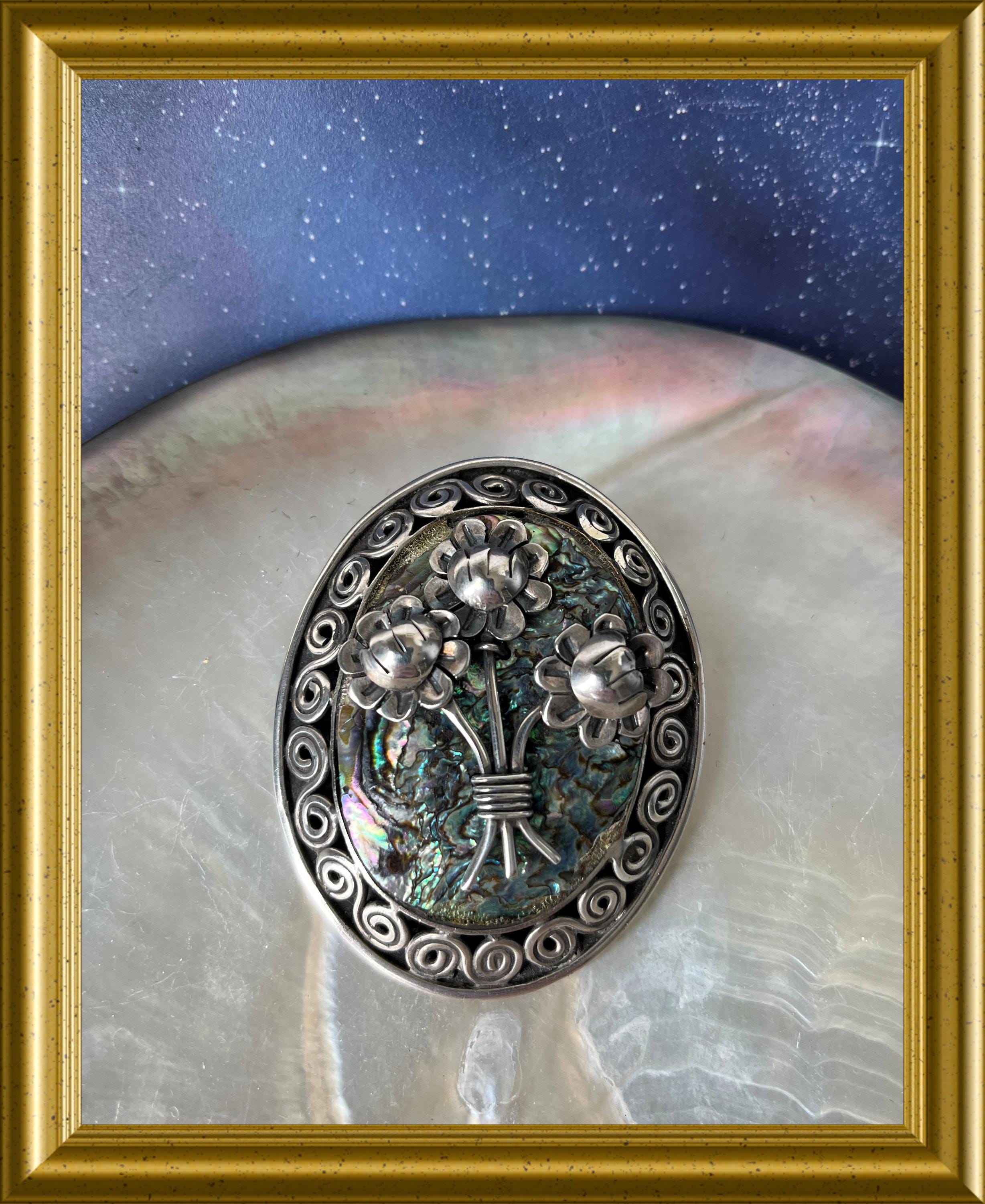 Large vintage sterling silver brooch featuring flowers on mother-of-pearl / abalone.