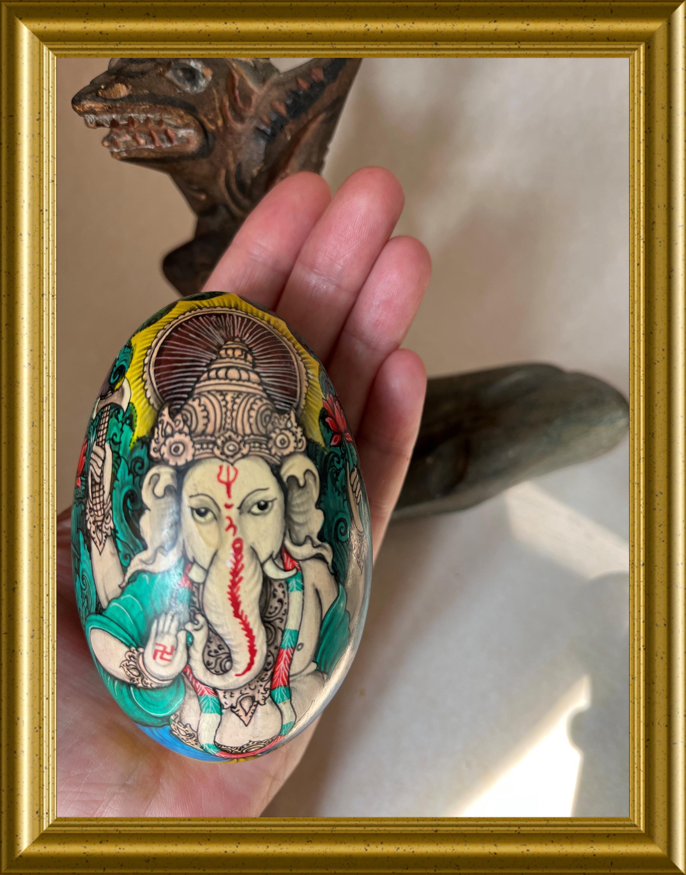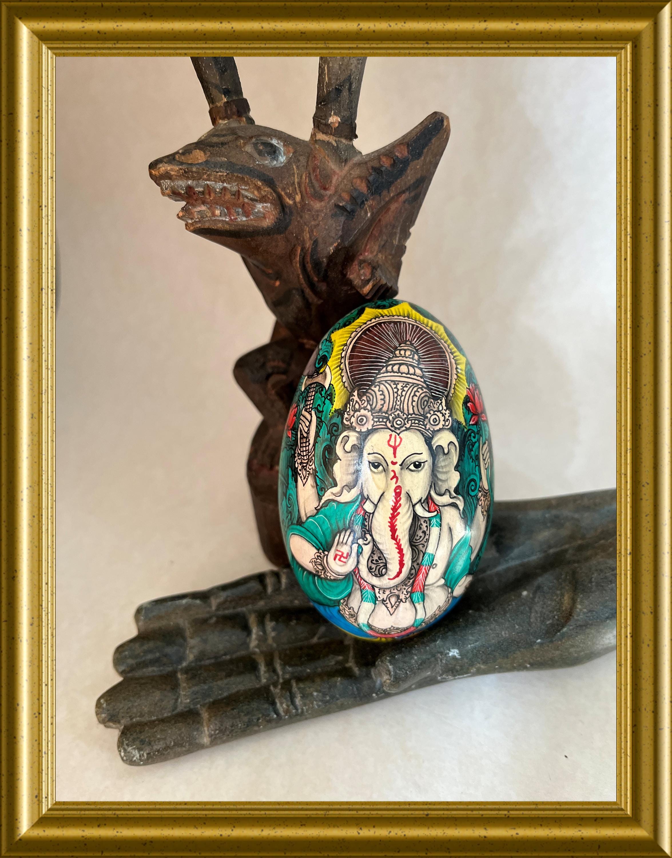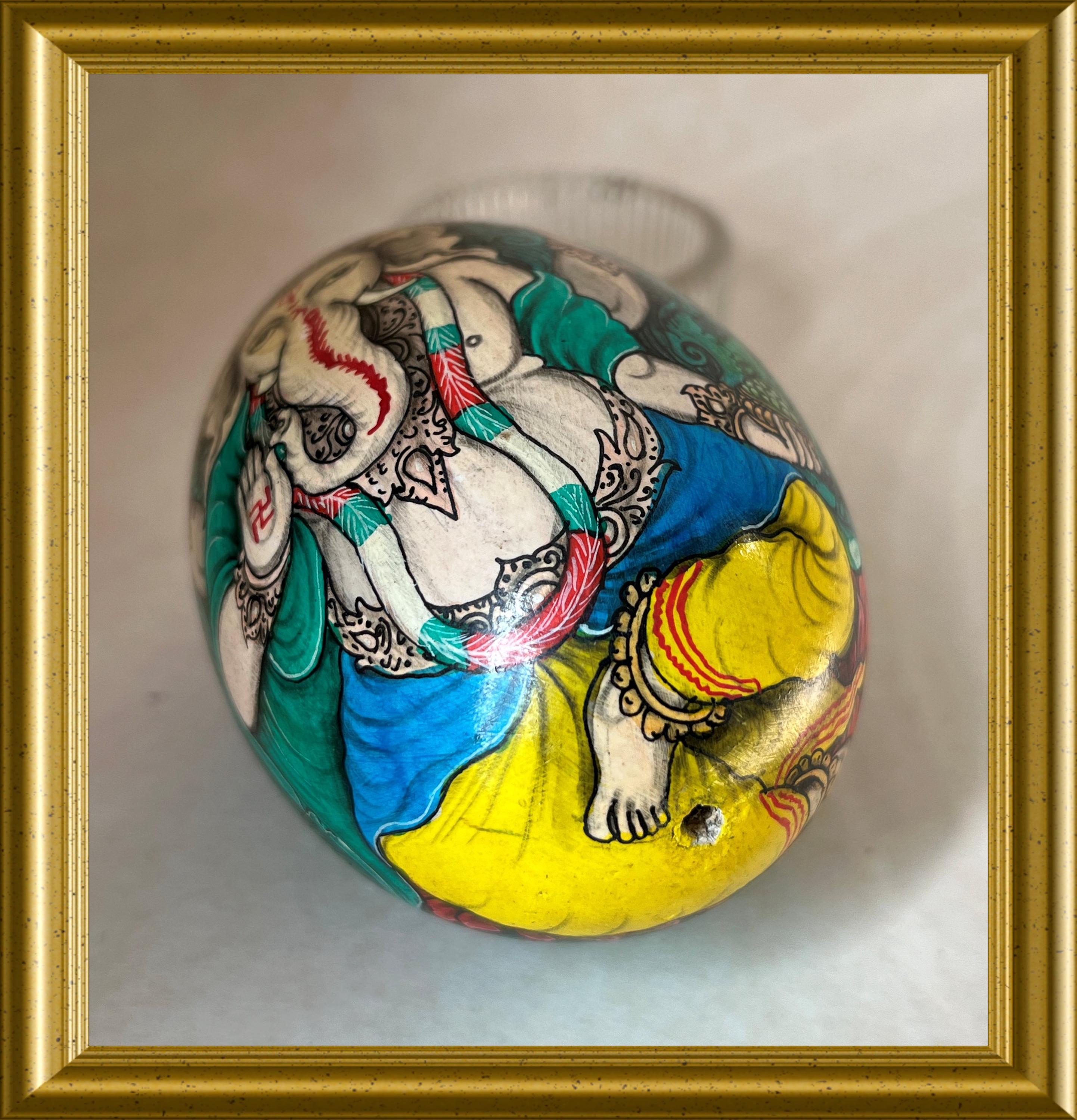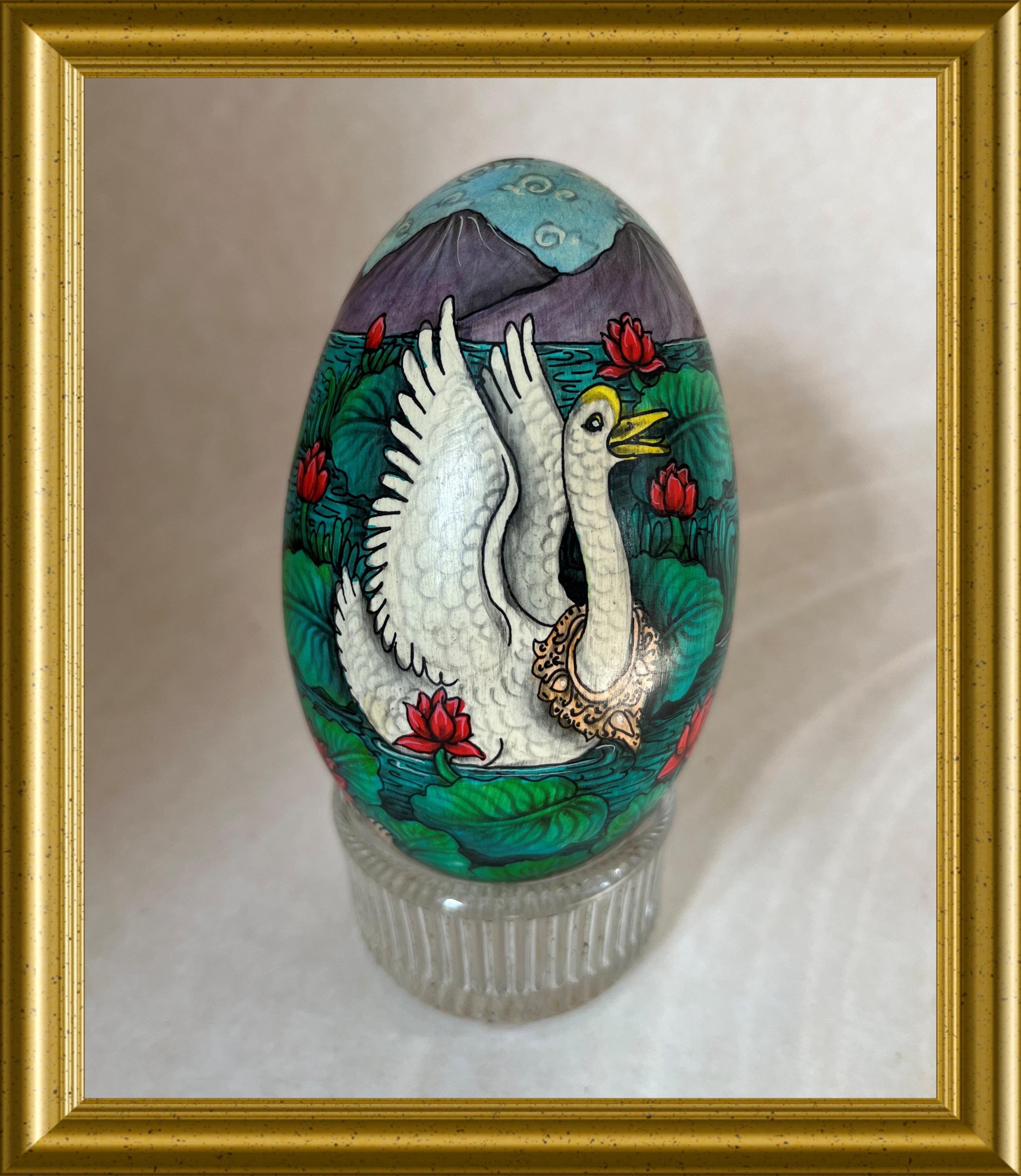 Vintage hand-painted wooden egg featuring a swan and Ganesha.