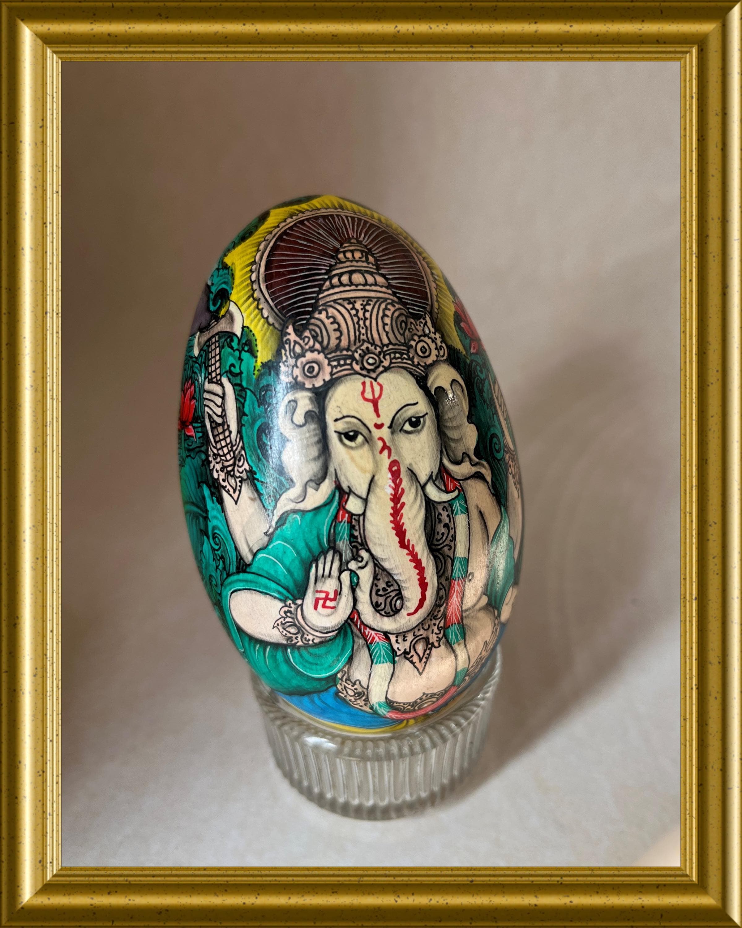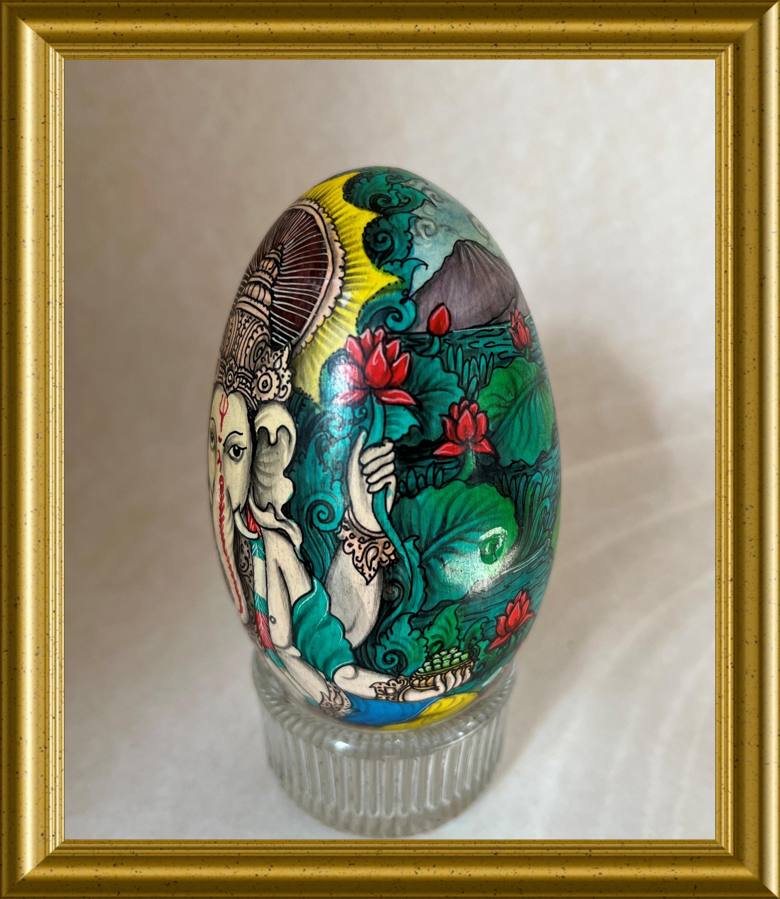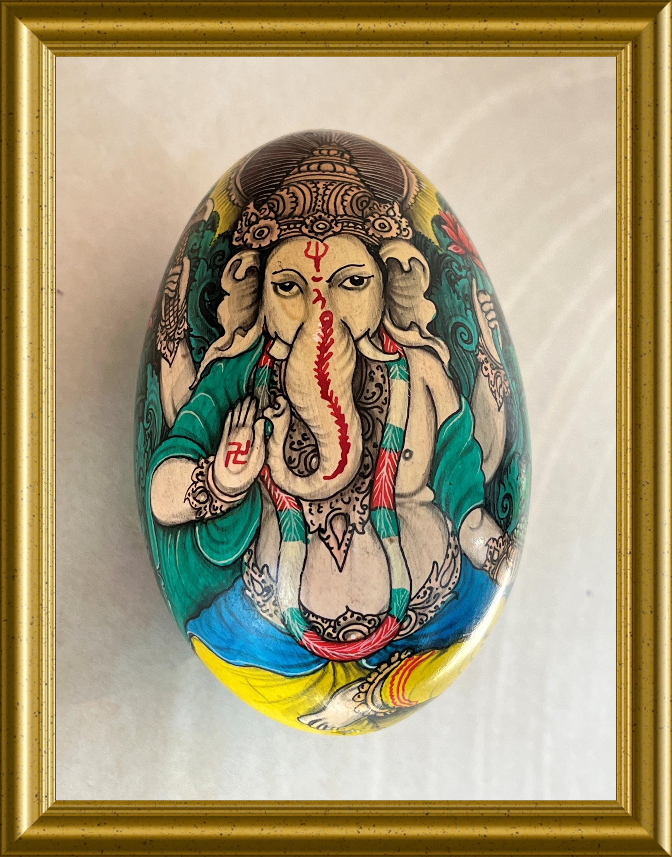 Vintage hand-painted wooden egg featuring a swan and Ganesha.
