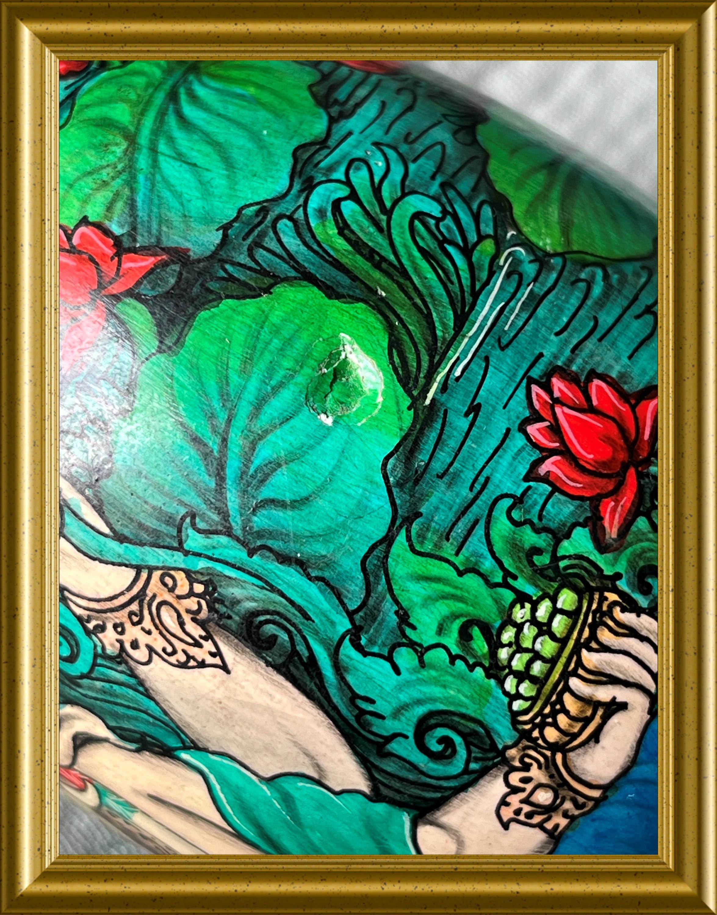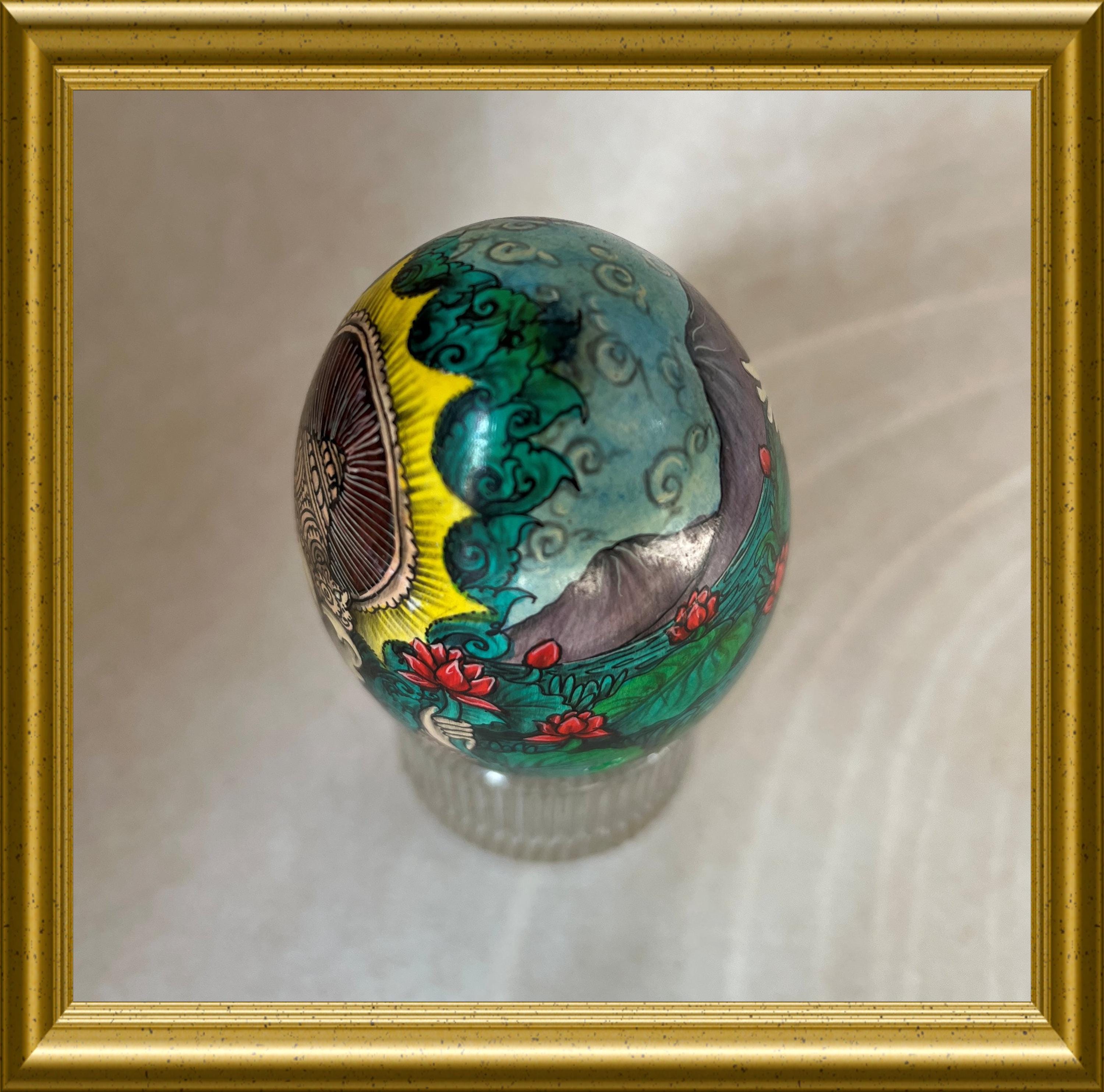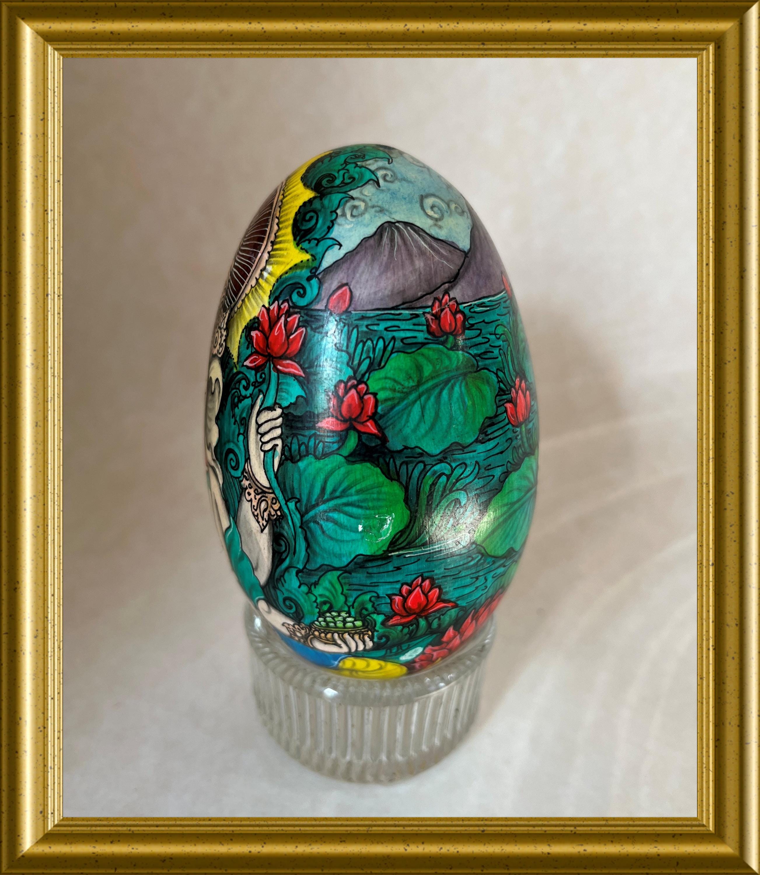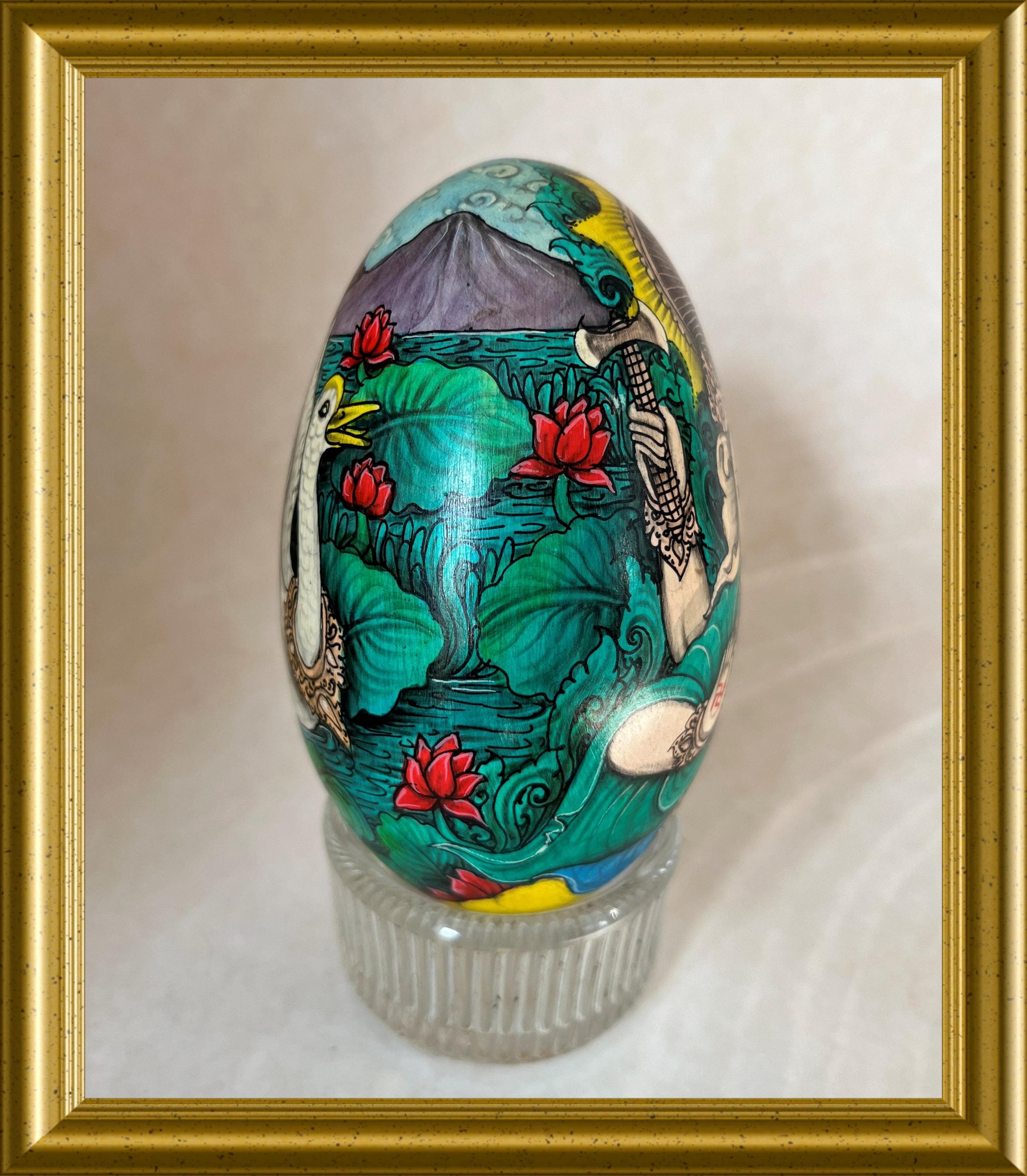 Vintage hand-painted wooden egg featuring a swan and Ganesha.