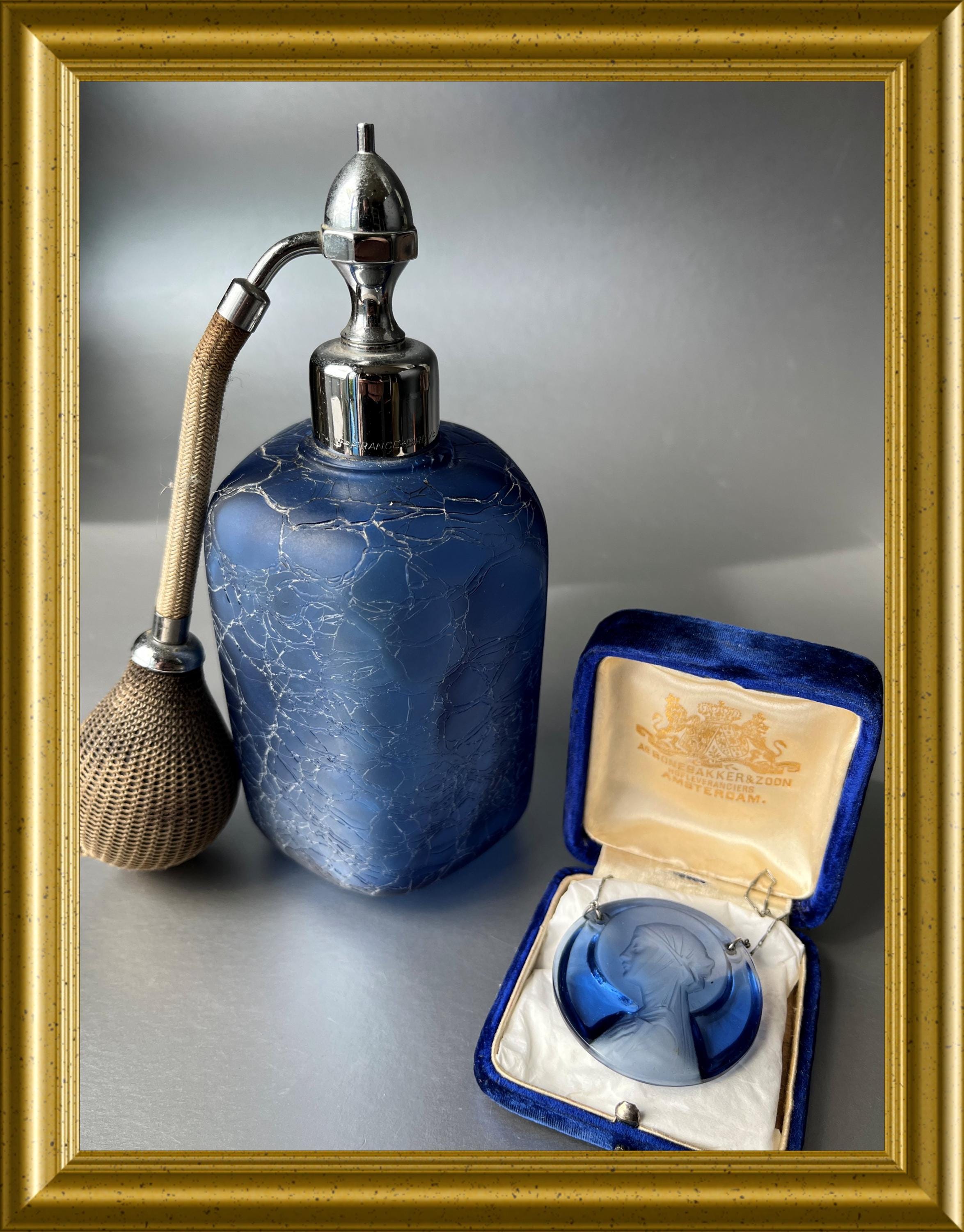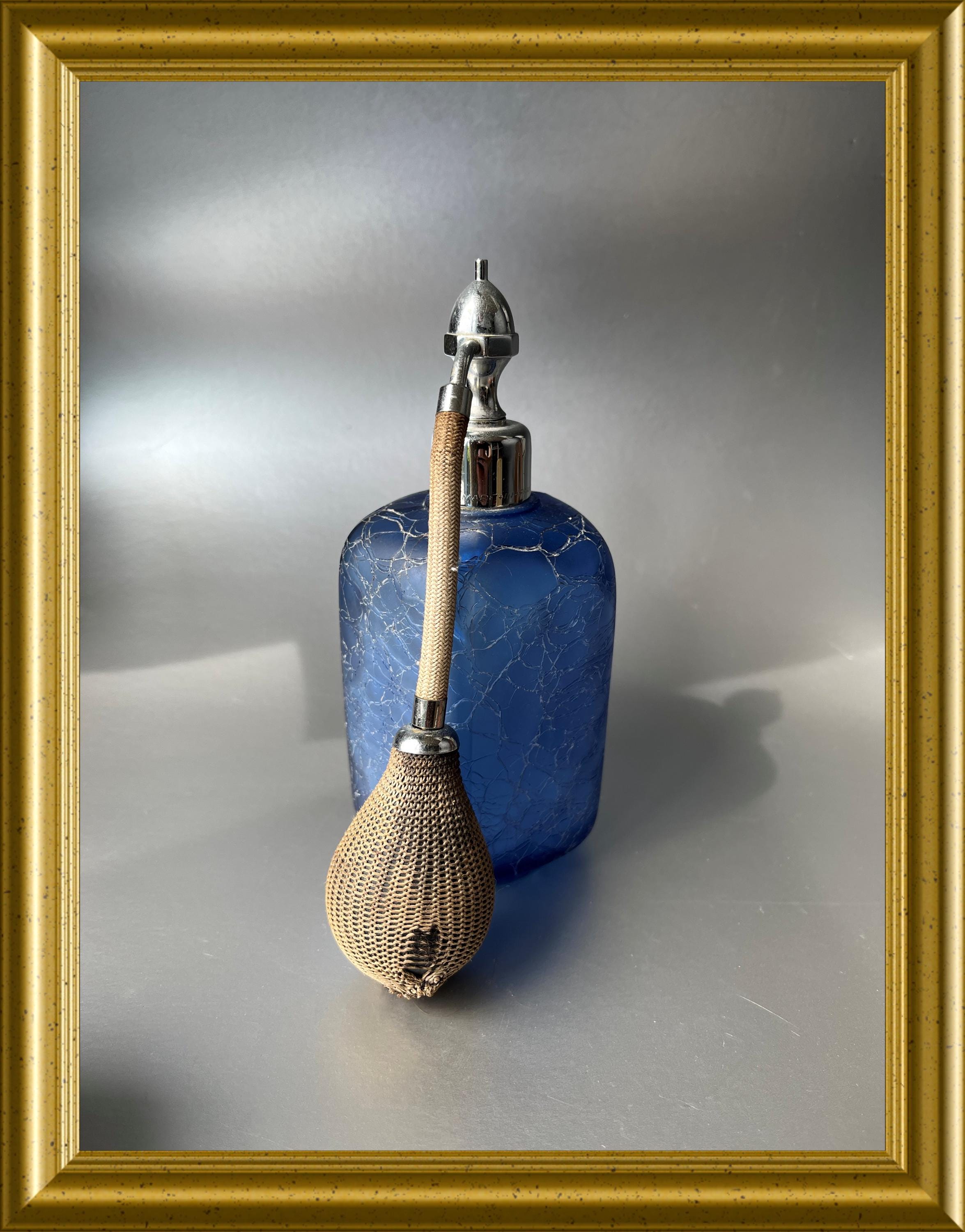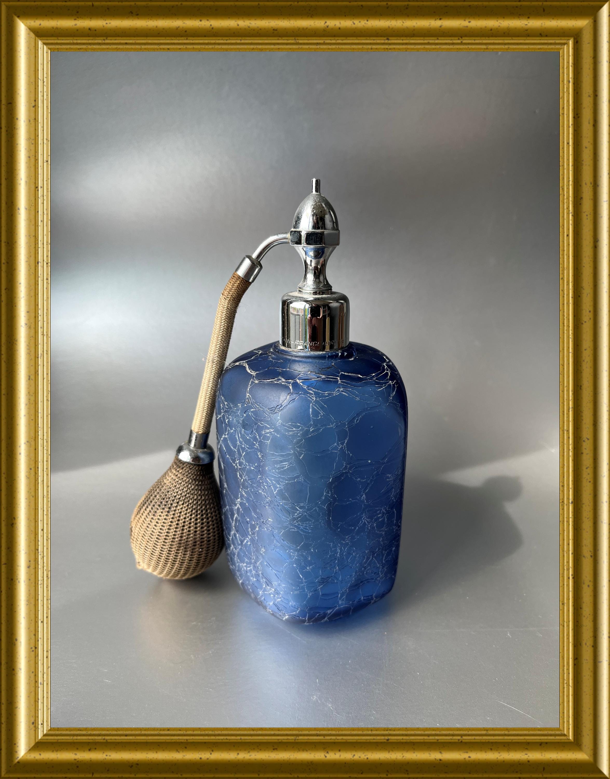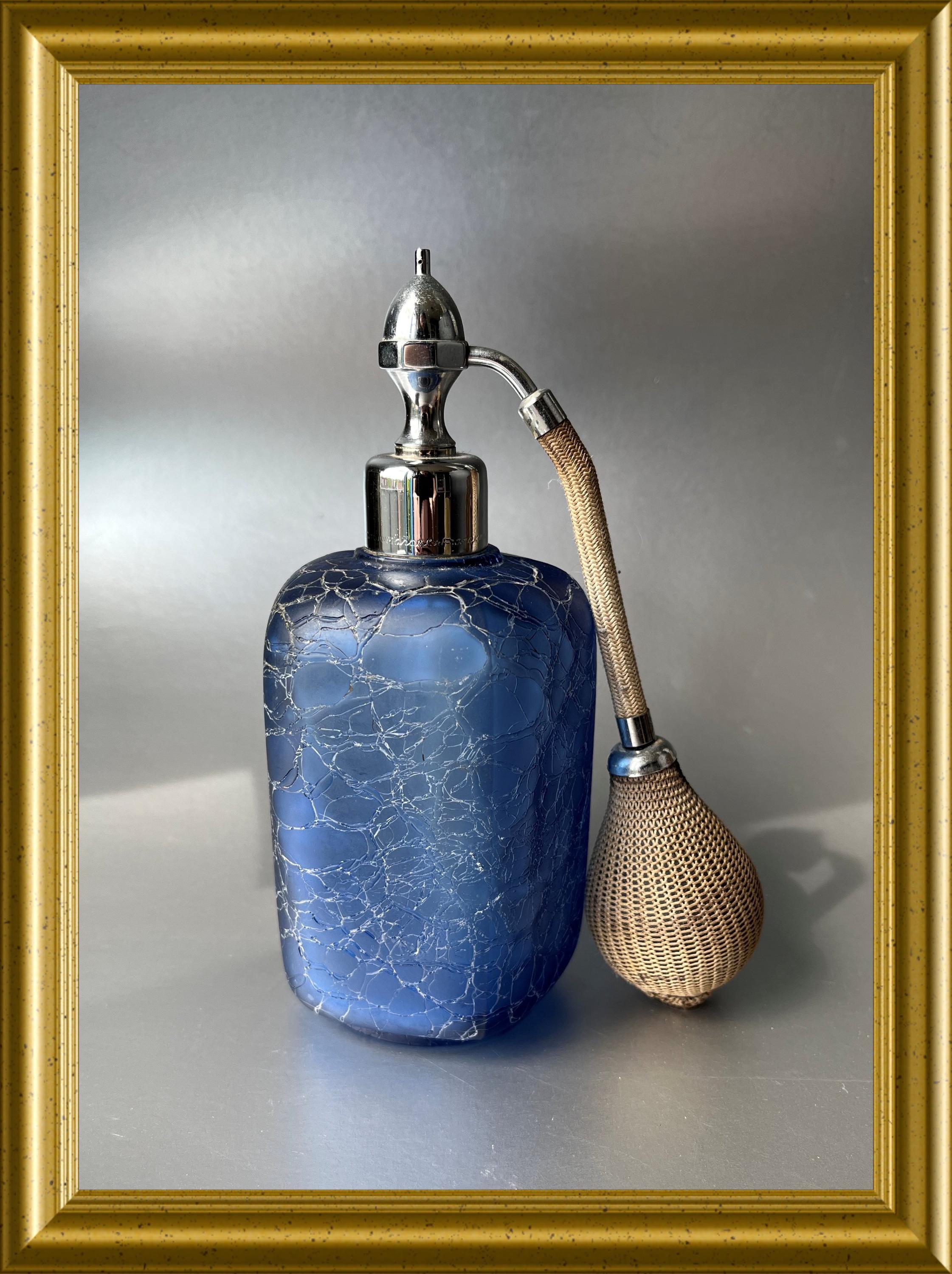 Lovely blue crackle glass perfume bottle atomizer : Marcel Franck.