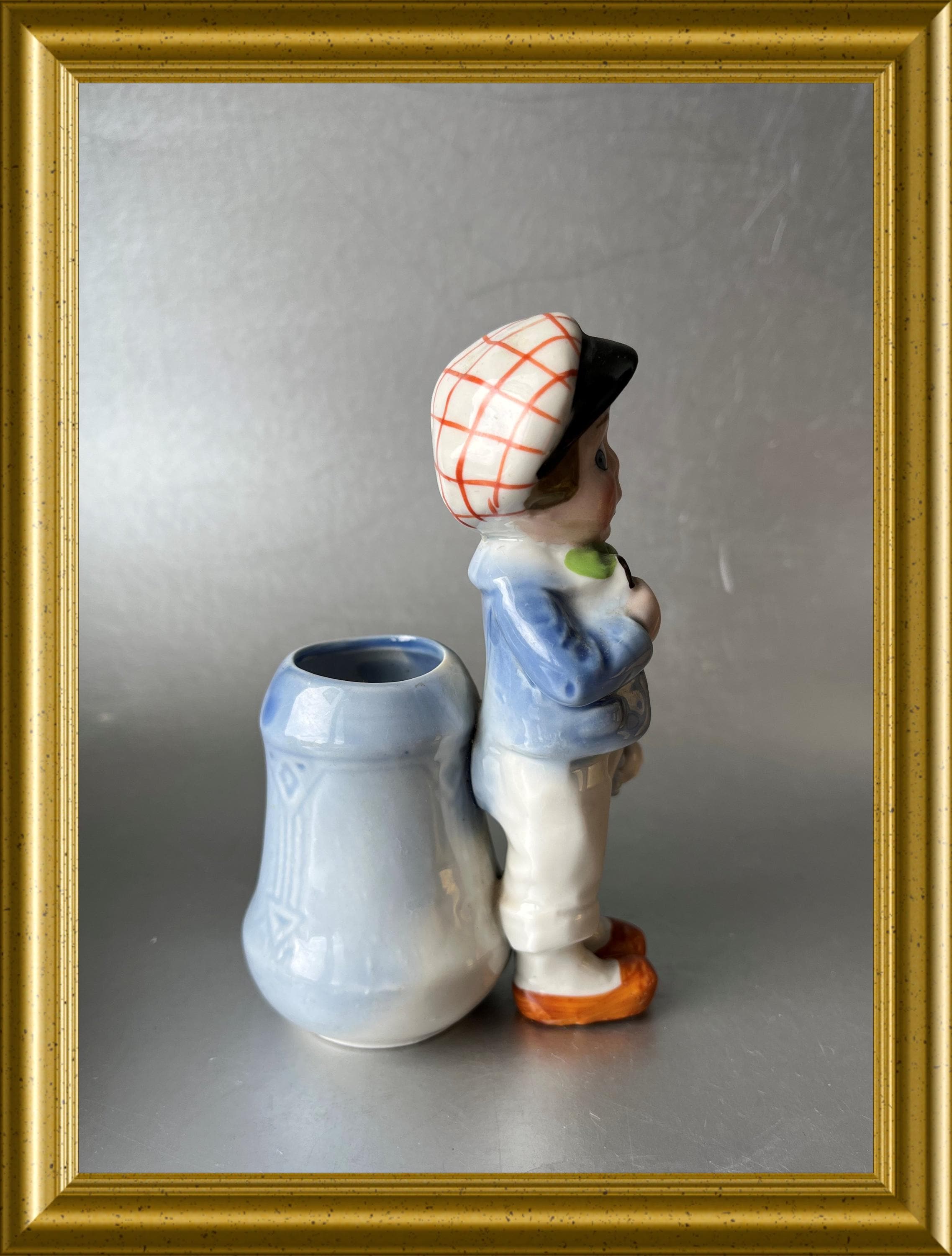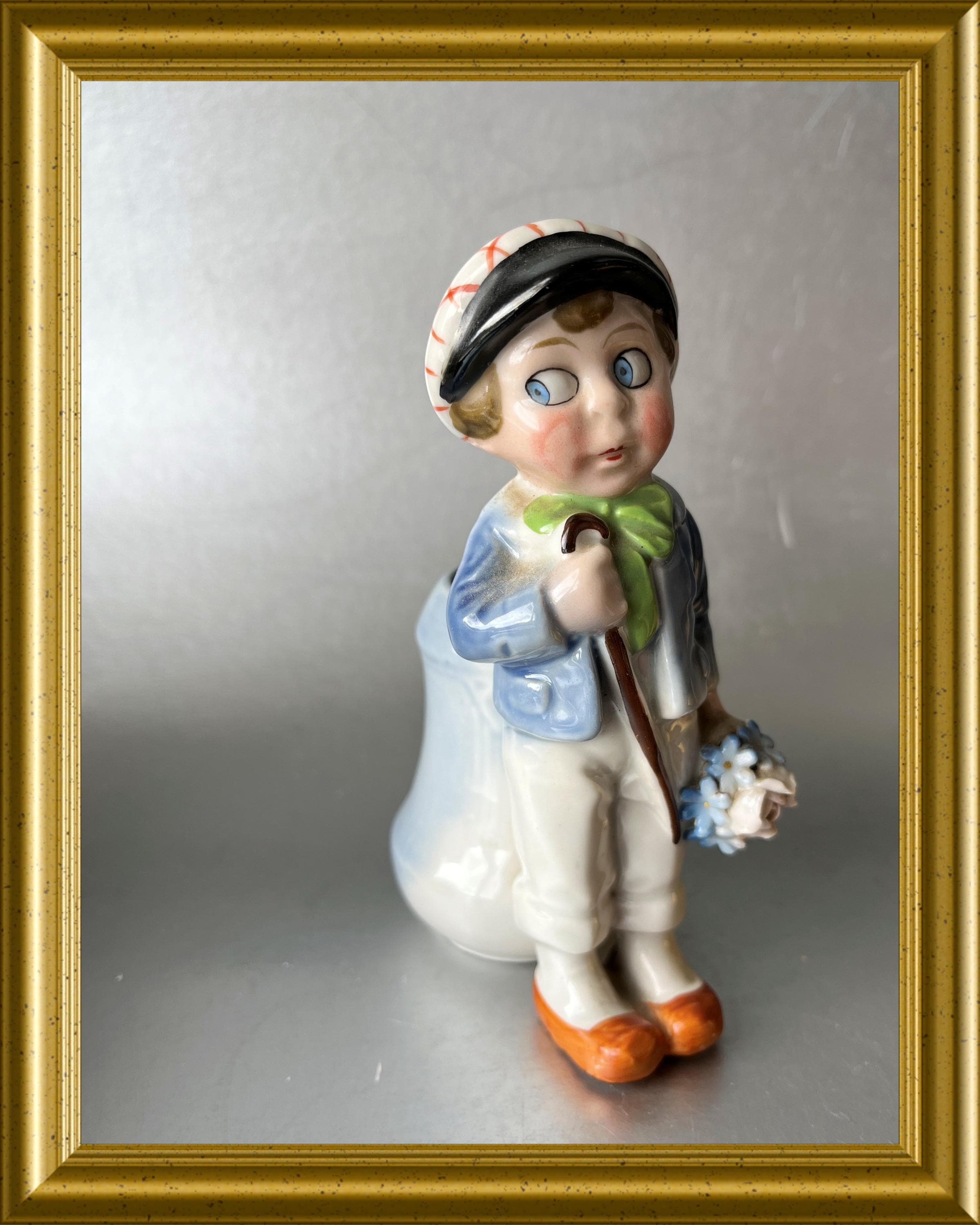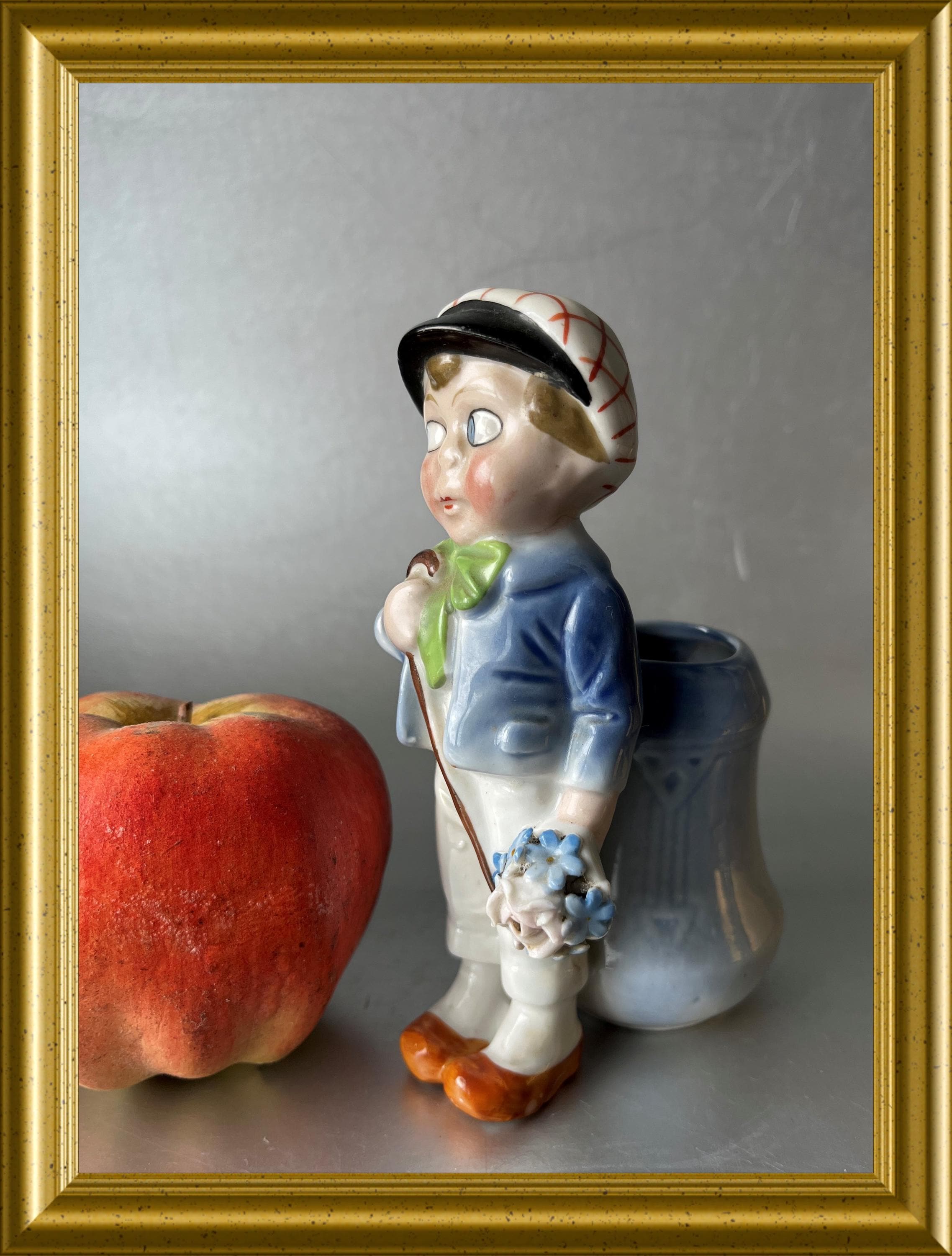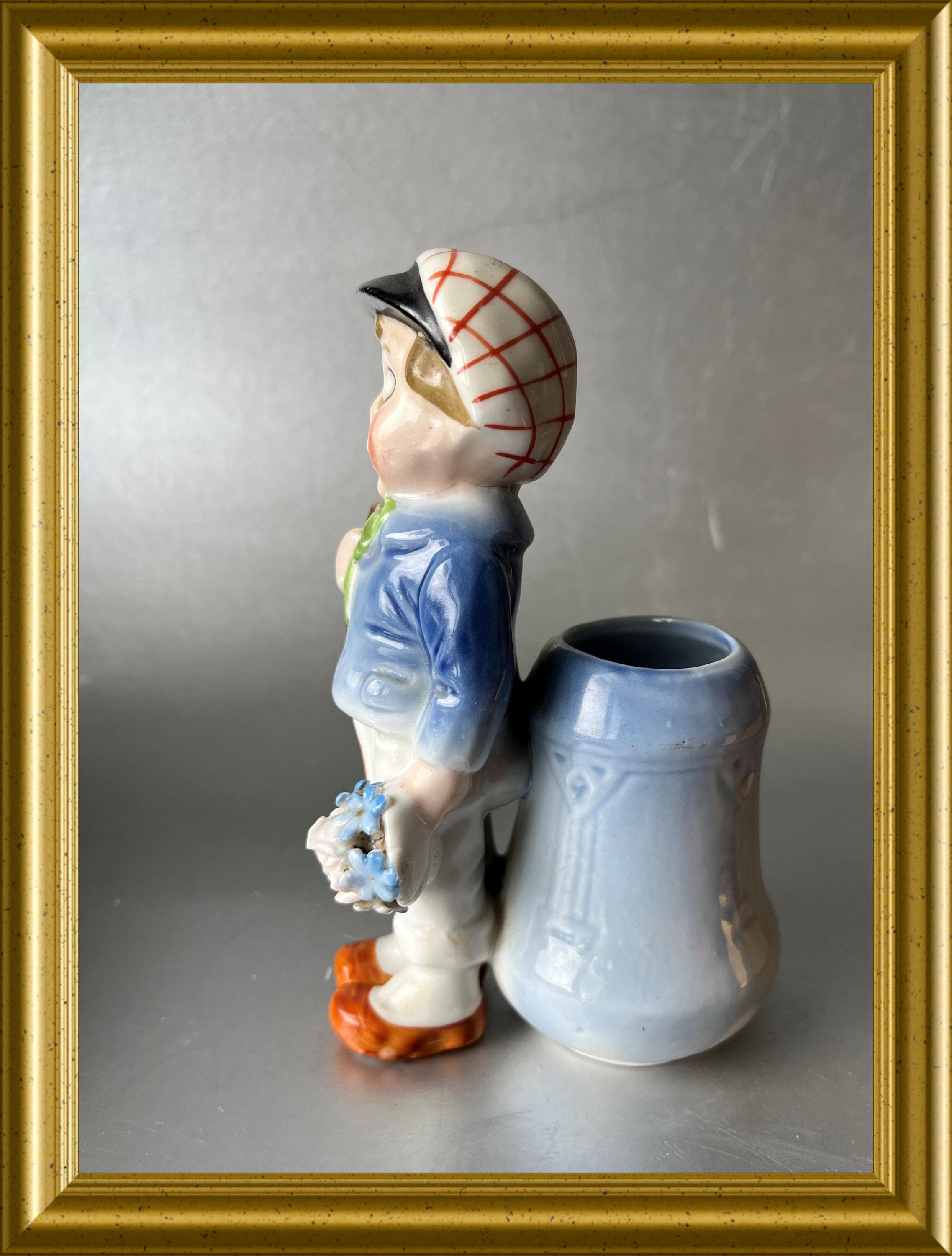 Lovely vintage porcelain figurine with small vase, 20's, googley eyes.