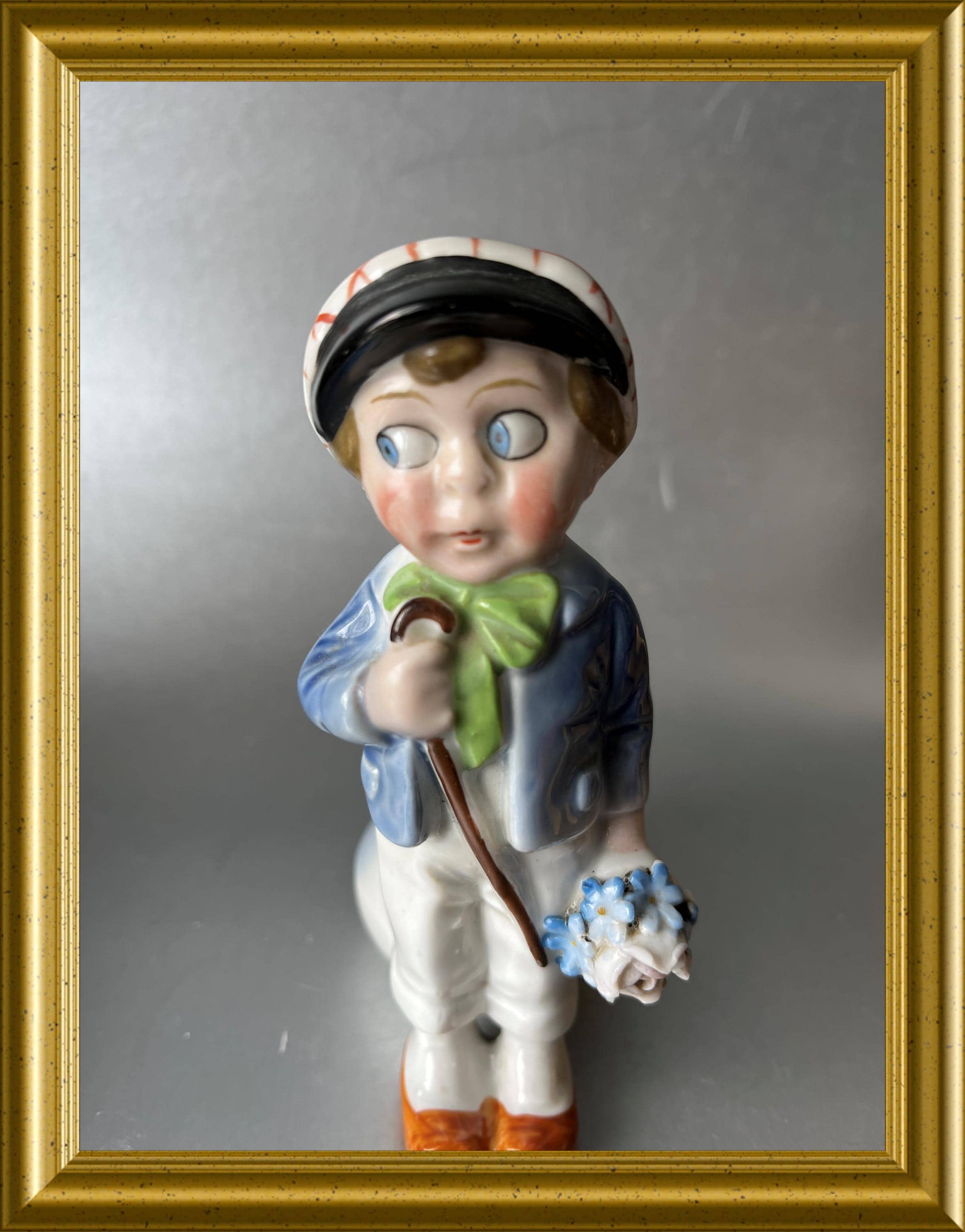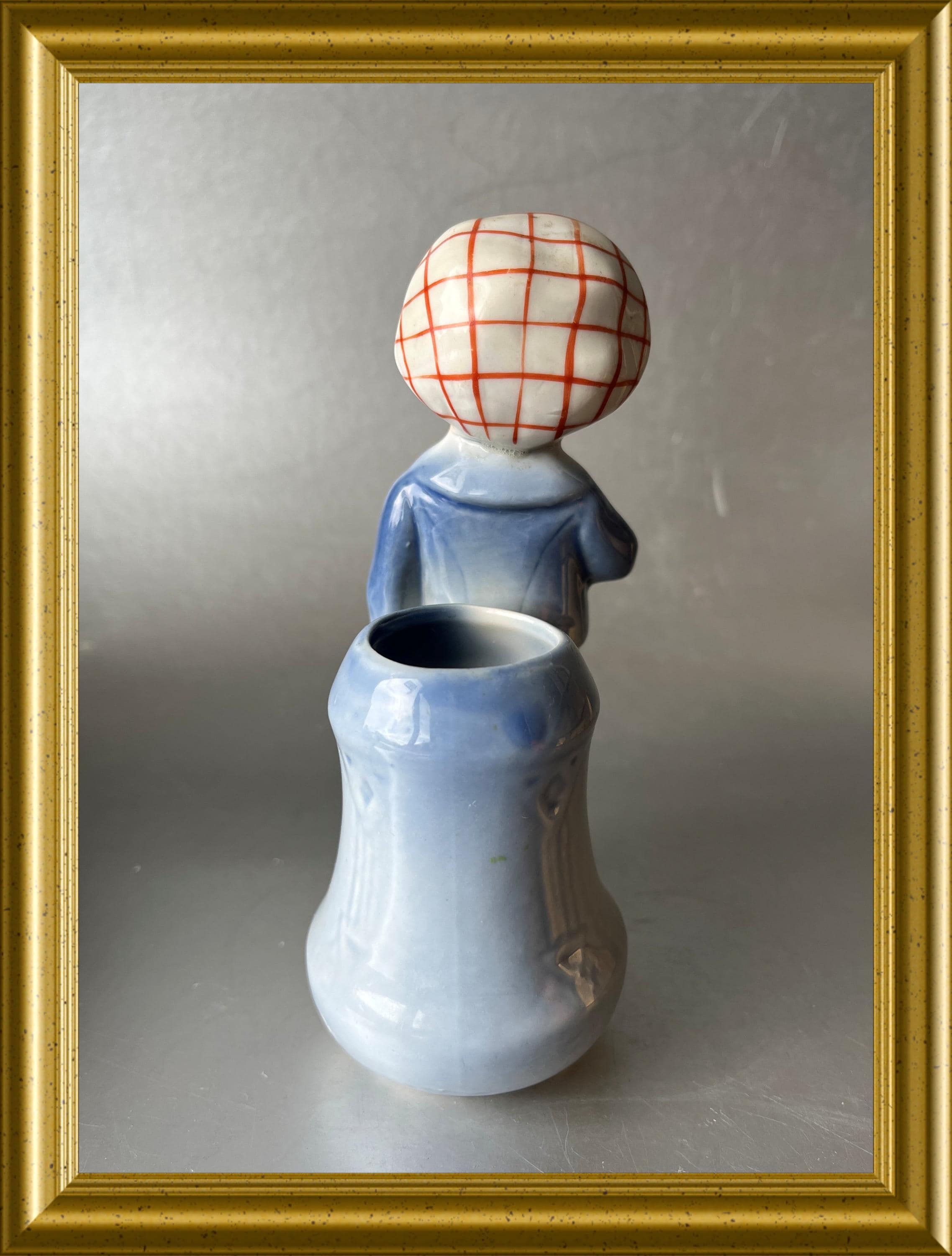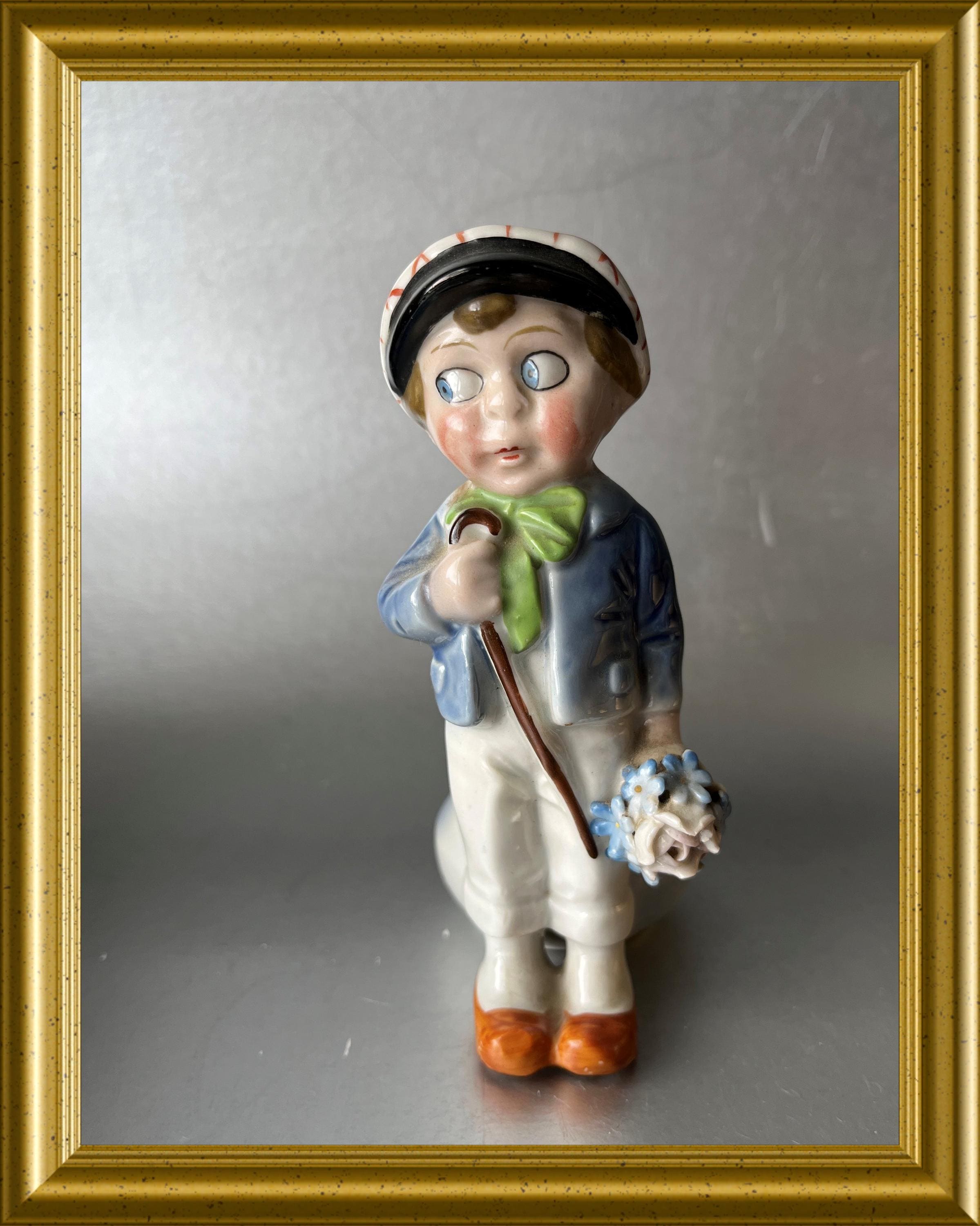 Lovely vintage porcelain figurine with small vase, 20's, googley eyes.