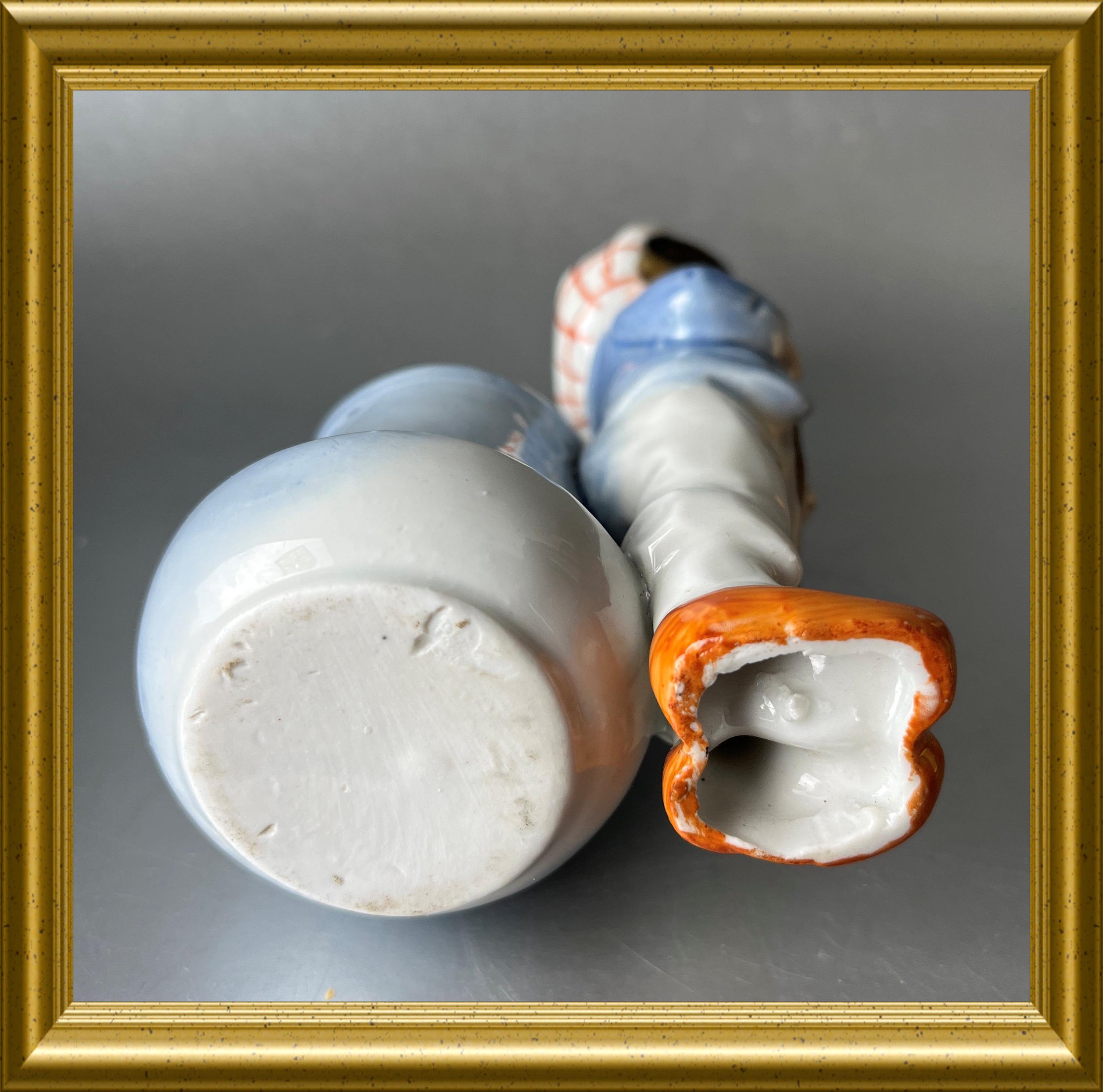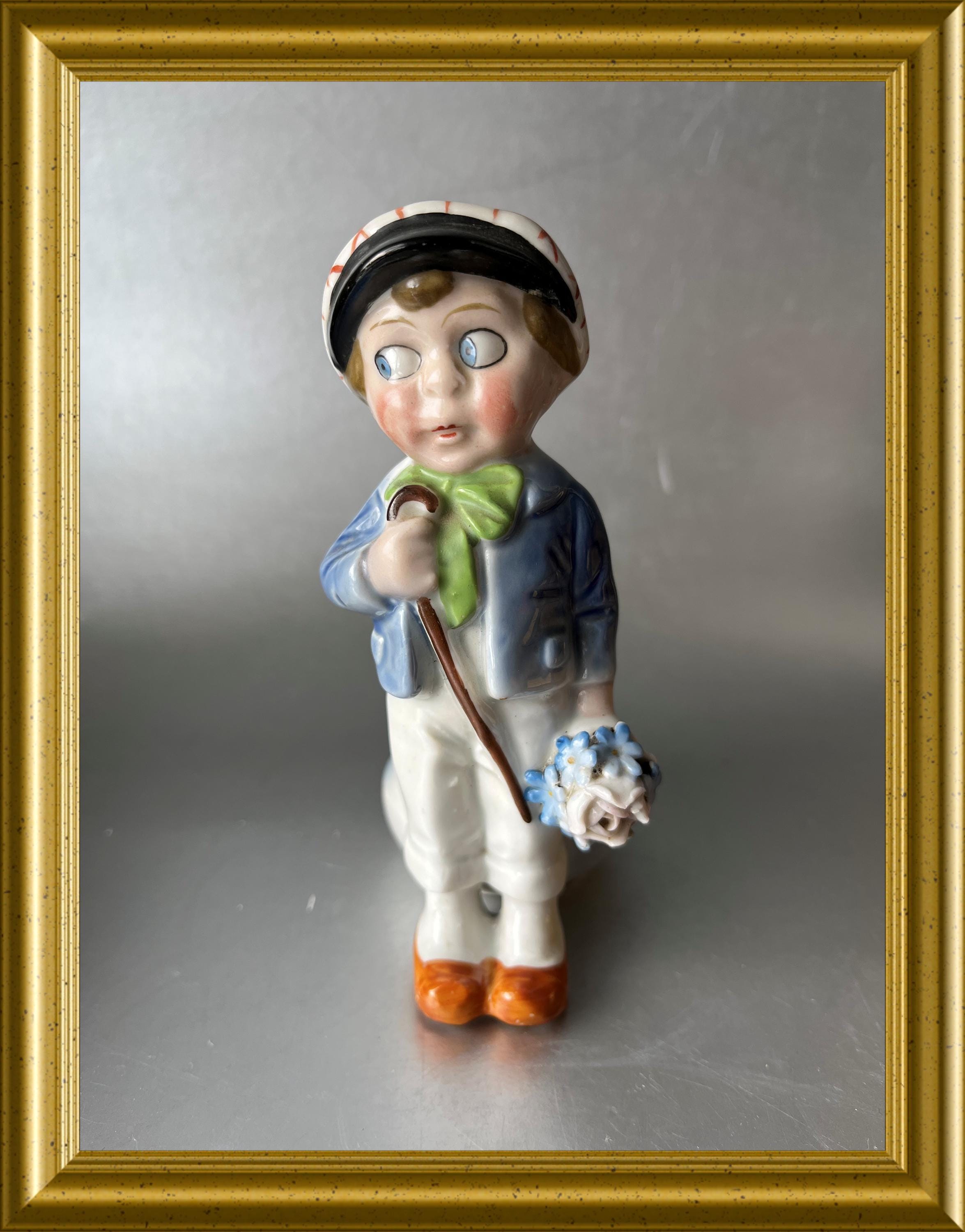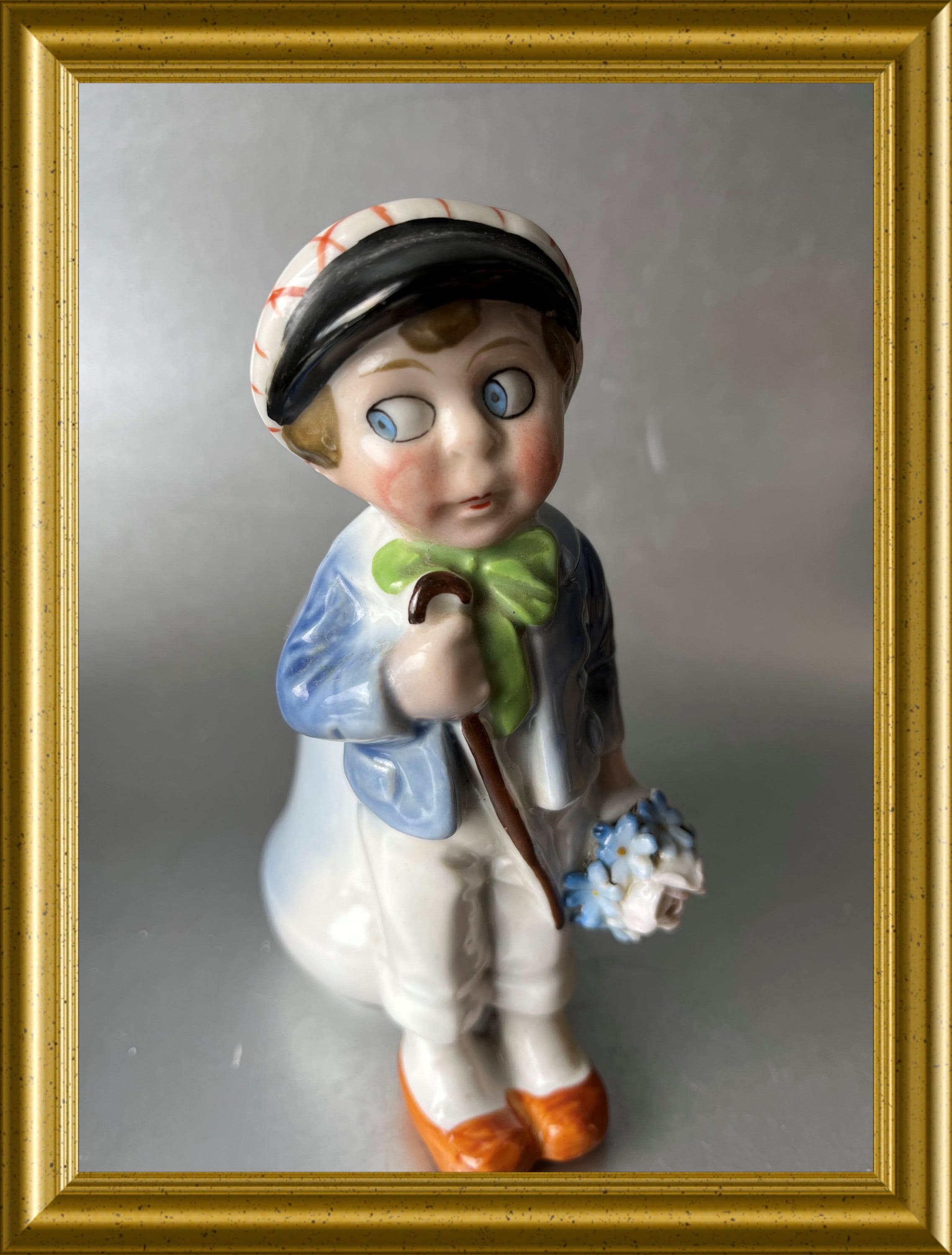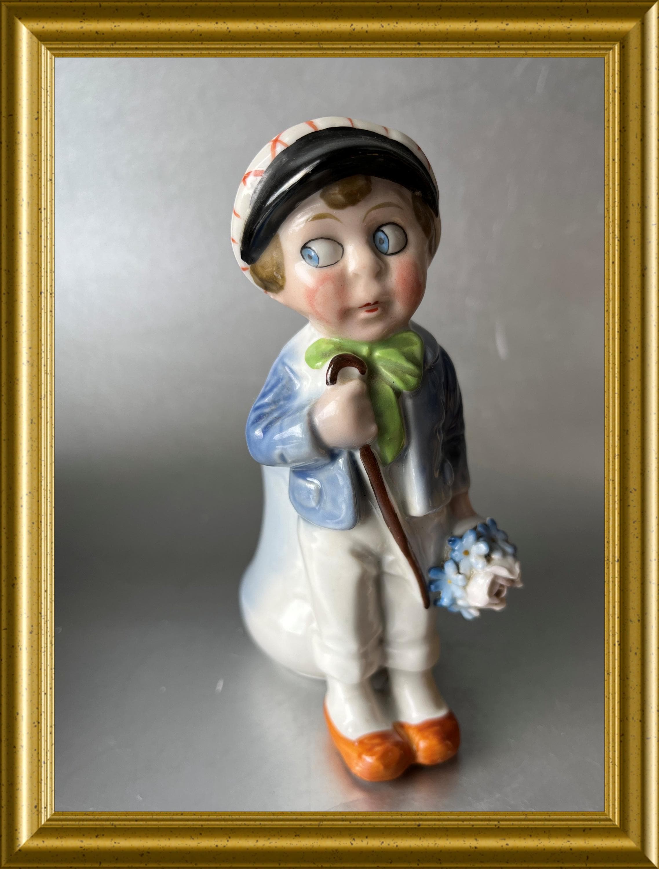 Lovely vintage porcelain figurine with small vase, 20's, googley eyes.