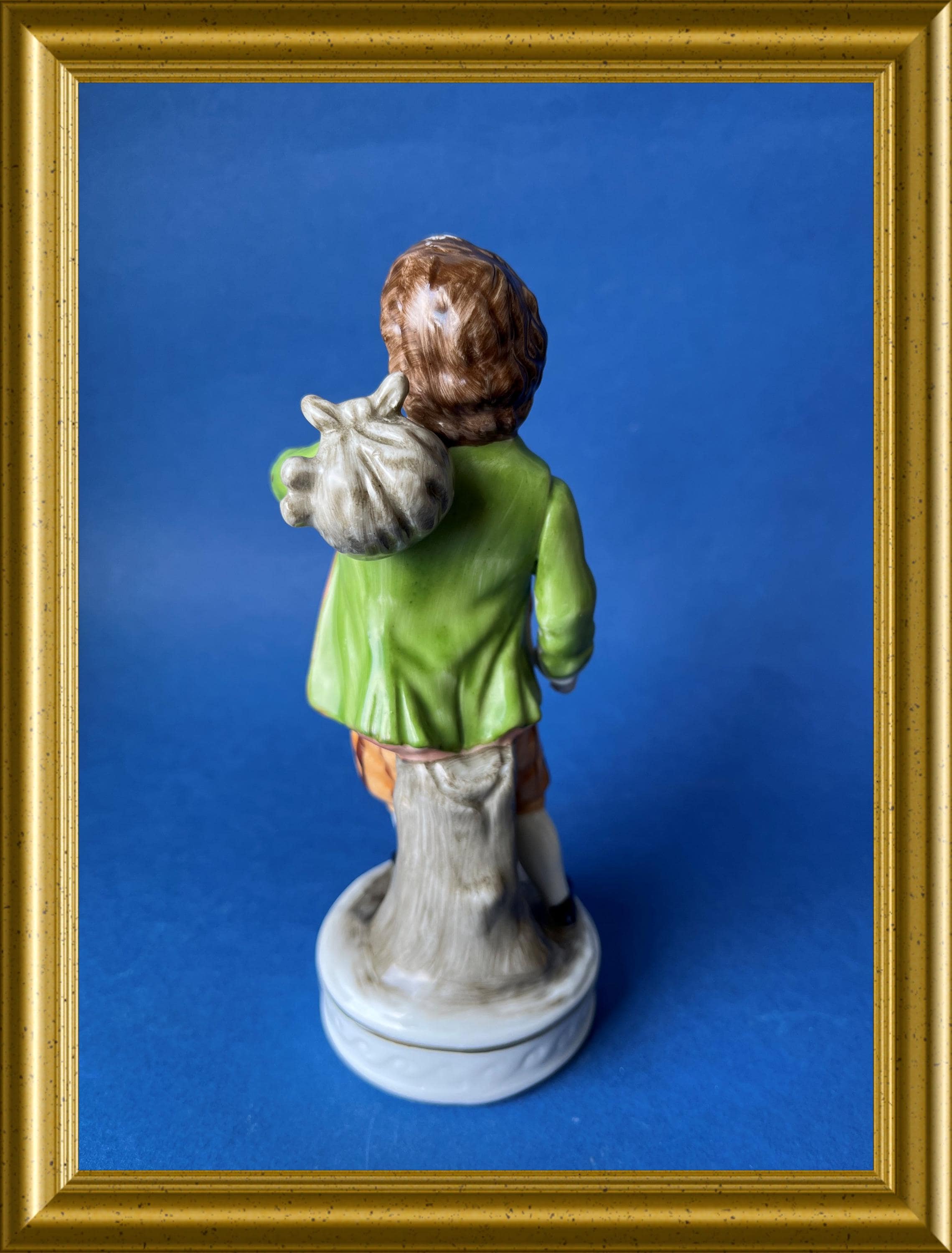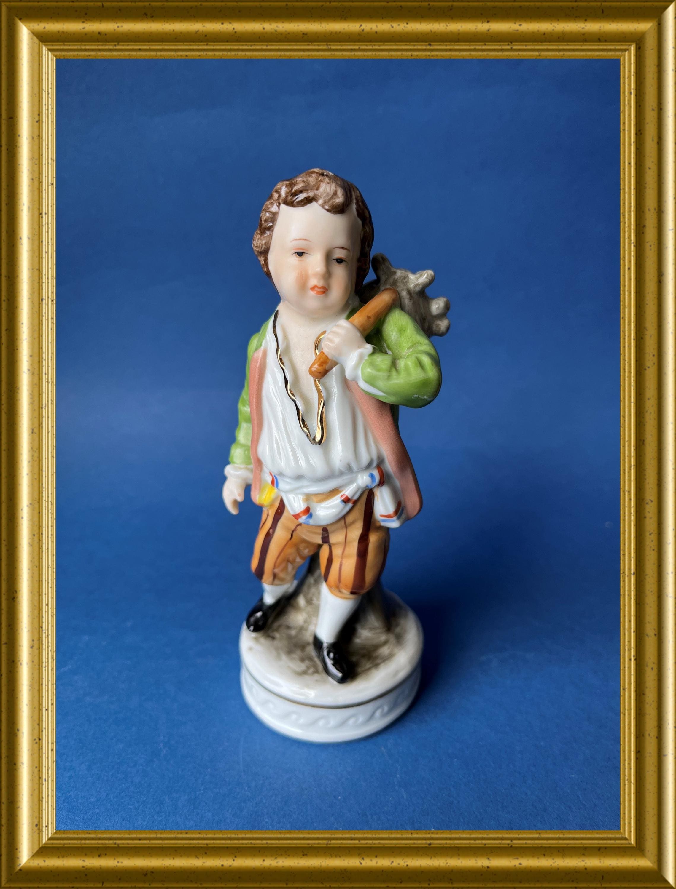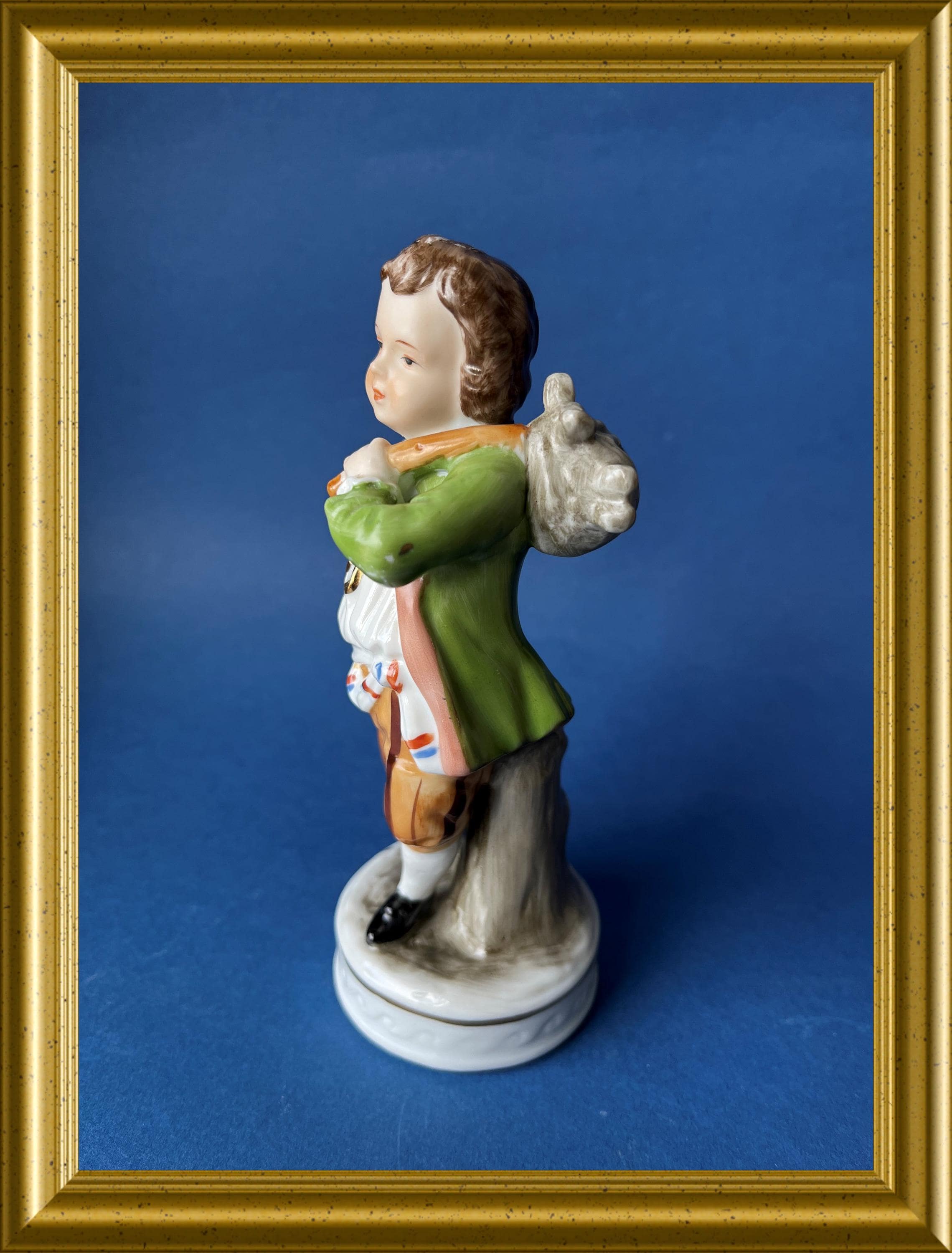A charming old porcelain figurine depicting a boy carrying a knapsack, bindle.