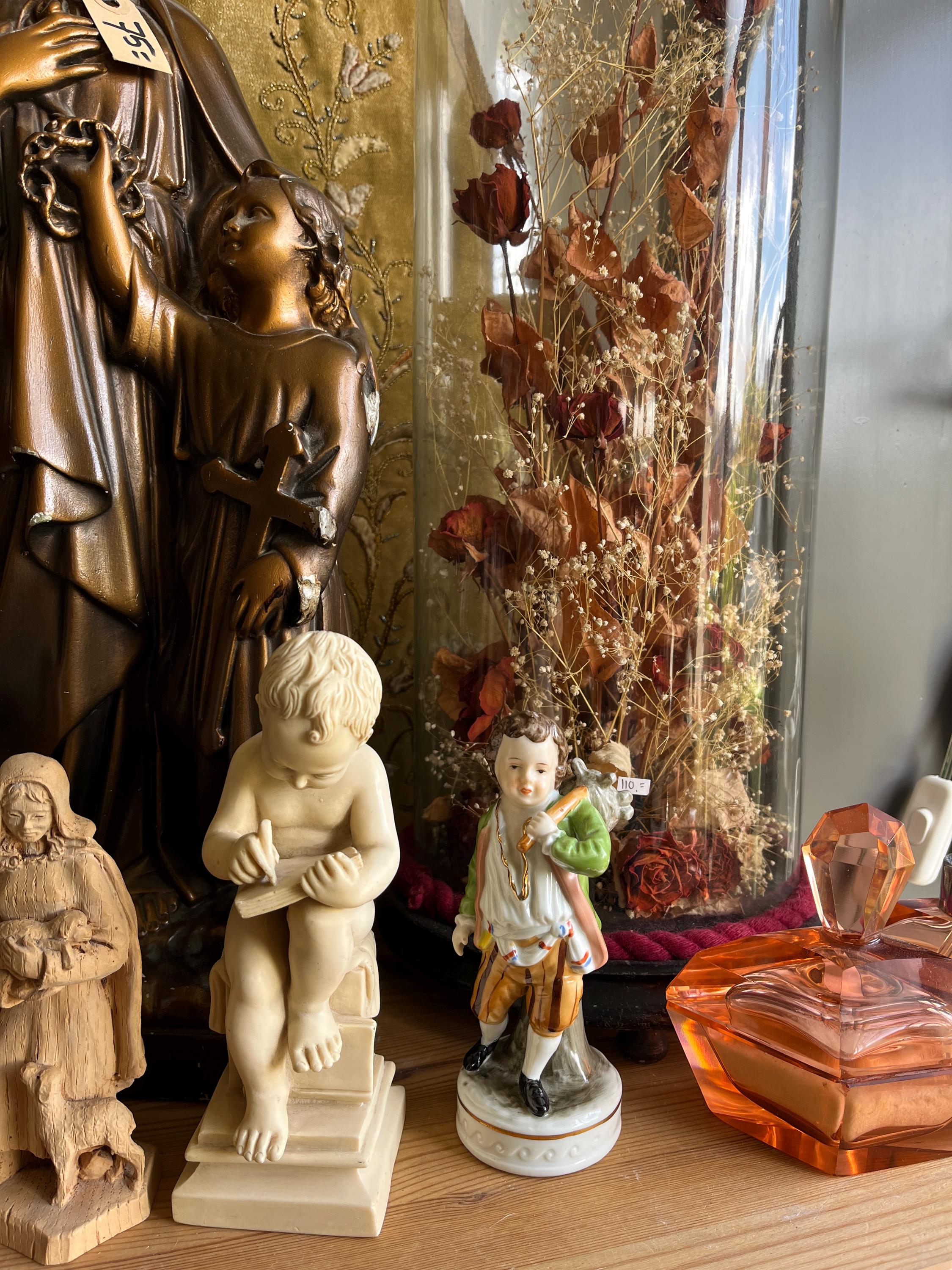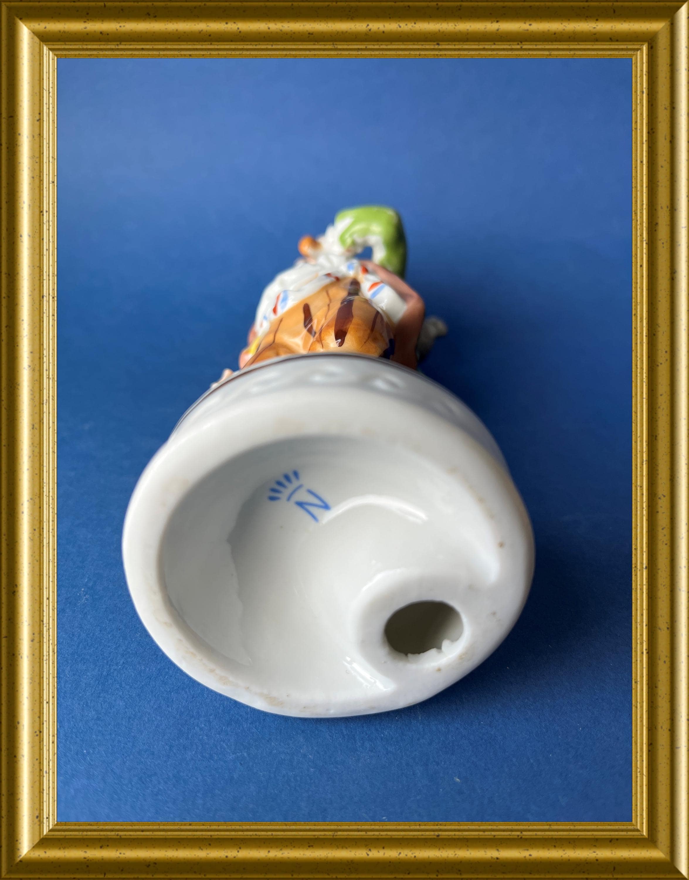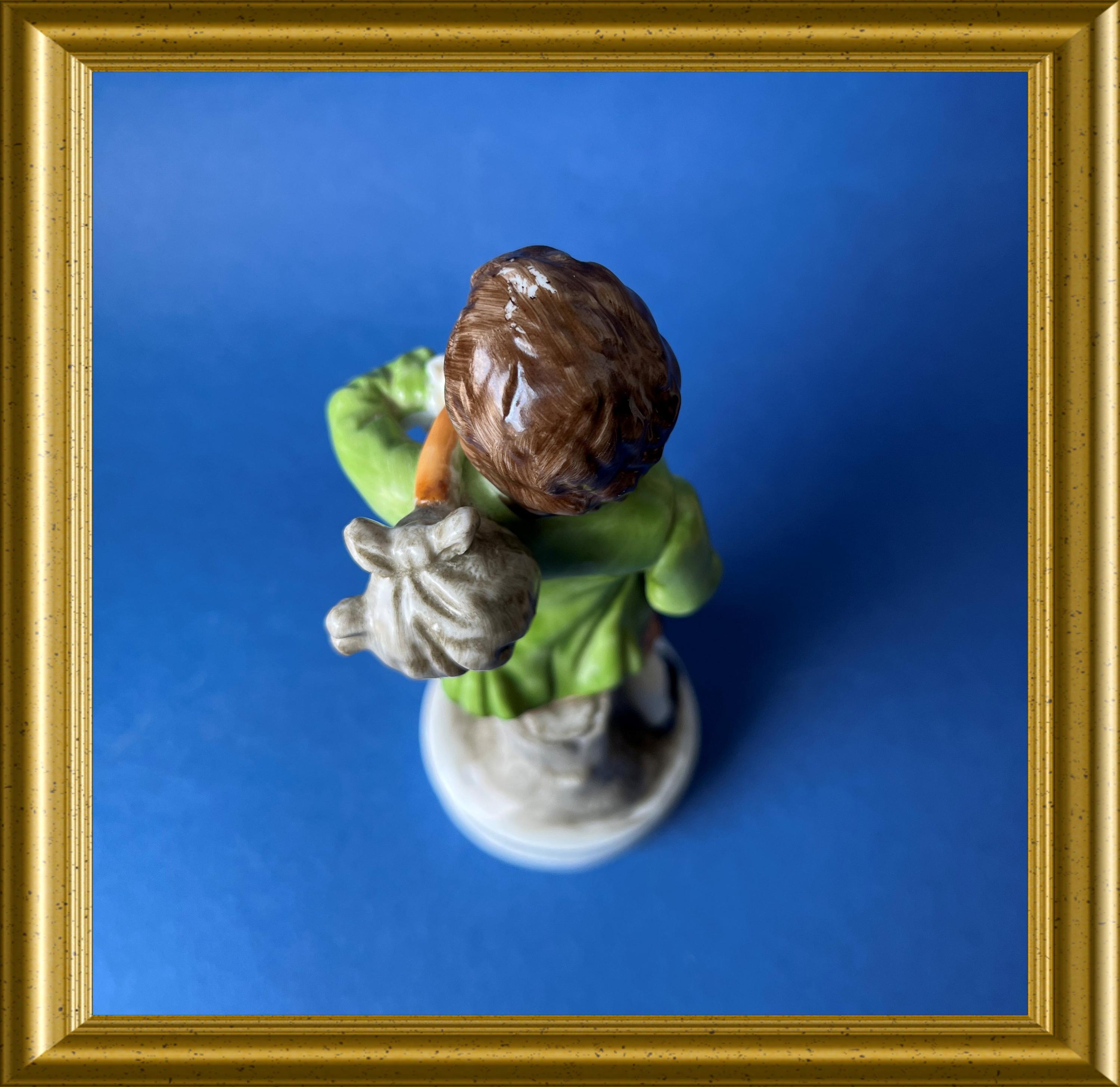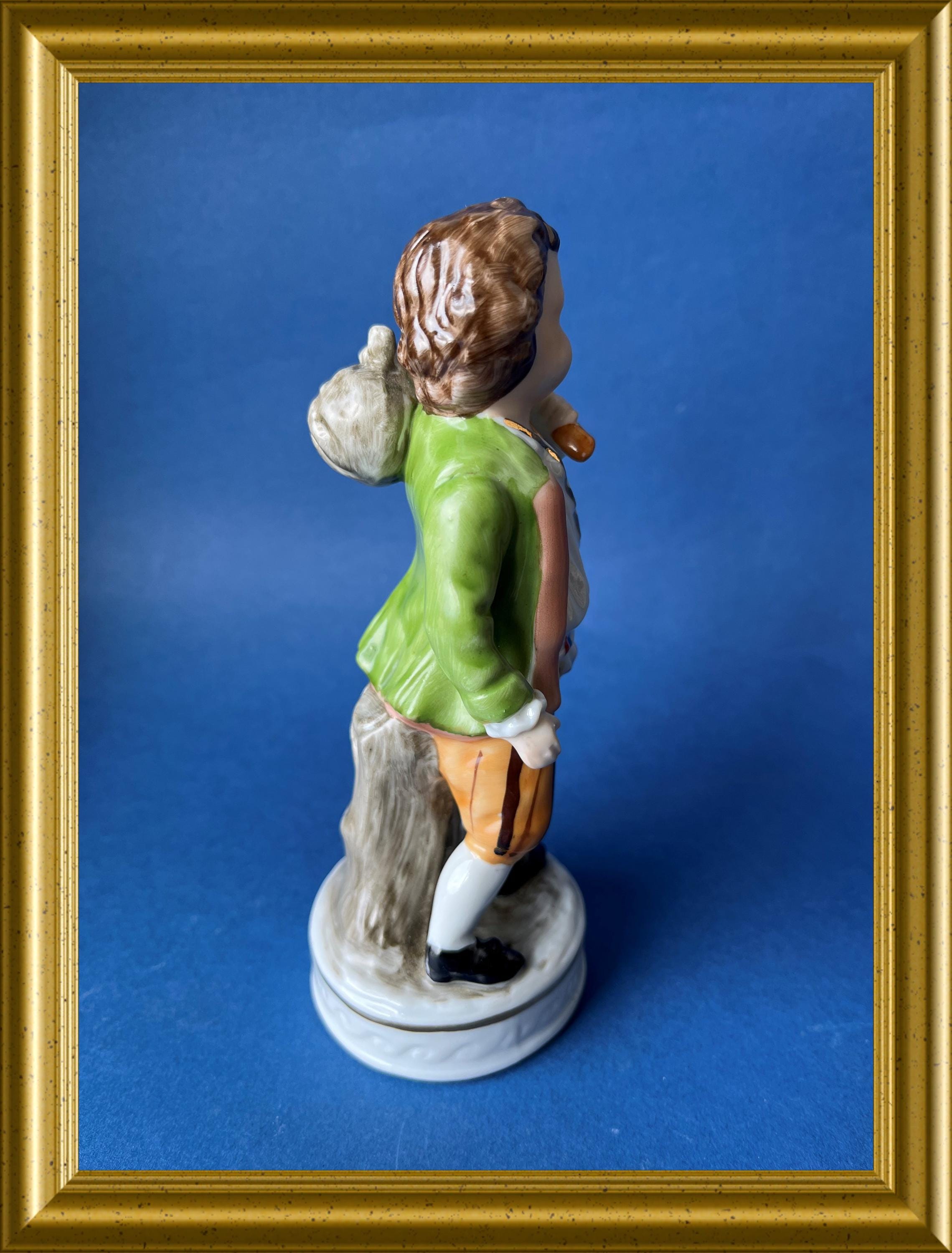 A charming old porcelain figurine depicting a boy carrying a knapsack, bindle.
