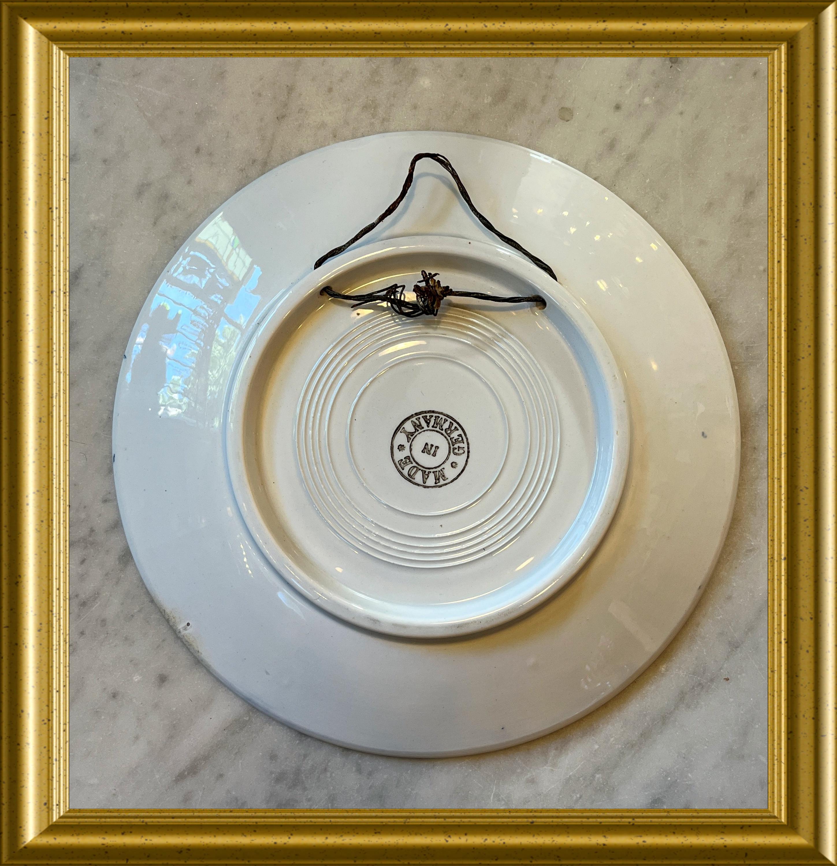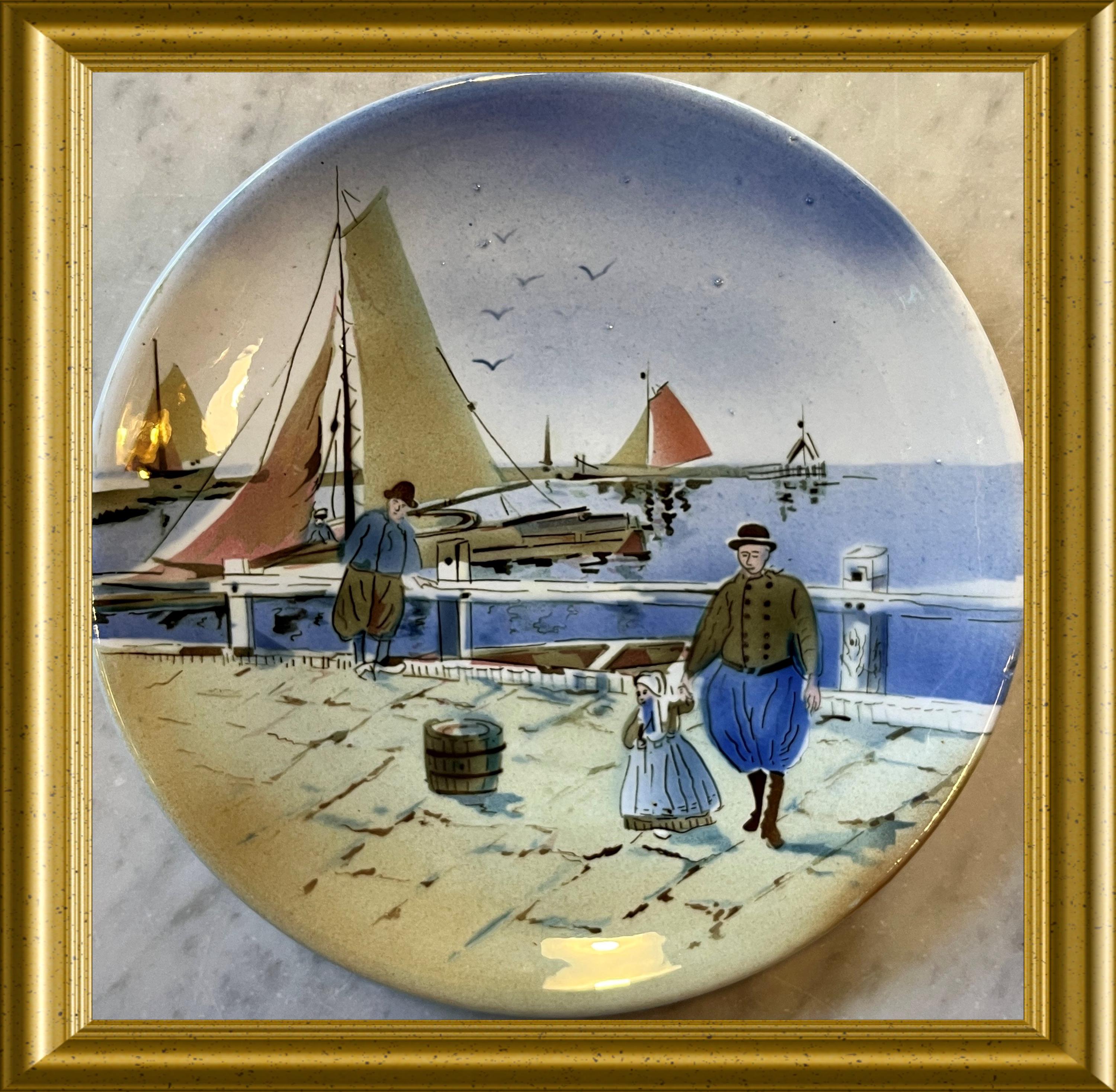 A vintage ceramic plate featuring a motif of traditional costume and a sailboat.
