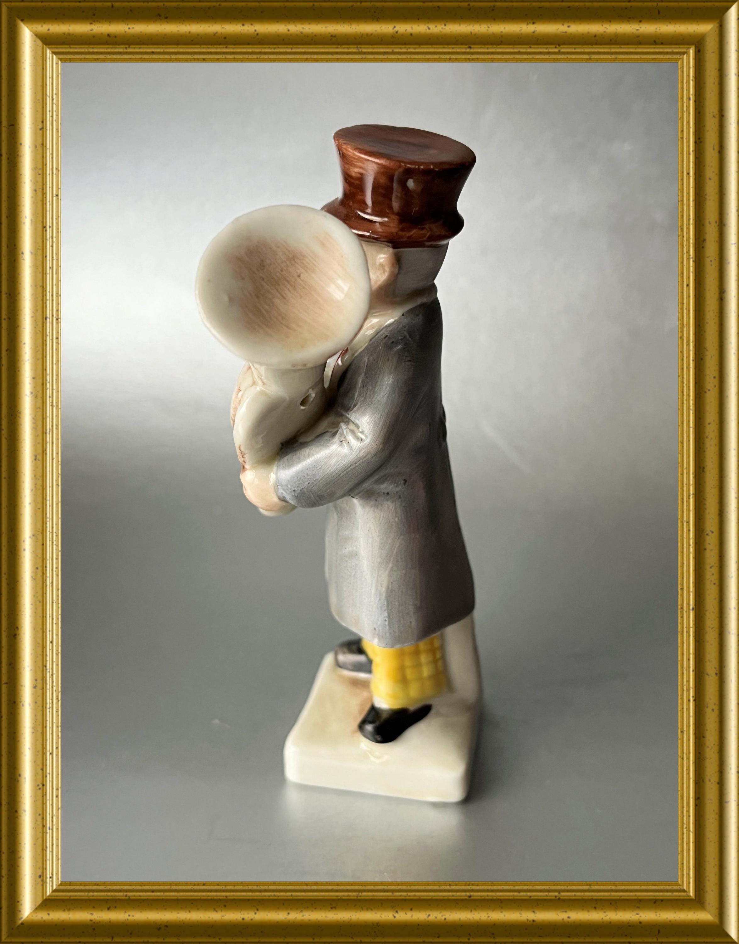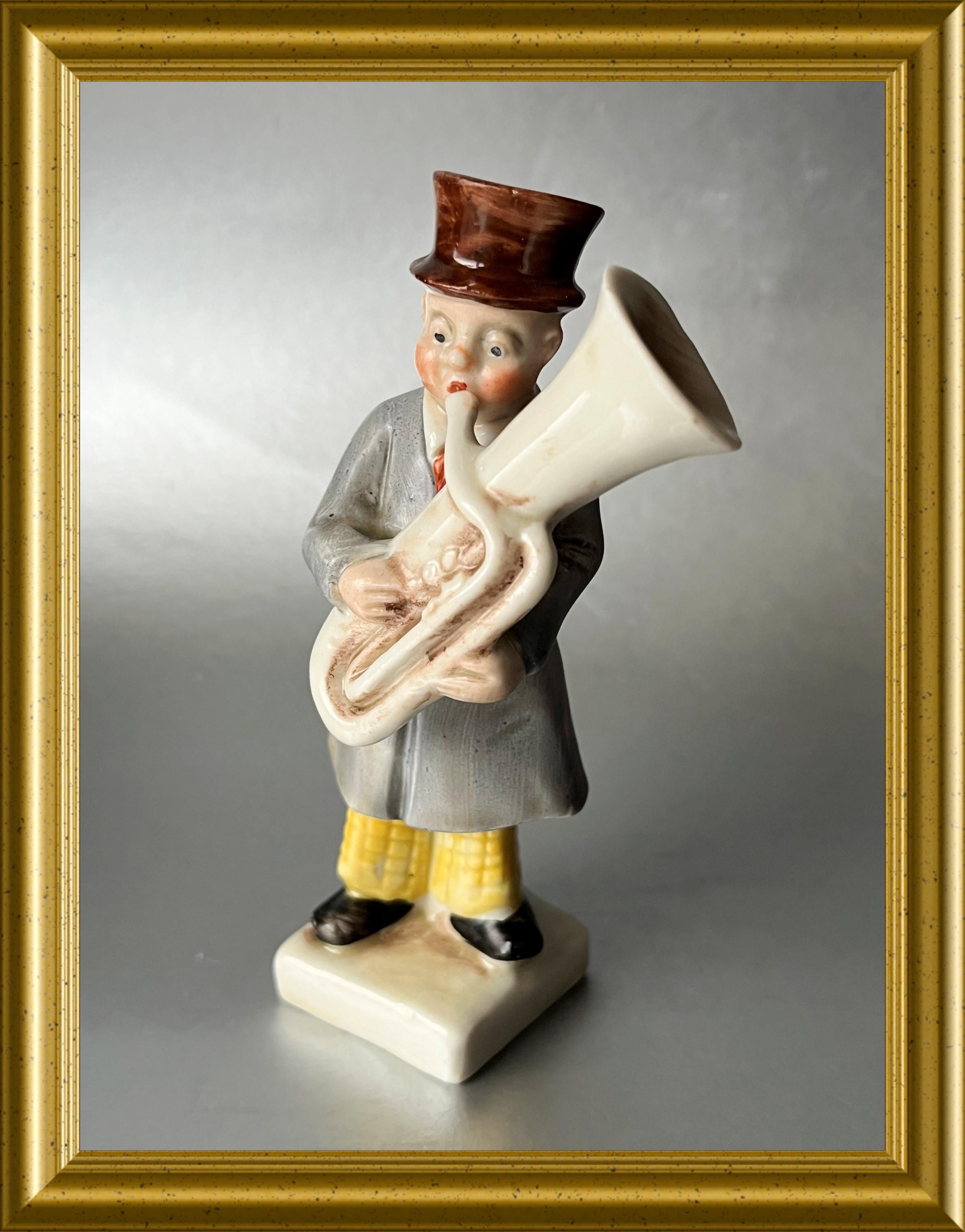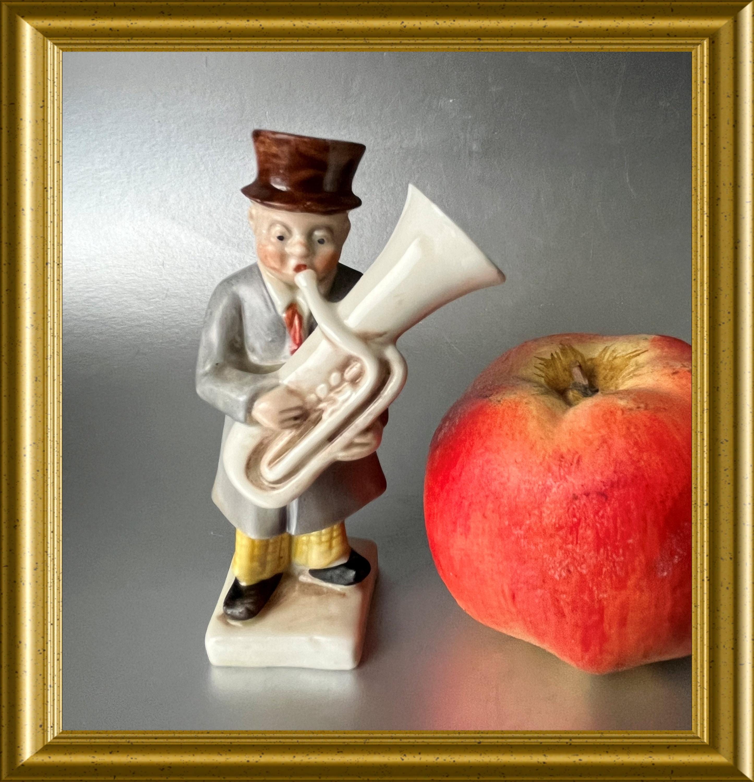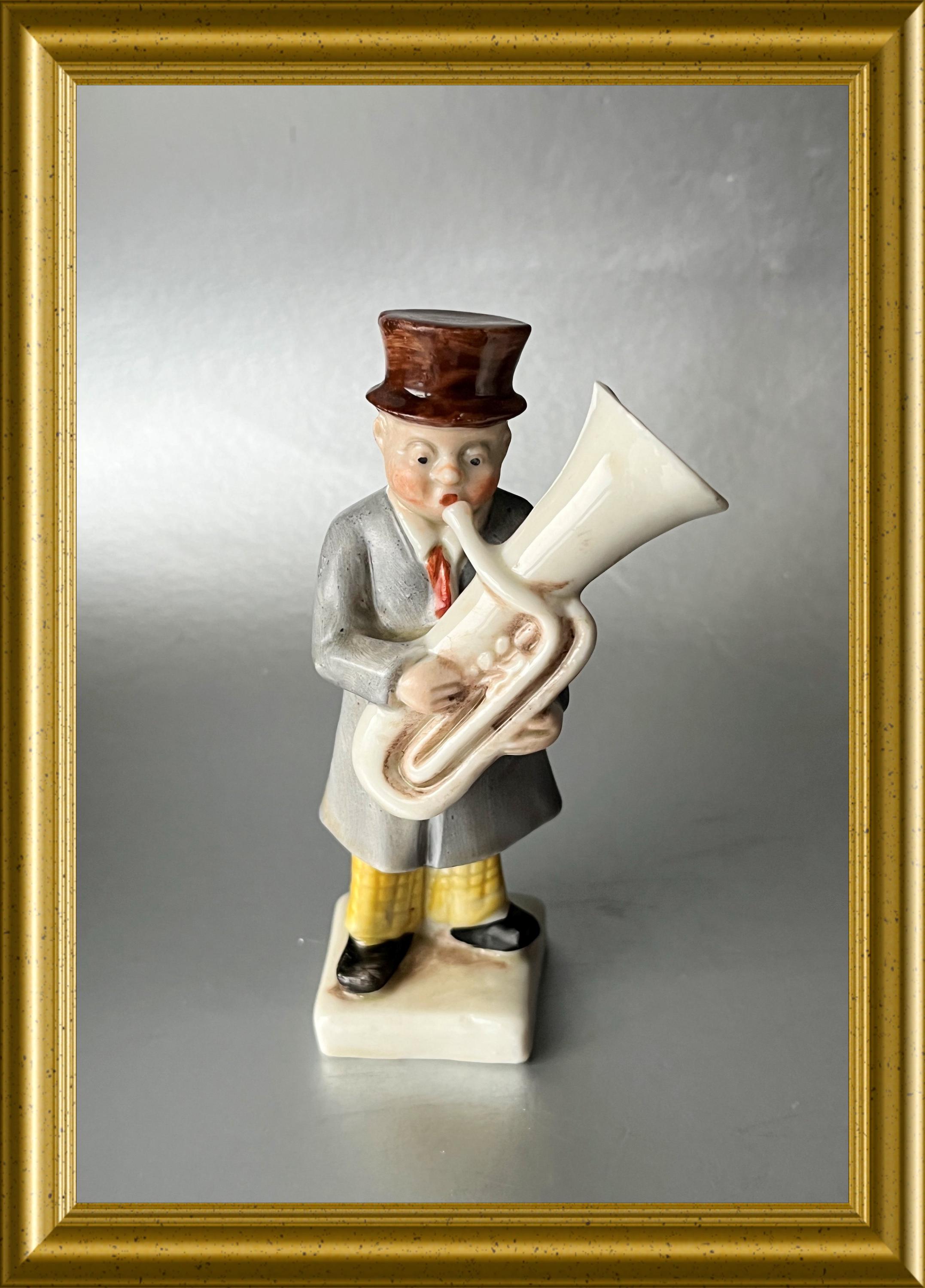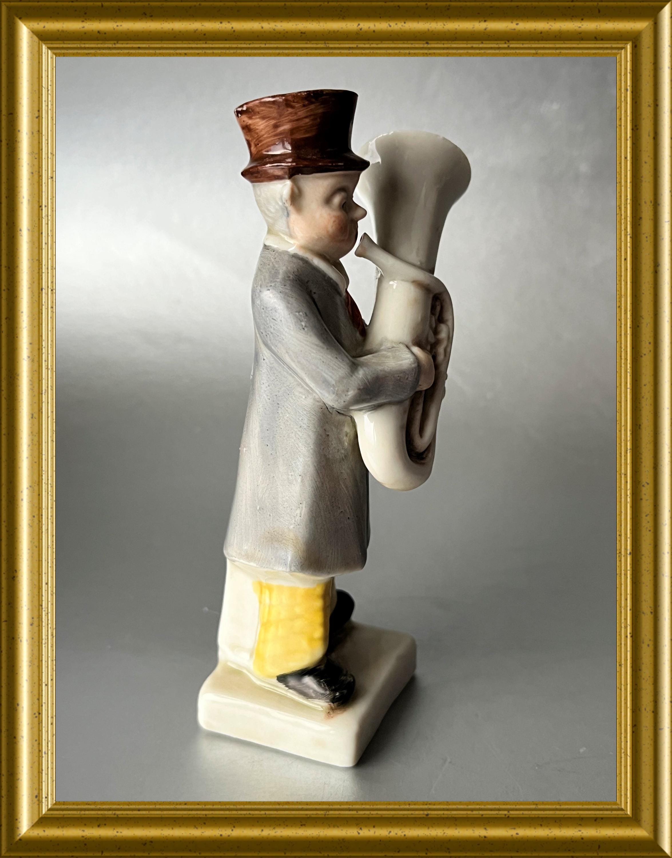 A charming antique German porcelain figurine depicting a man playing a tuba.