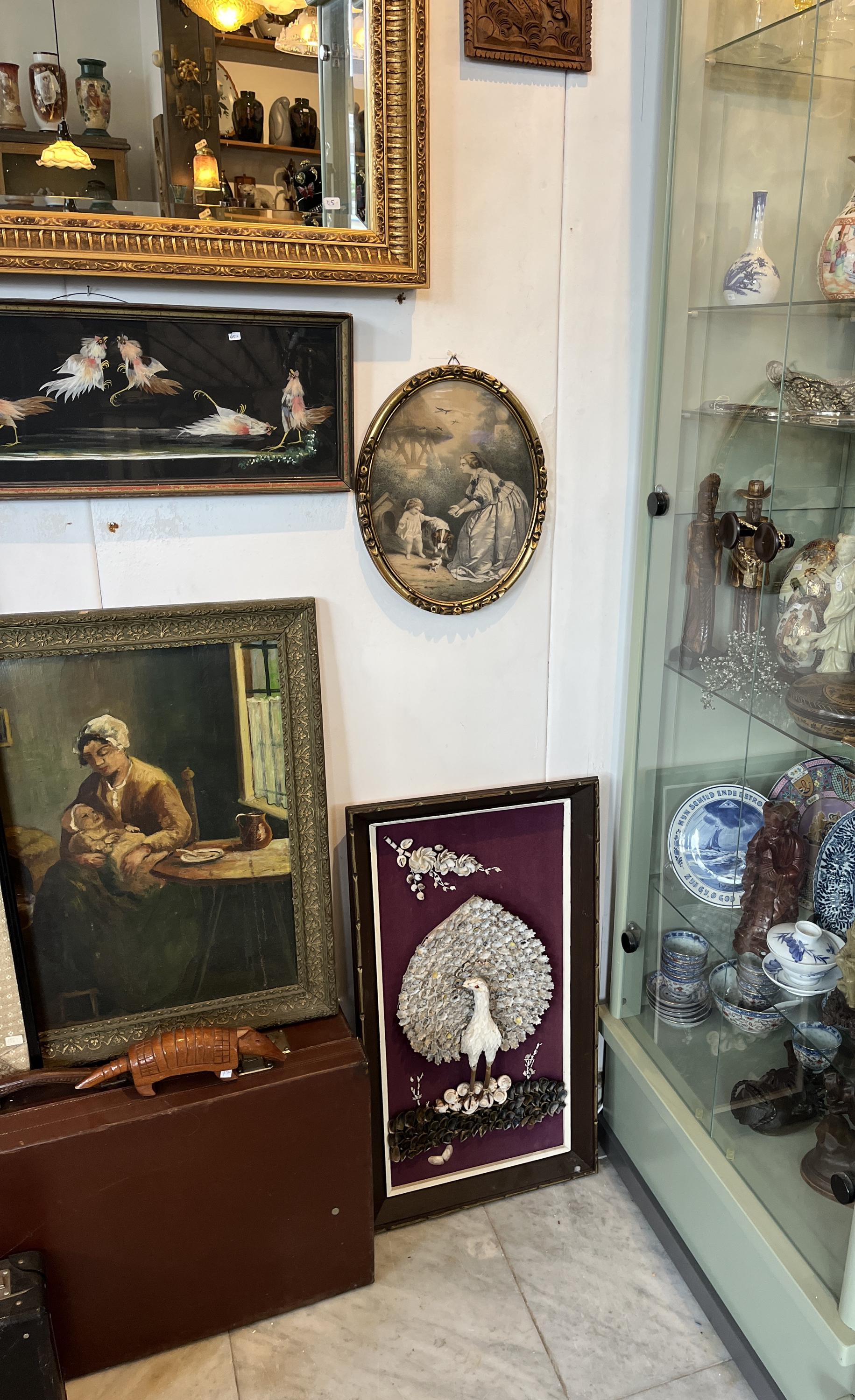 Antique oval frame : child with dog, crinoline lady.