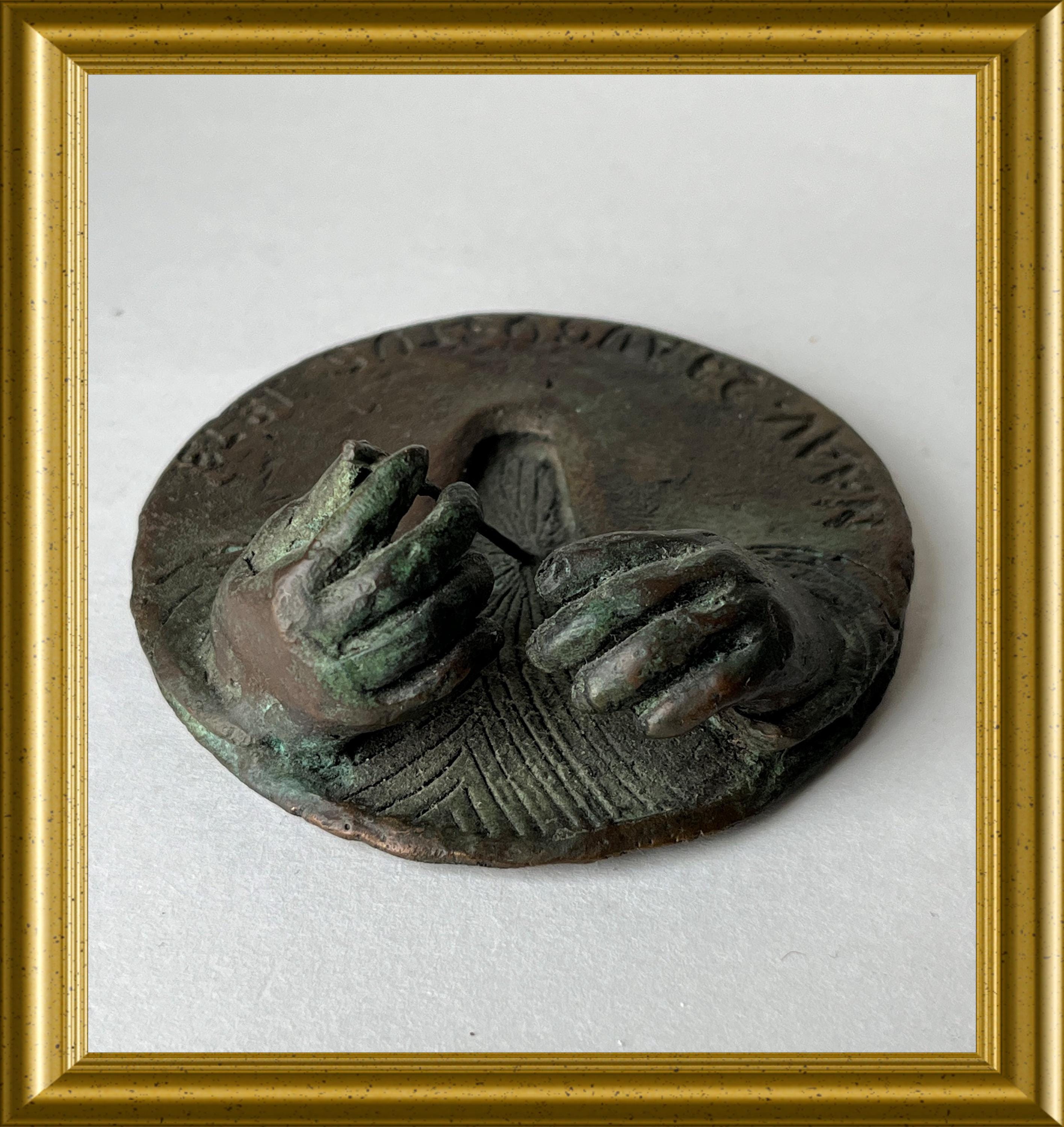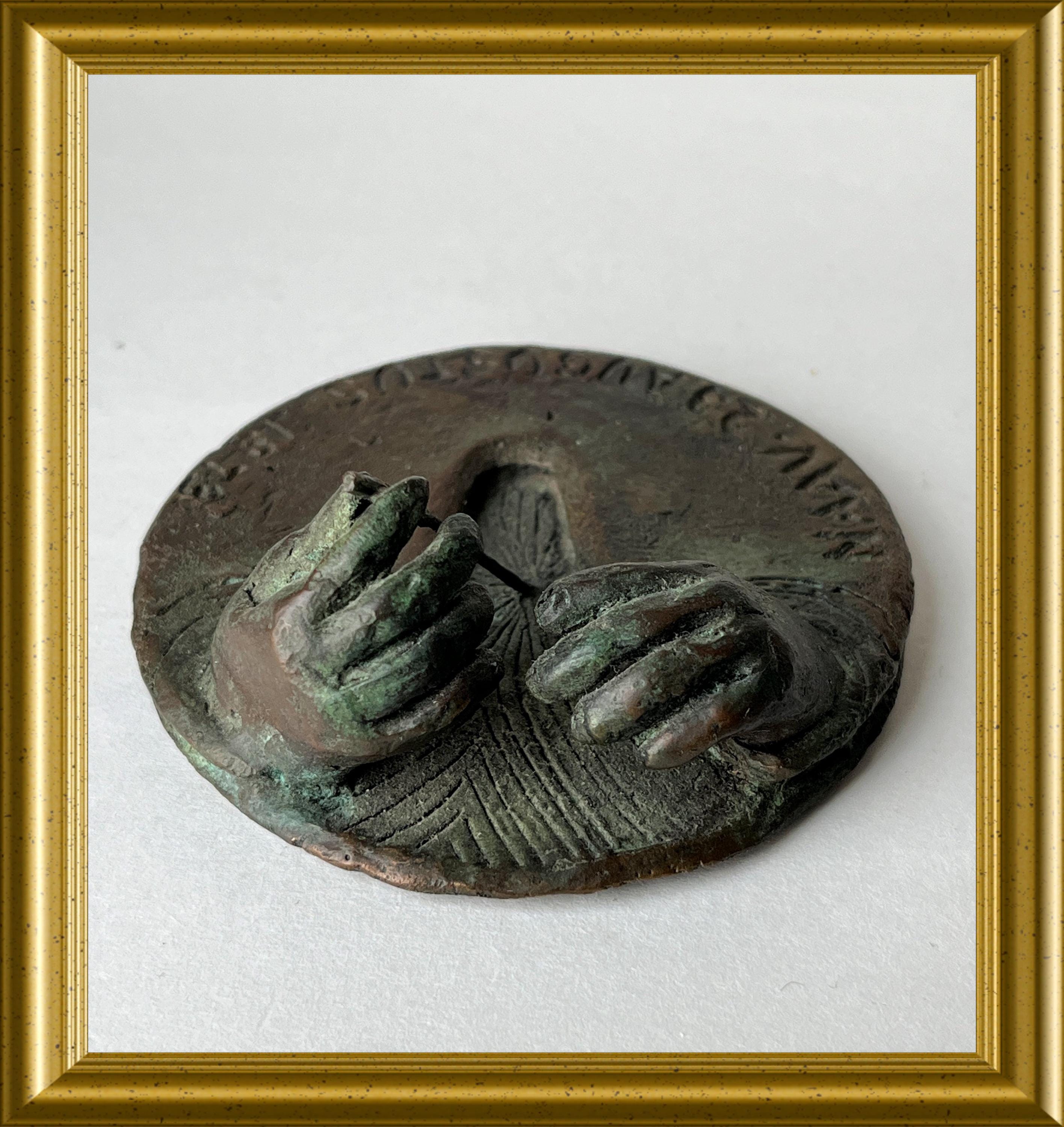 A beautifully crafted bronze plaque featuring hands holding an acupuncture needle.