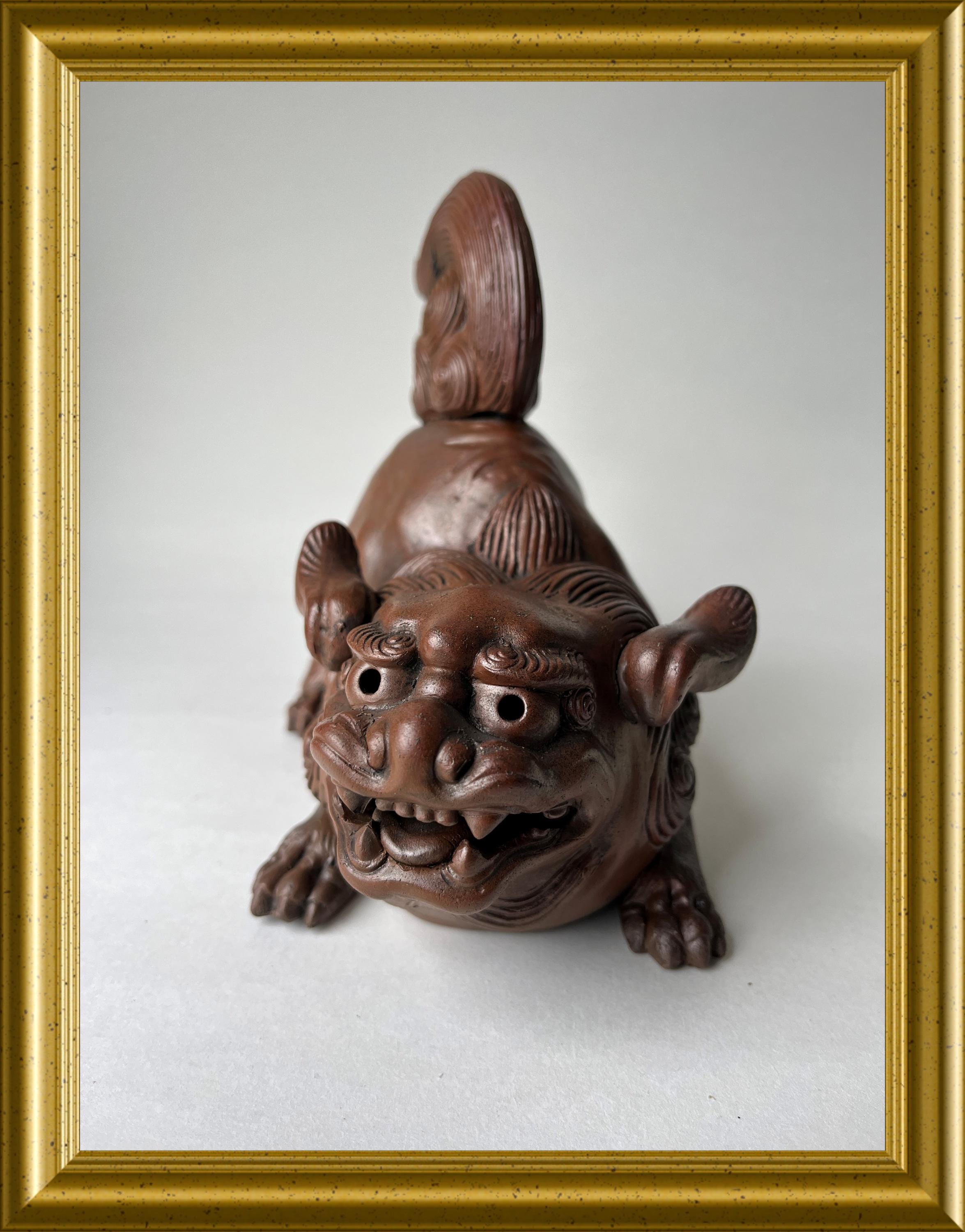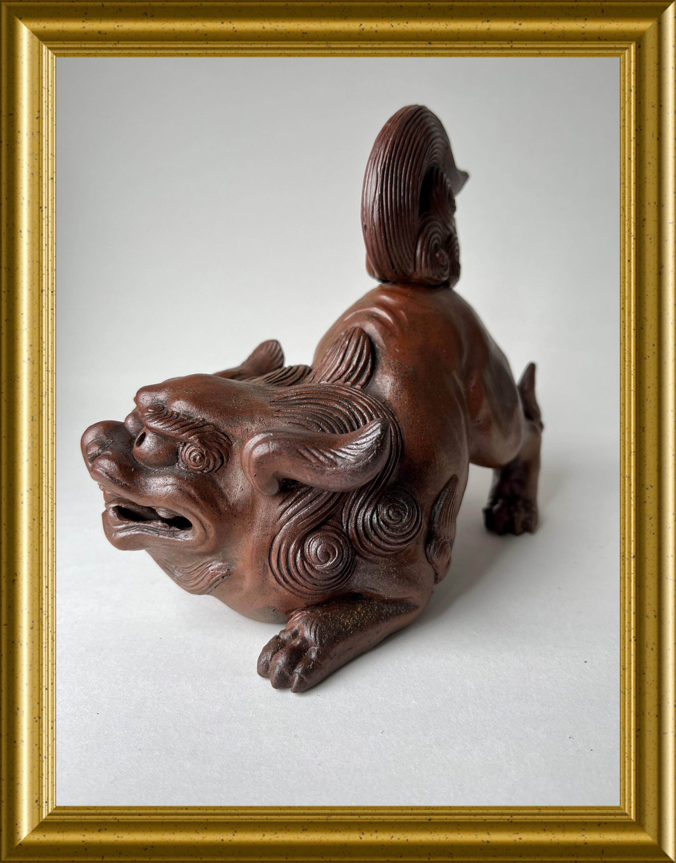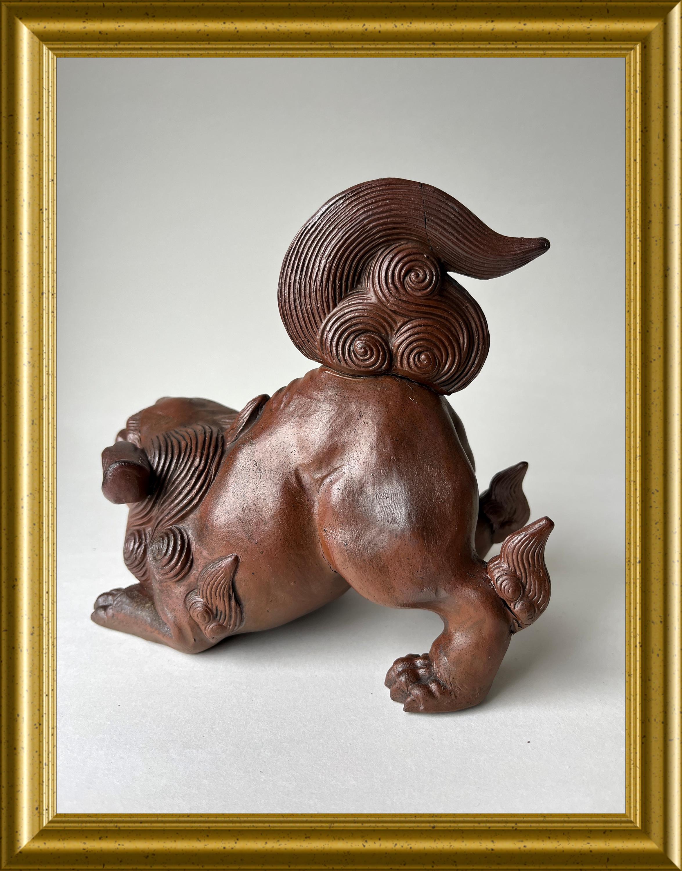 A traditional Japanese Bizen‑ware sculpture depicting a shishi (lion dog), also known as komainu.