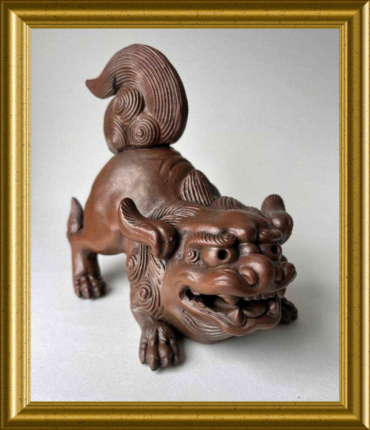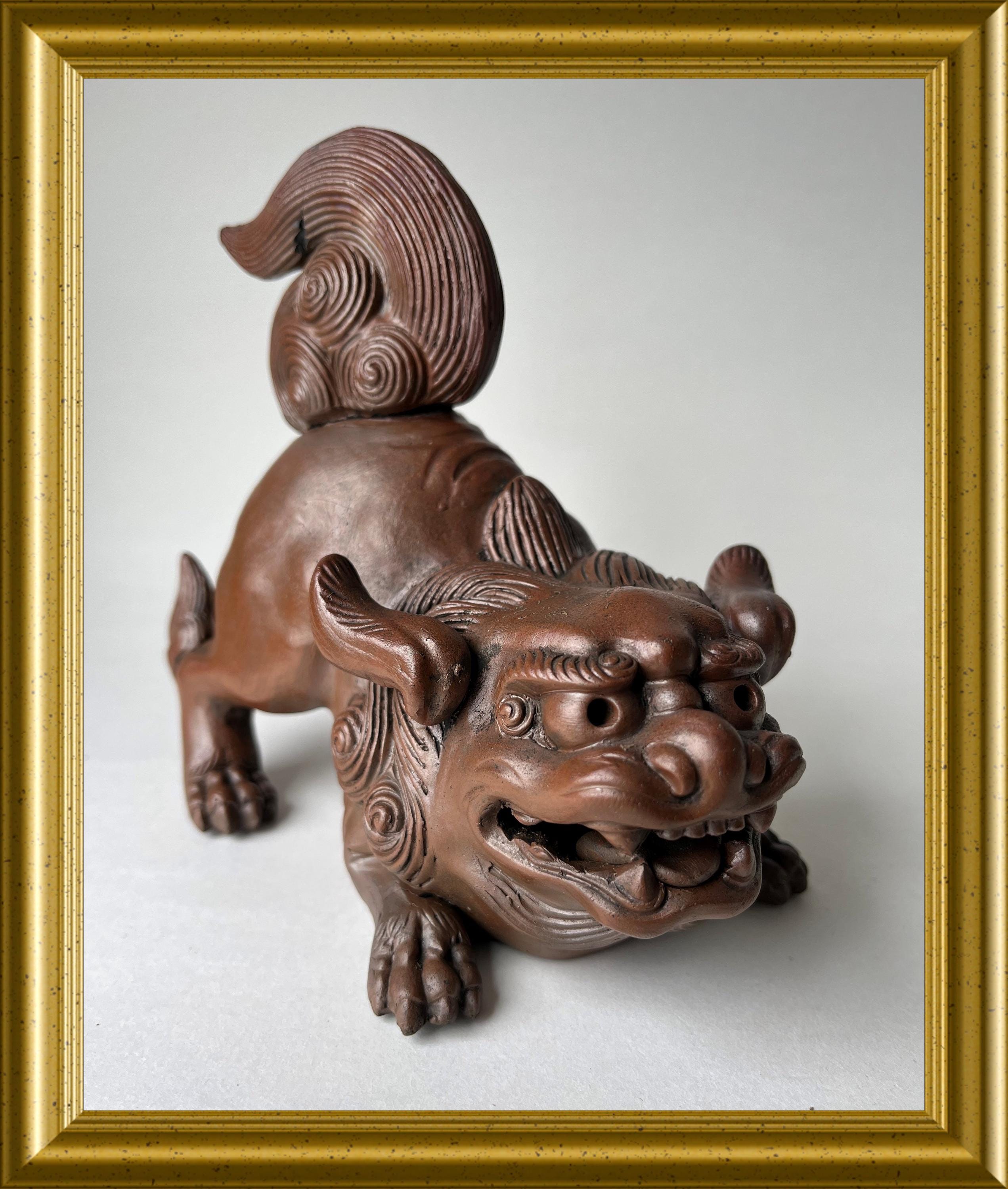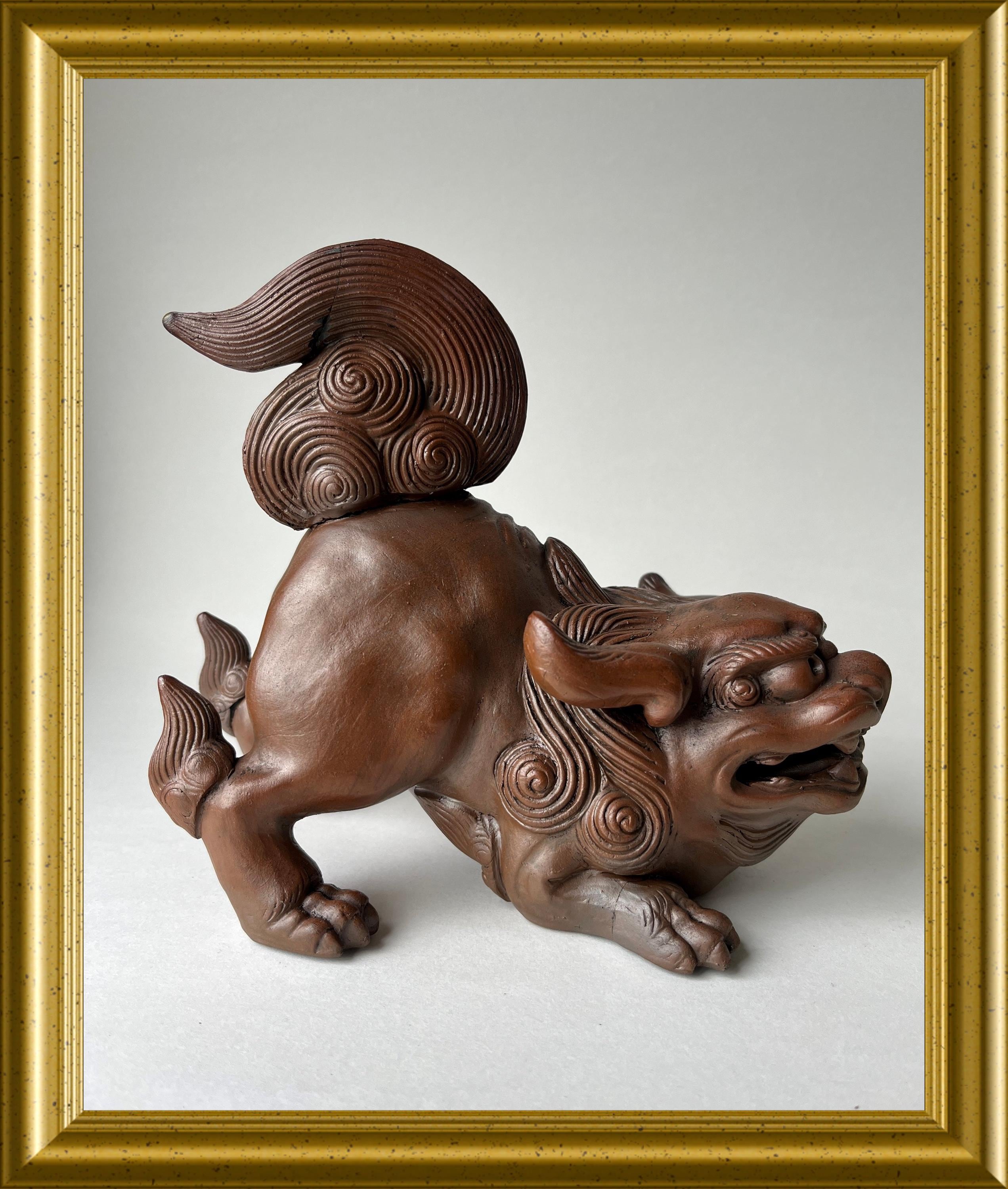 A traditional Japanese Bizen‑ware sculpture depicting a shishi (lion dog), also known as komainu.