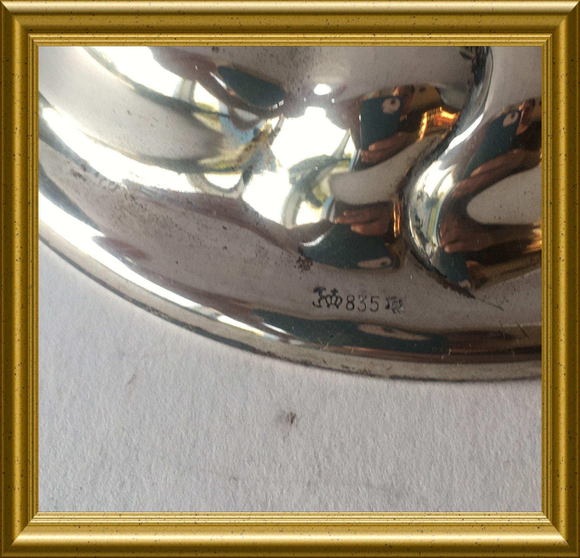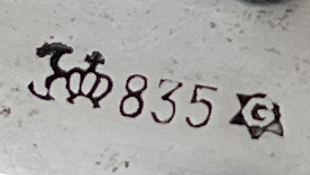 This piece is marked with G in a star, 835, crescent moon, and crown, confirming German silver of the period.