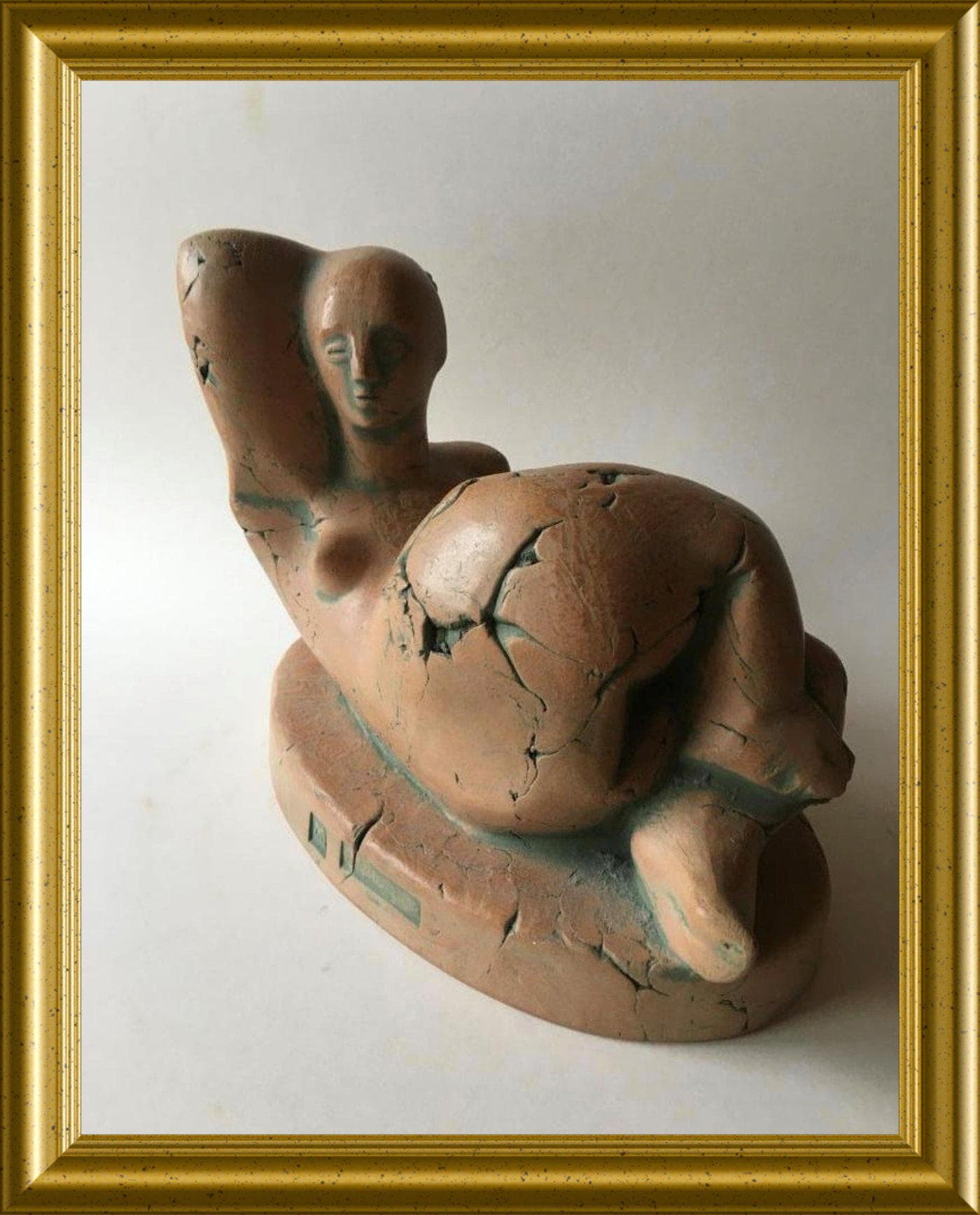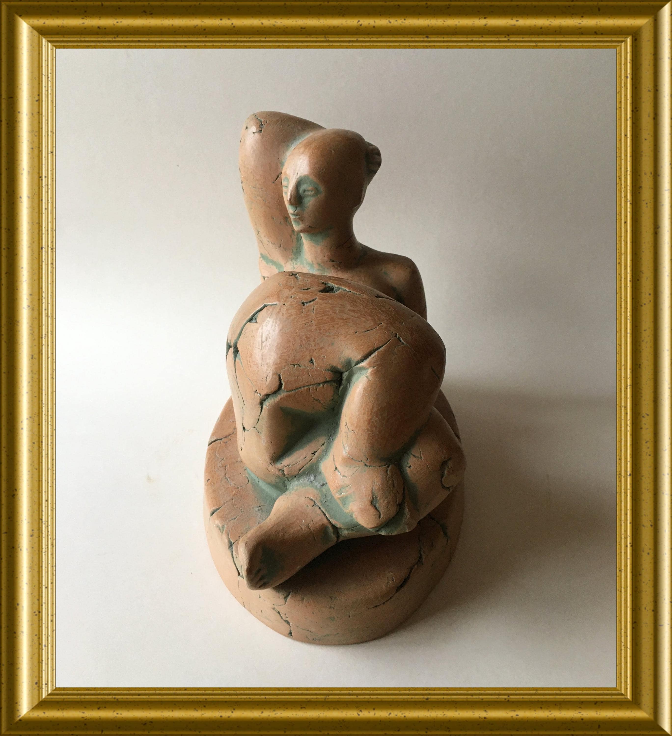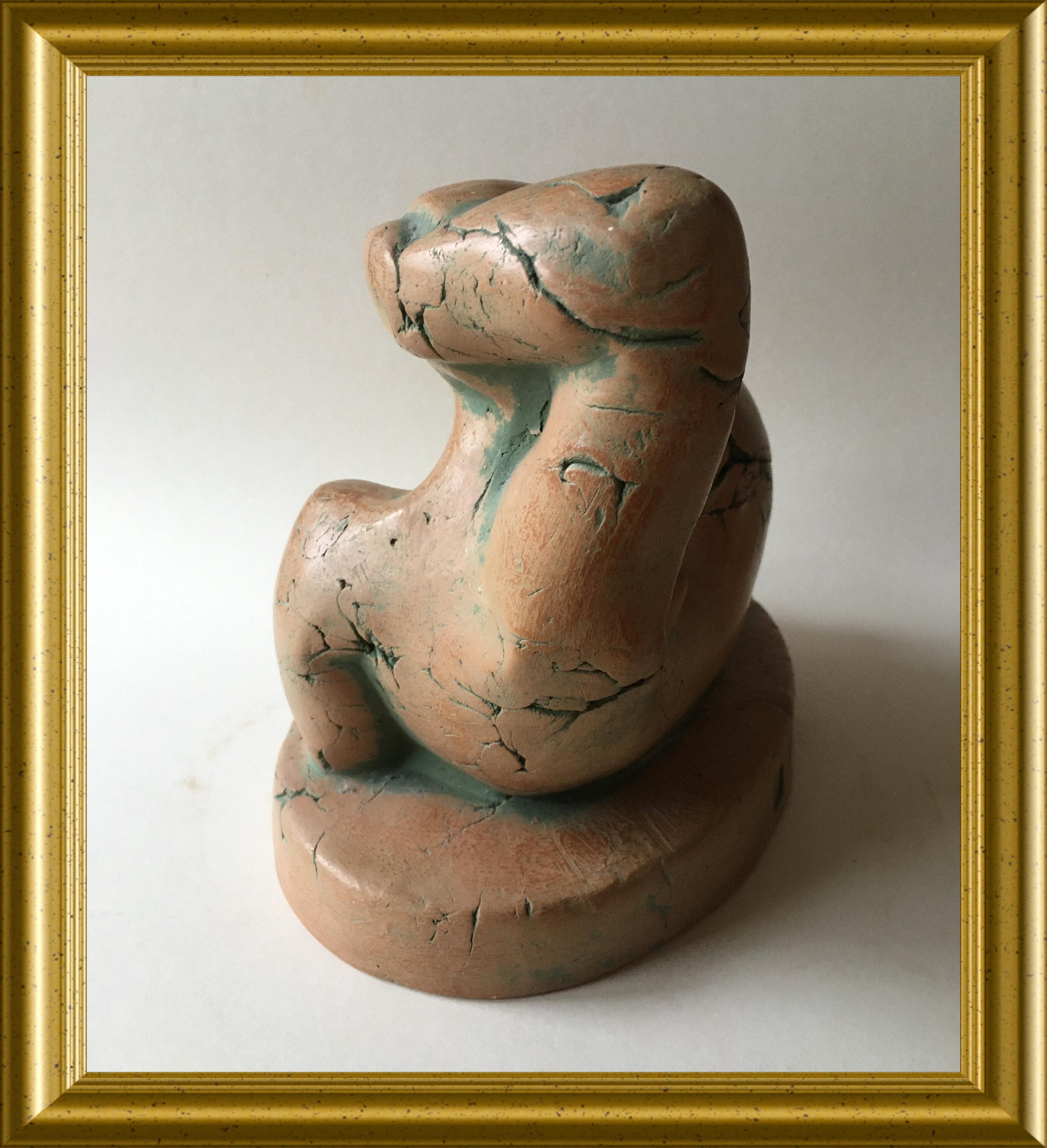 The sculpture has a warm, natural terracotta tone and a textured, handmade surface that highlights the artist’s craftsmanship. It displays elegantly from multiple angles and makes a refined addition to any interior or art collection.