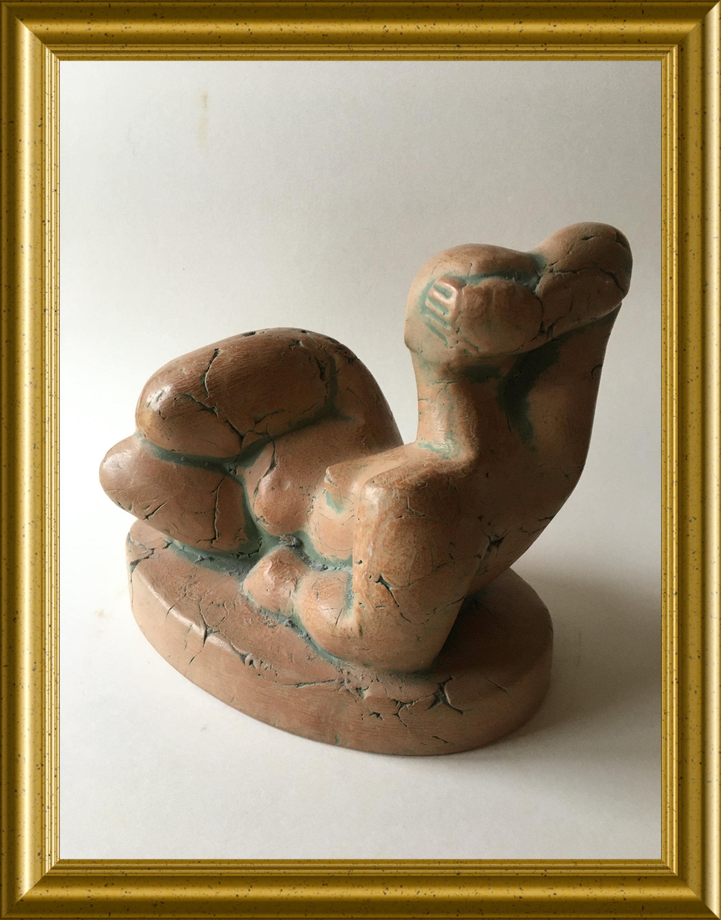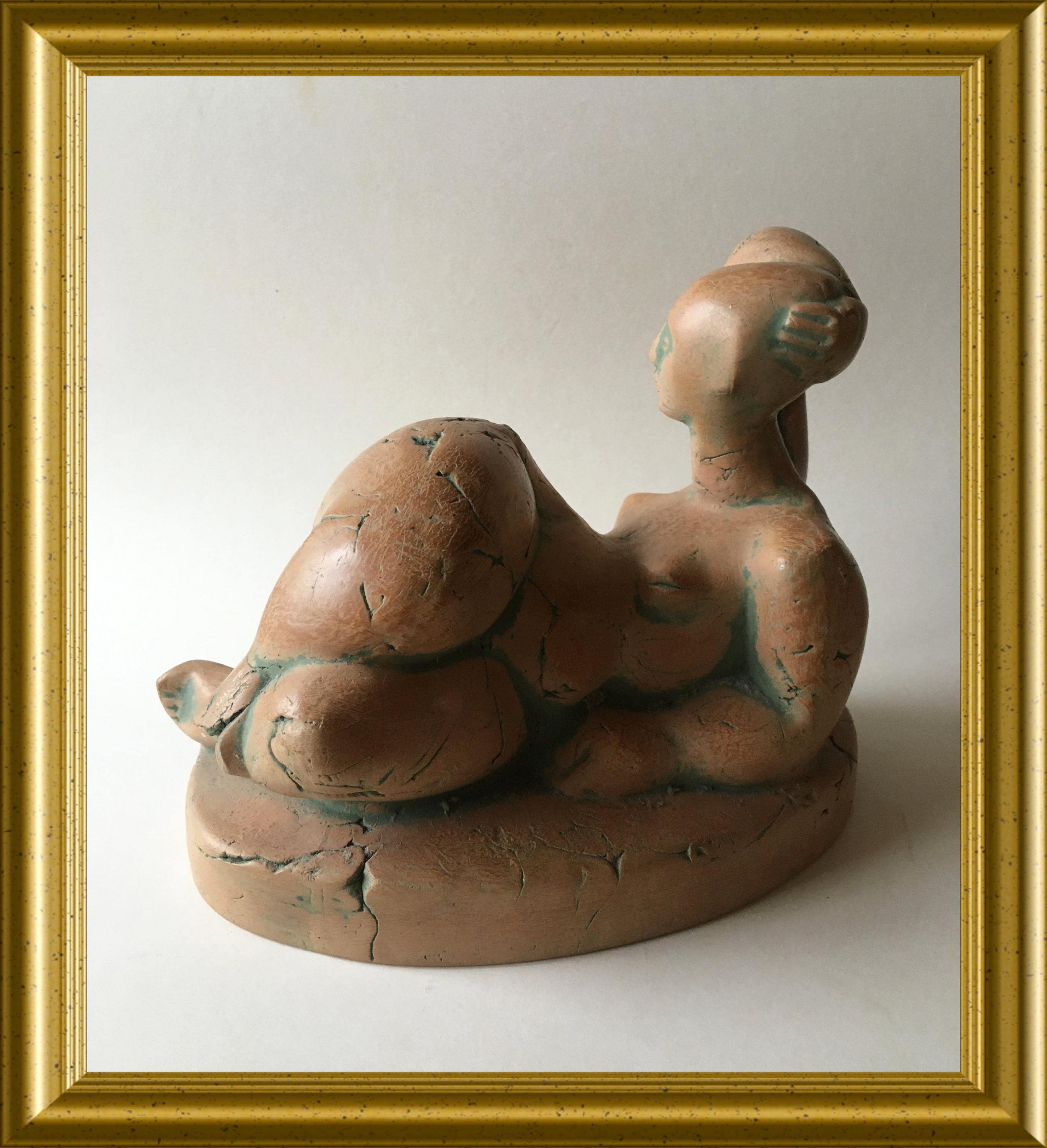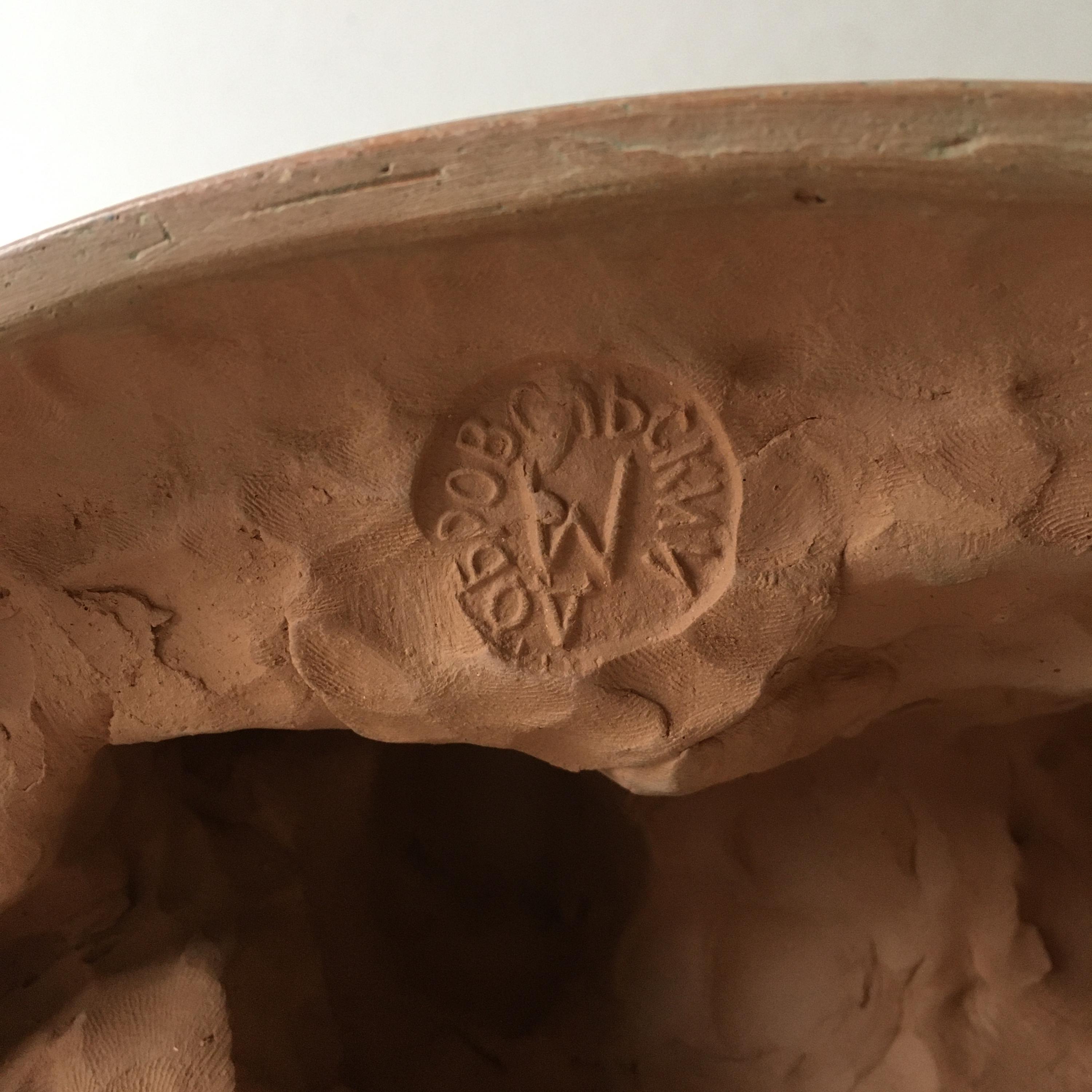 The sculpture has a warm, natural terracotta tone and a textured, handmade surface that highlights the artist’s craftsmanship. It displays elegantly from multiple angles and makes a refined addition to any interior or art collection.