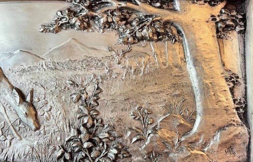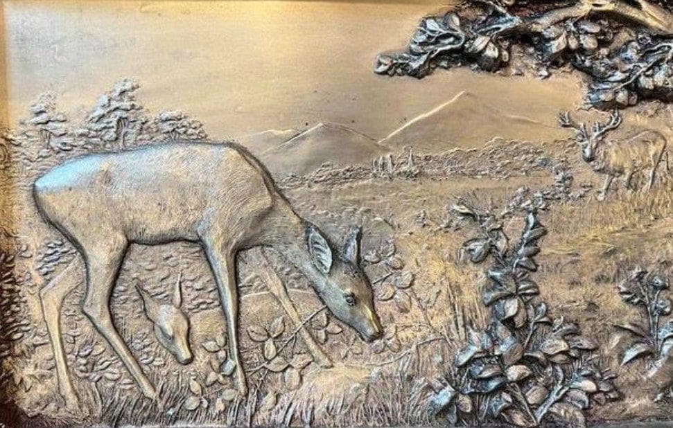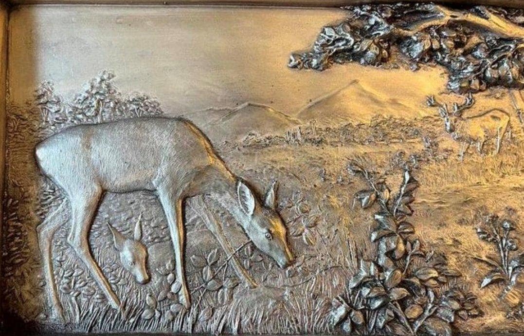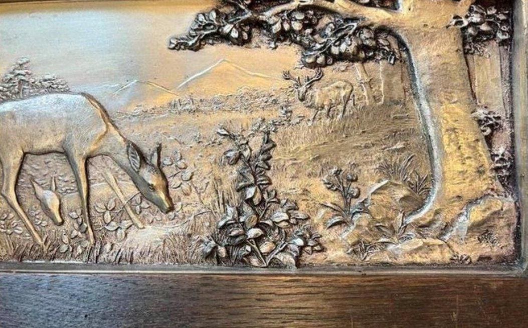 A charming vintage metal relief plaque featuring two deer standing beside a tree.