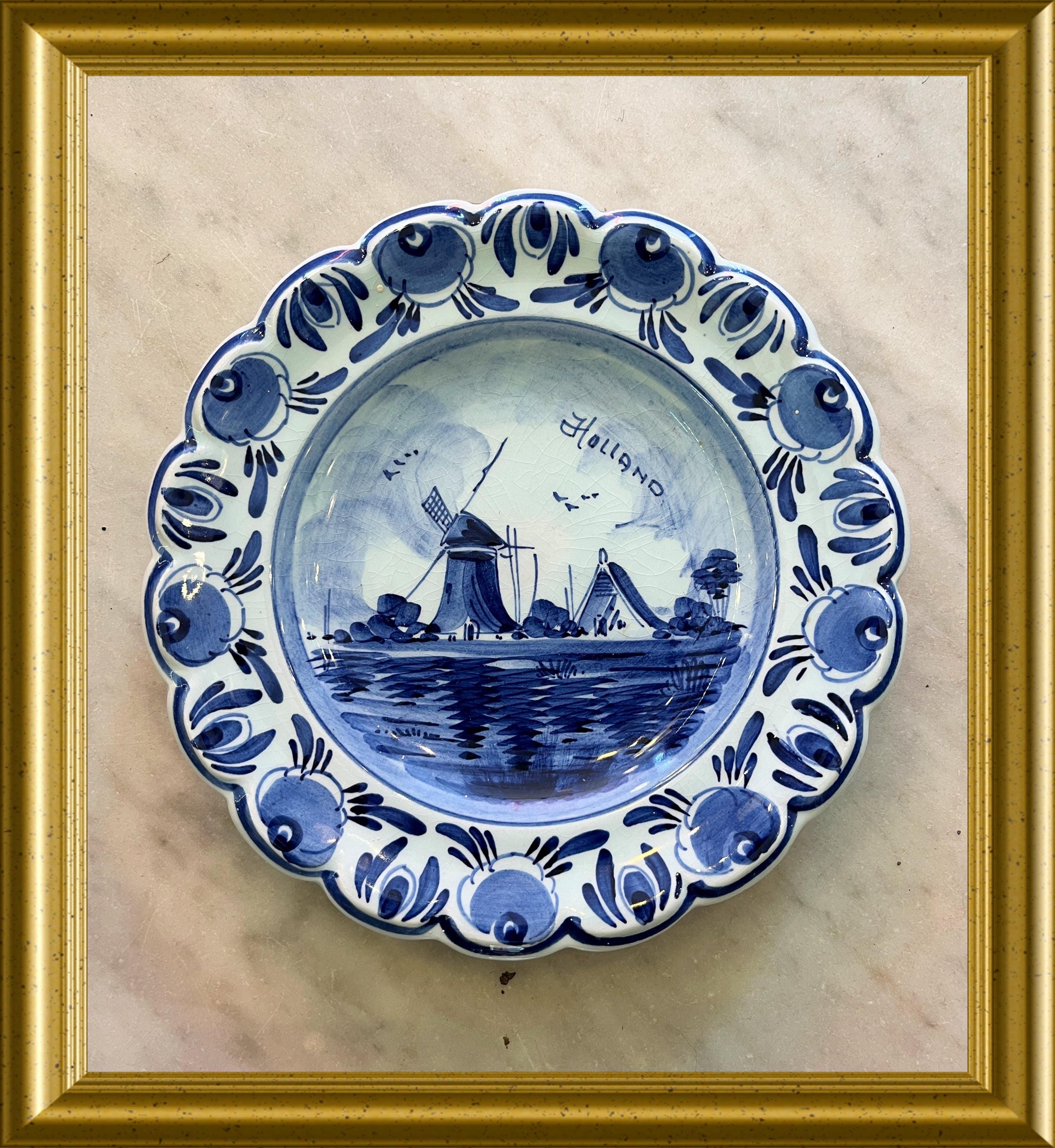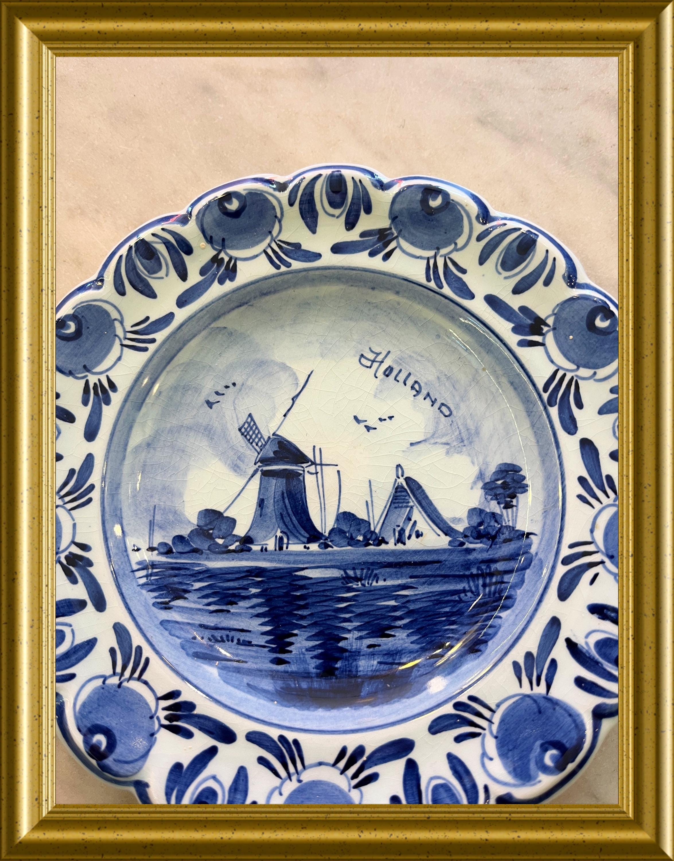 Charming small Delft Blue plate featuring a traditional Dutch windmill scene, fully hand‑painted in classic blue and white.